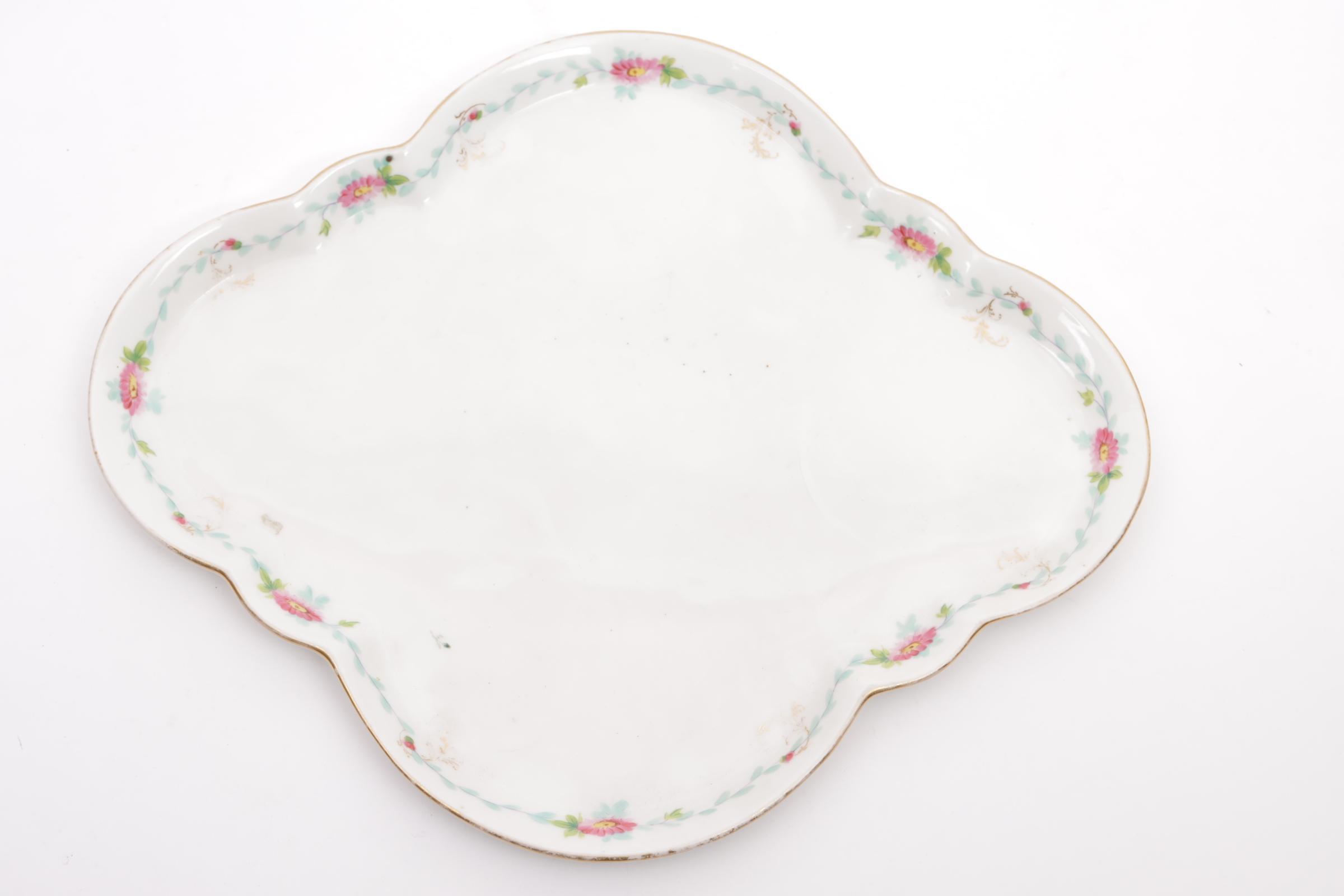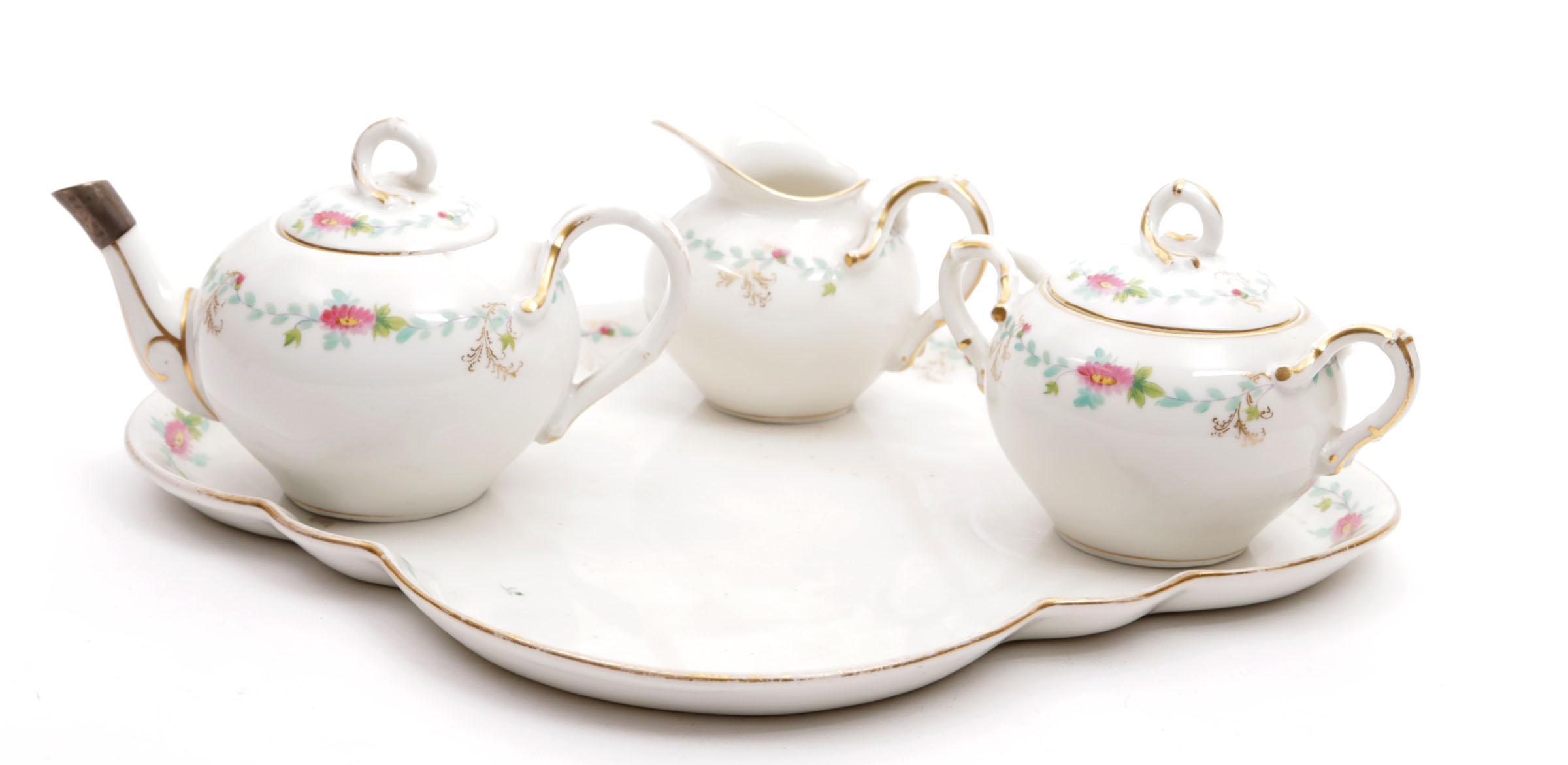 Antieke met bloemen gedecoreerde porseleinen 3-delig theeserviesje op blad