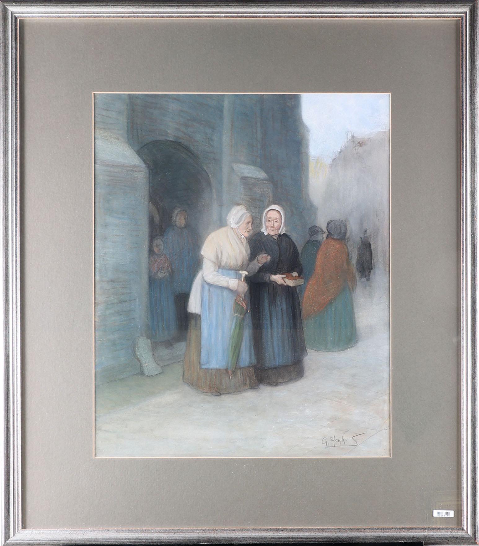 G. Henkes (1844-1927), Zeeuwse dames voor kerk, pasteltekening, 49 x 60 cm.
