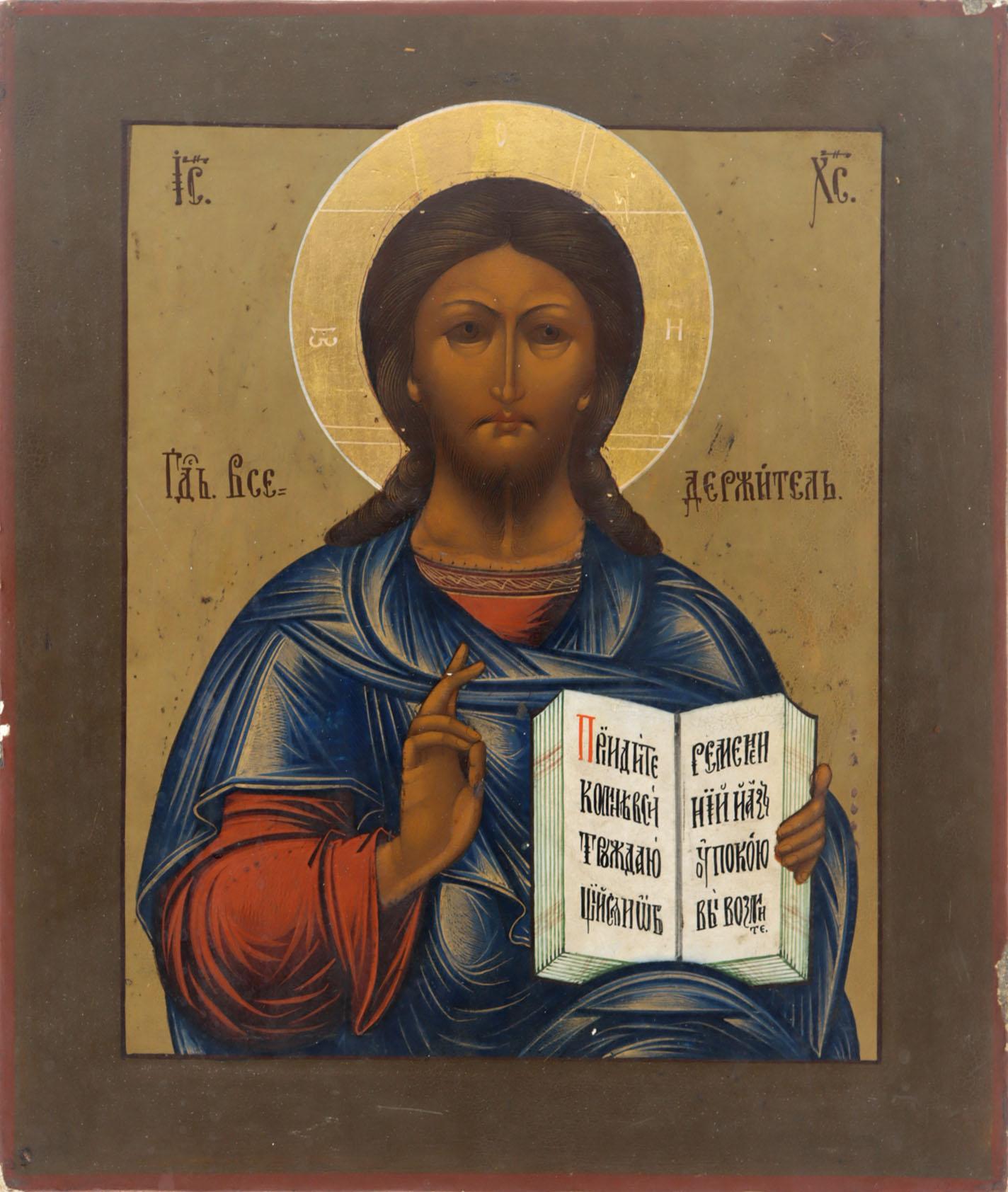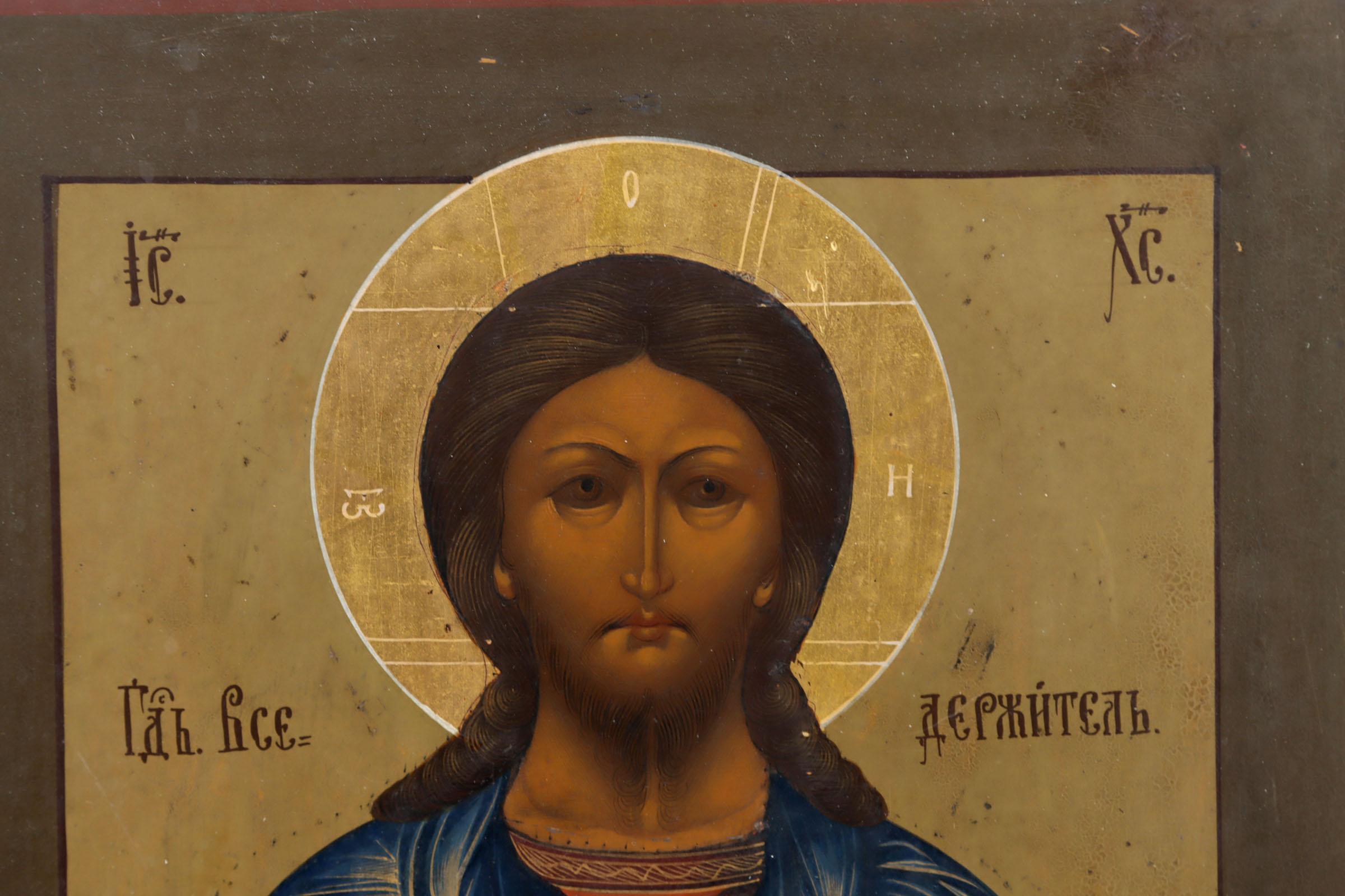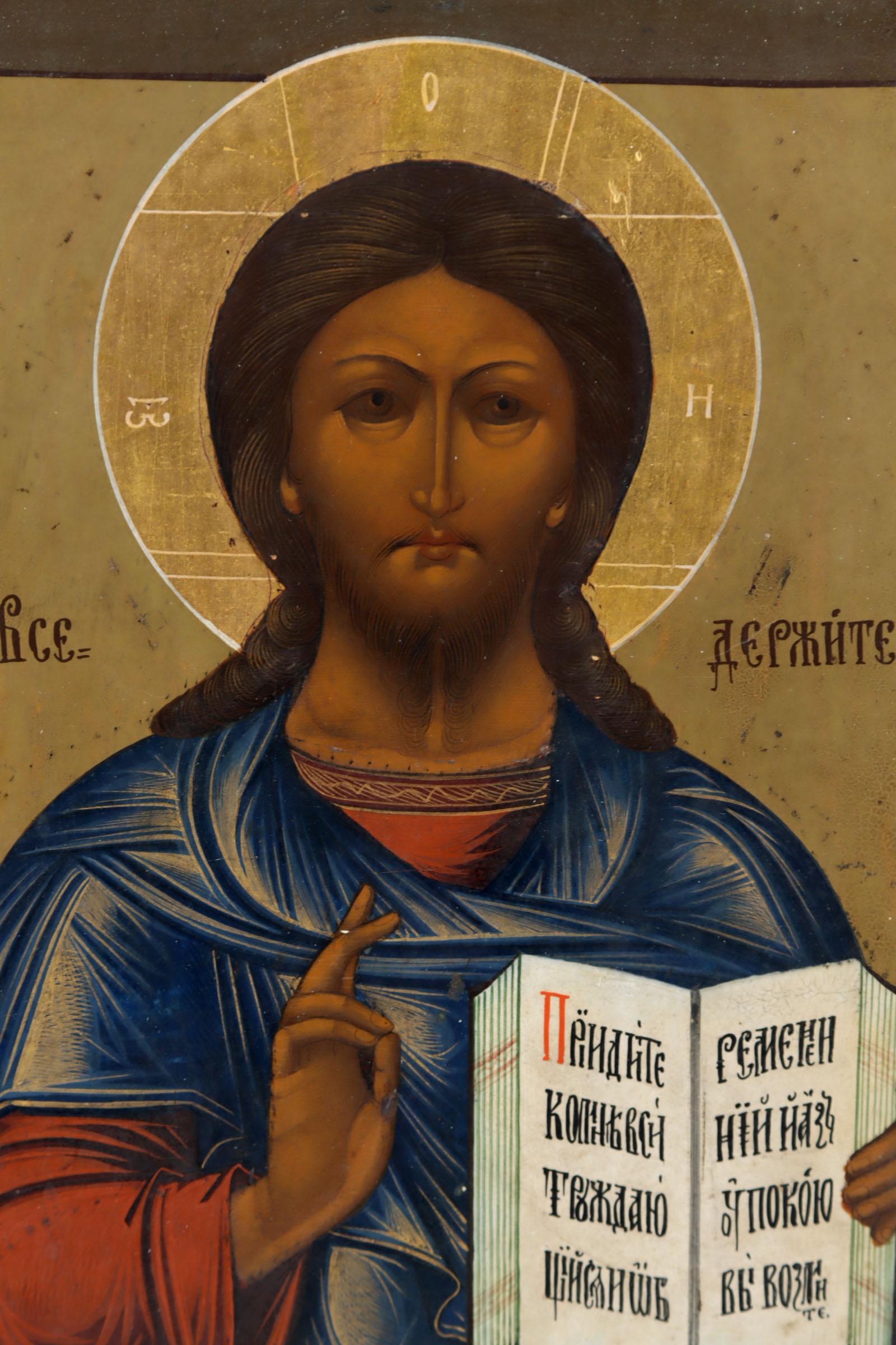 Oud Russisch icoon met voorstelling Christus Pantocrator, 32 x 26,5 cm.