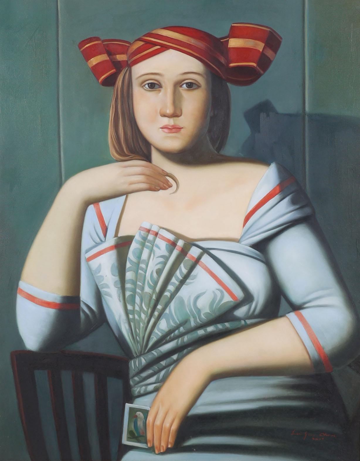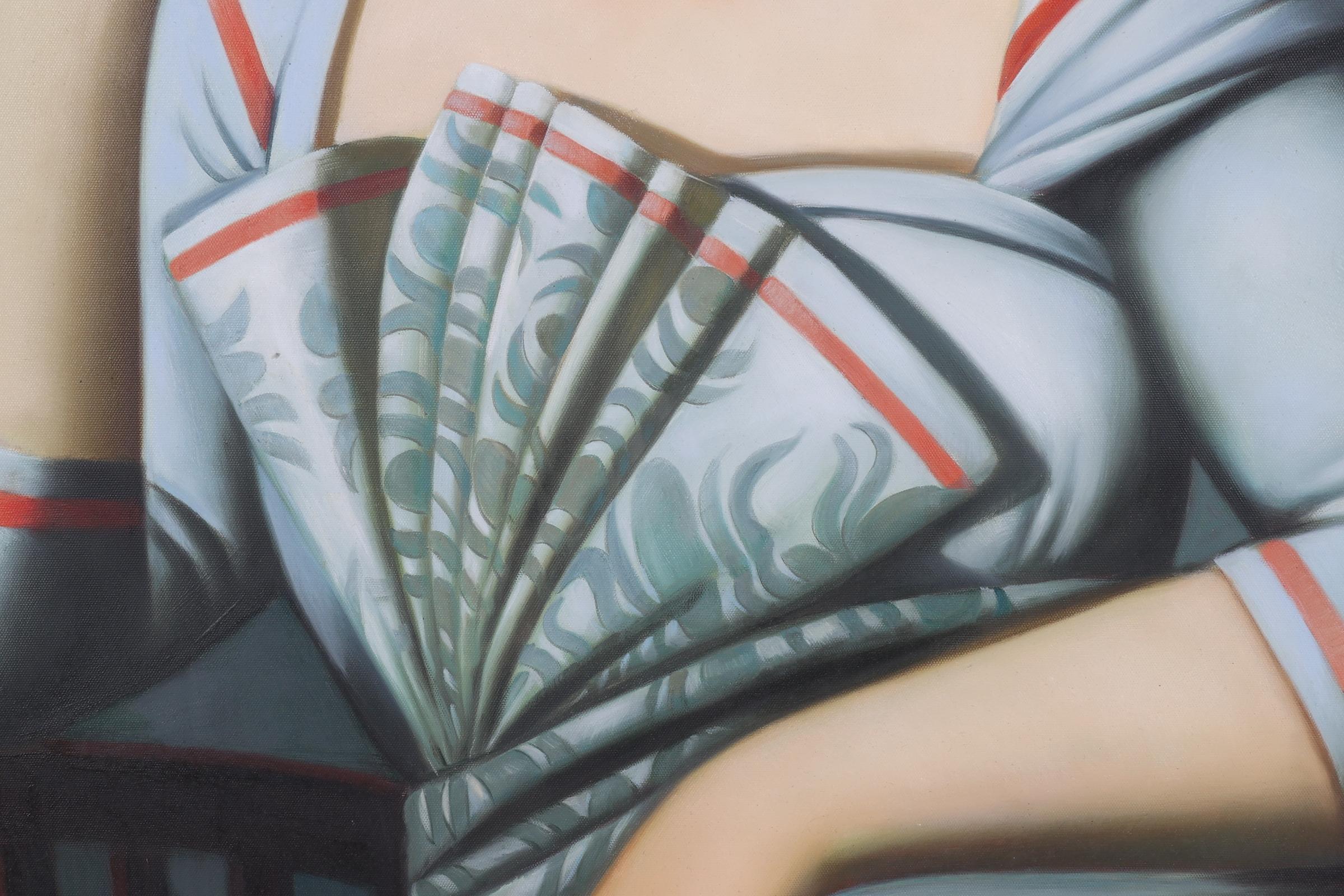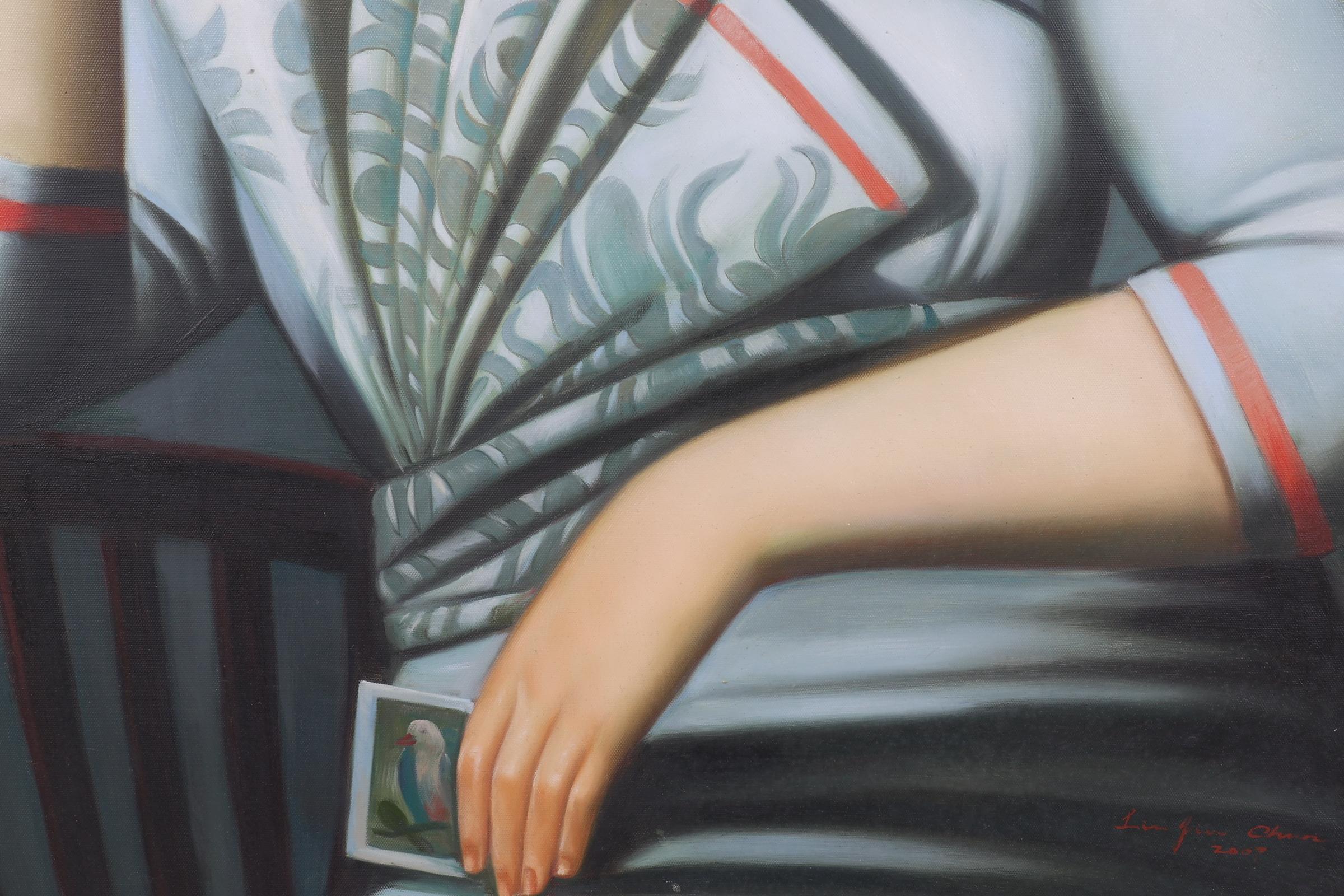 Lin Jin Chun (1983), Dame met waaier, acryl op doek, 79 x 99 cm.