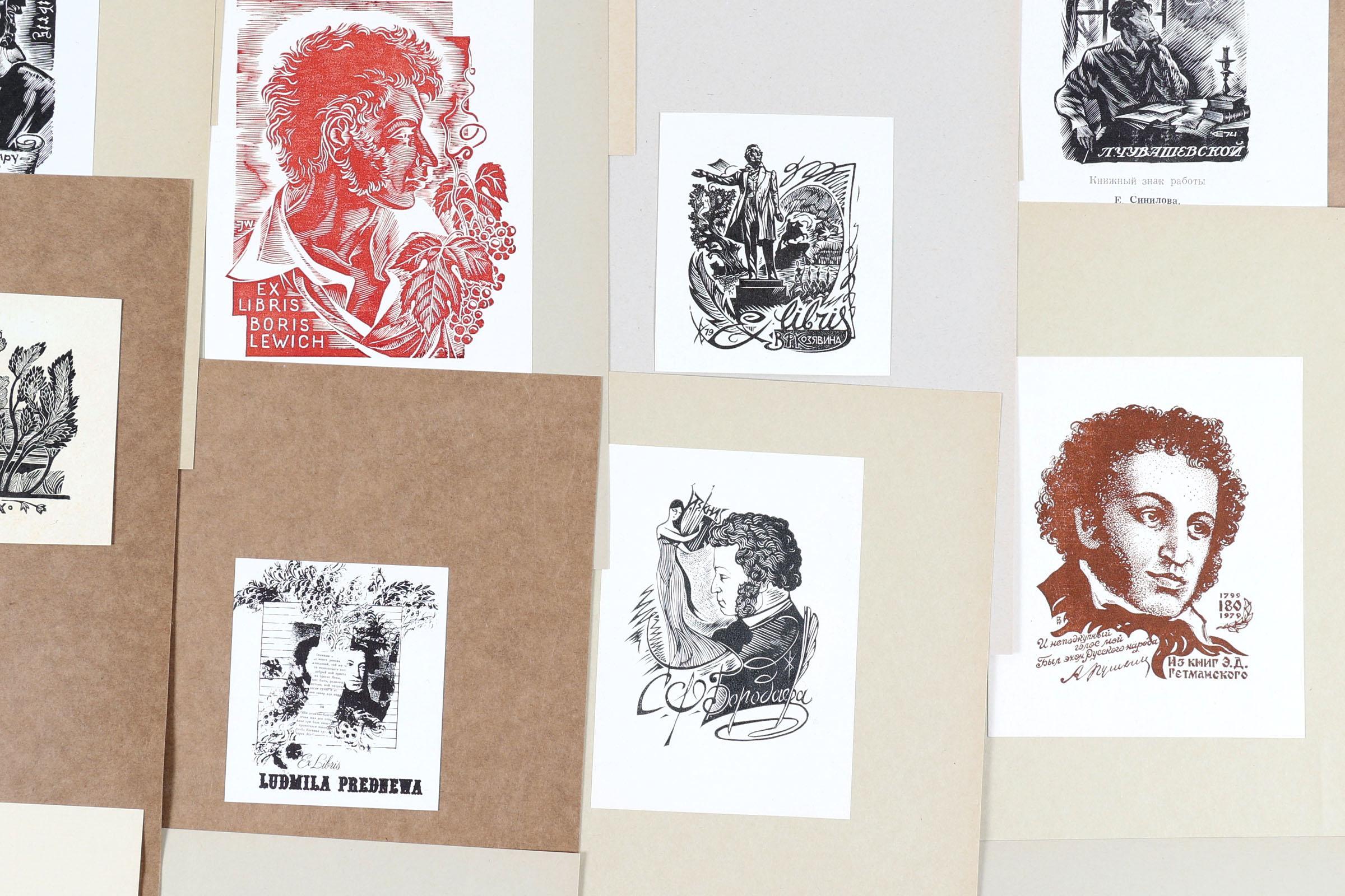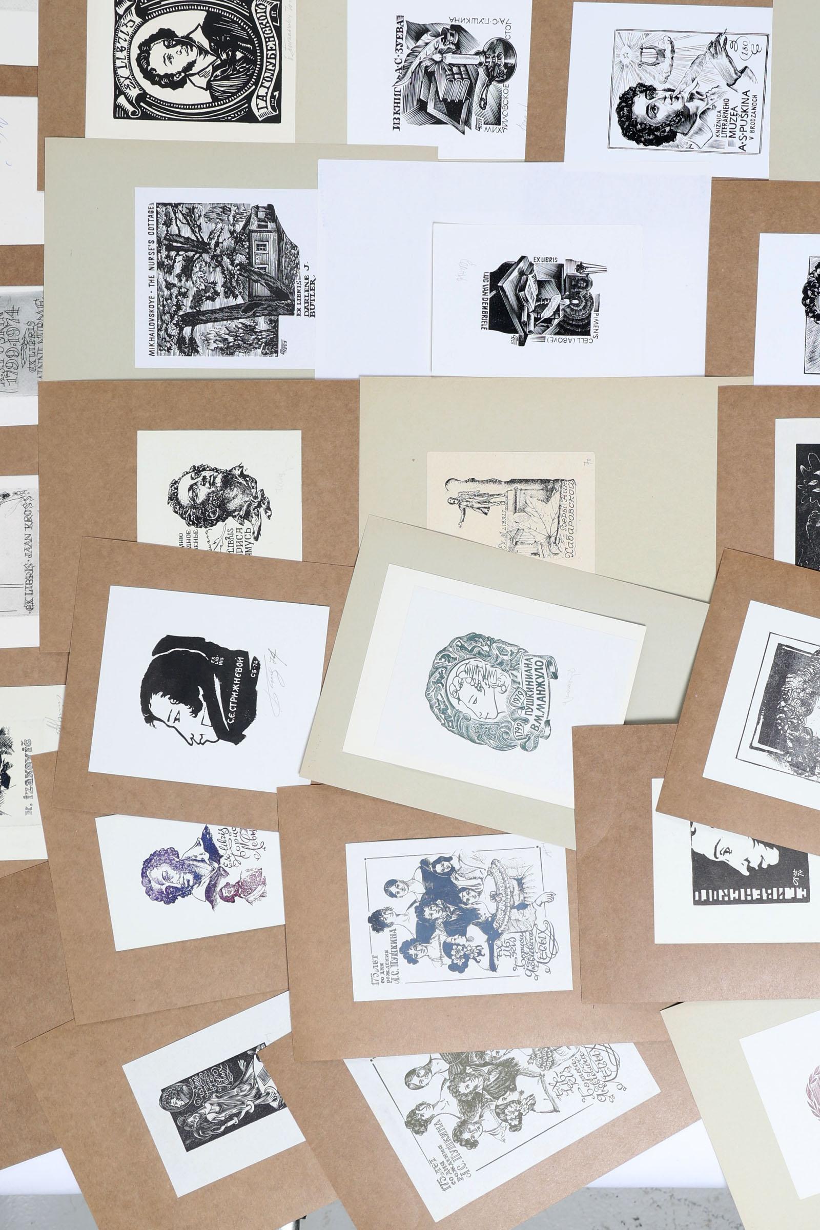 collectie plm. 135 exlibris, thema: Poesjkin. Hoofdzakelijuk Russische kunstenaars, deels gesigneerd, opgeplakt. Plm. 20 x diepdruk, rest hoogdruk / vlakdruk. Kunstenaars o.a. Okas, Spronk, Stanishevski, Vereschagin, Zabirochin, Sinilov, Terechov, Stetchnev, Sverev.
