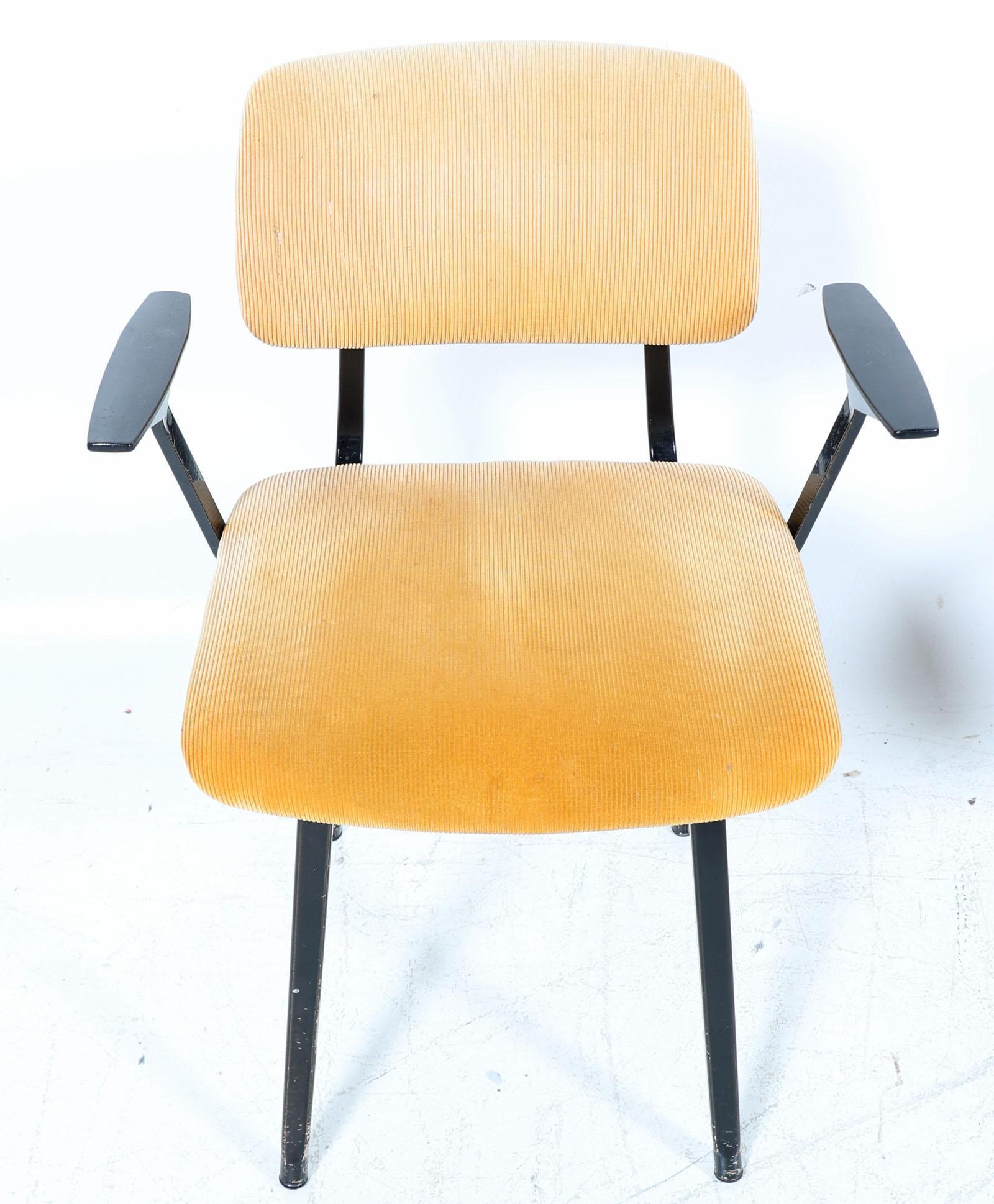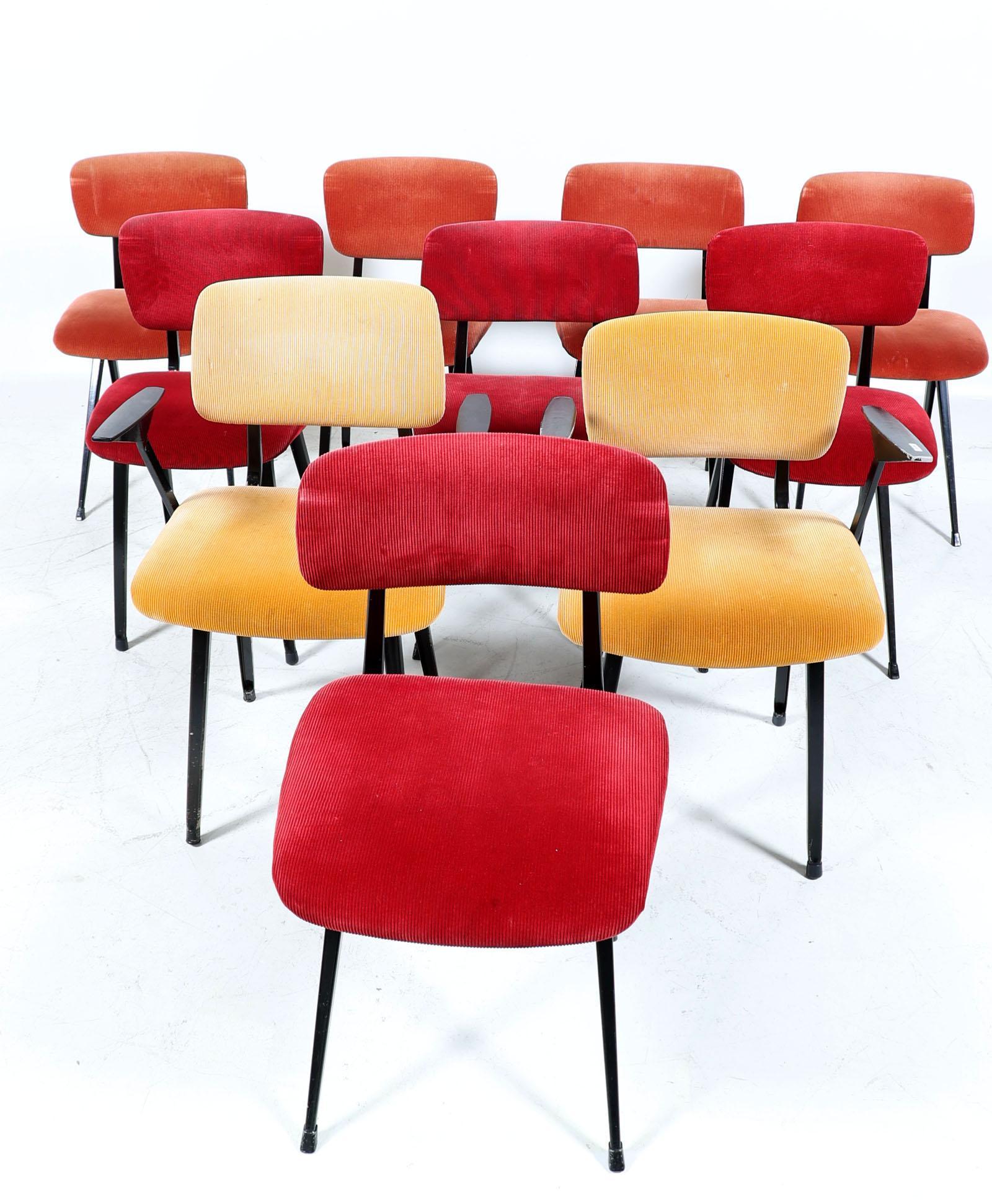 Ahrend, set van 10 vintage stoelen waarvan 2 met armleuning, diverse kleuren bekleding en 2 diverse onderstellen