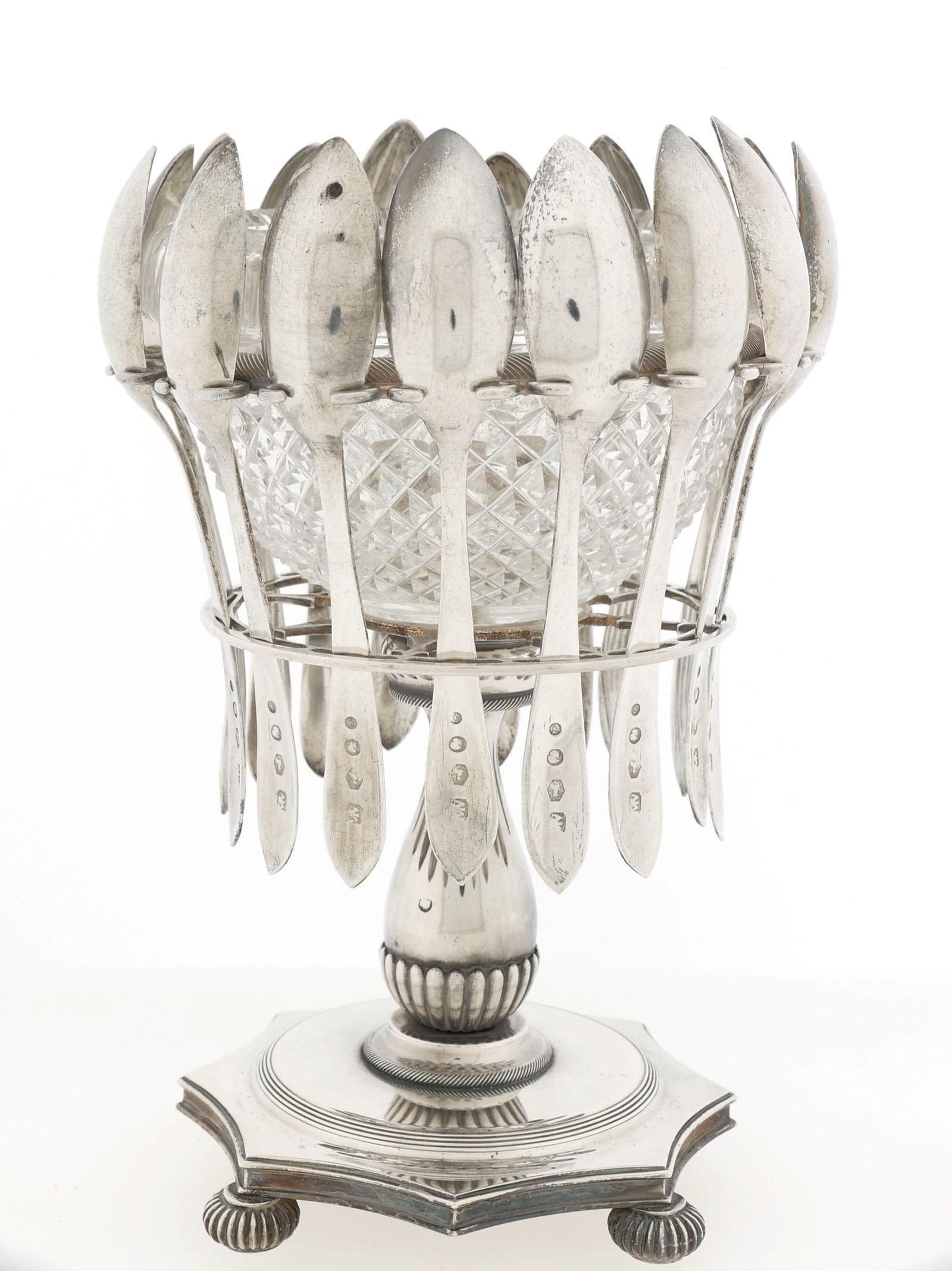Theodorus Gerardus Bentvelt, Amsterdam 1812-1815, zilveren Empire met kristallen suikerbak met lepelhanger waaraan zestien 2e gehalte zilveren Empire koffielepels