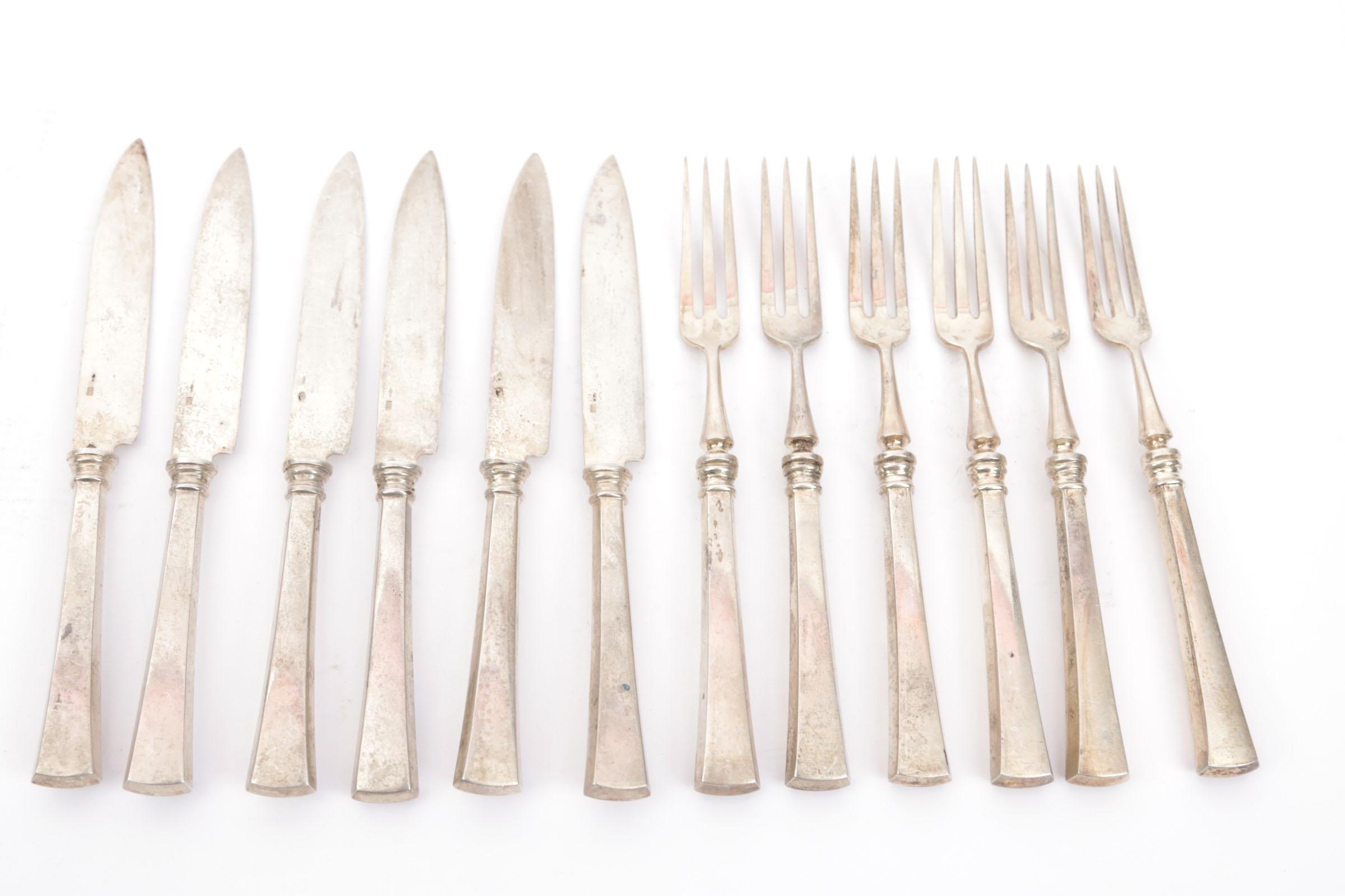 Zes 2e gehalte zilveren fruitmesjes en zes 2e gehalte zilveren vorken, 343 gram