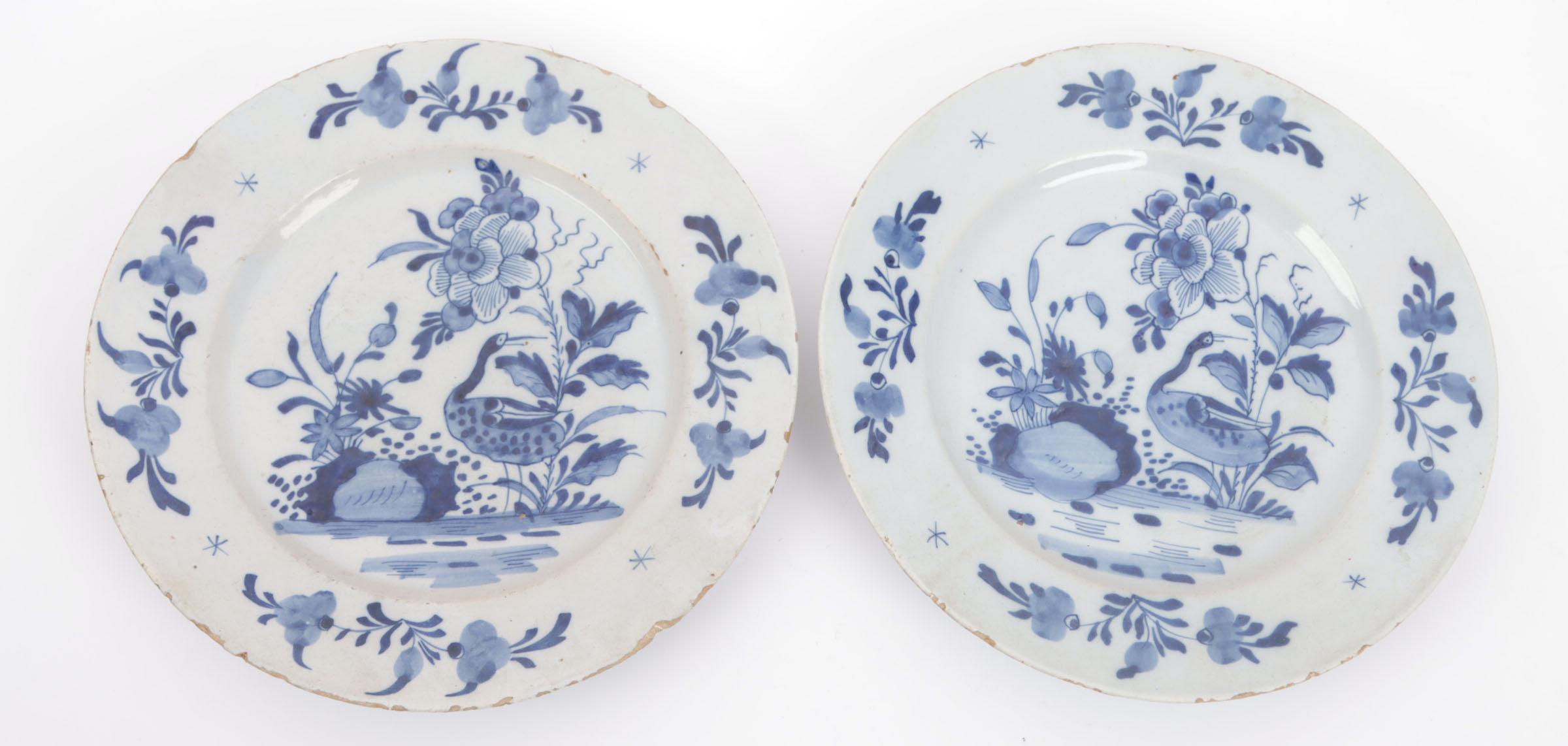 2 Antieke blauw/wit met vogels in landschap gedecoreerde aardewerken borden, diam.23,5 cm.