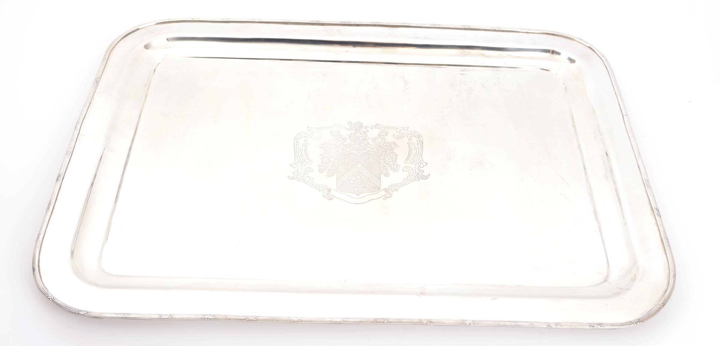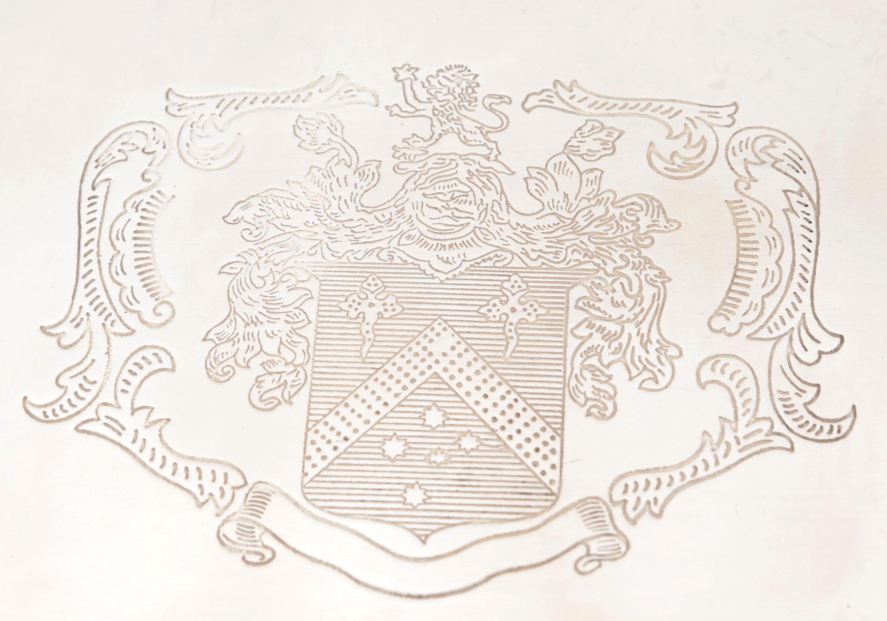 Groot pleet dienblad met familiewapen h.4 x b.65 x d.47 cm.