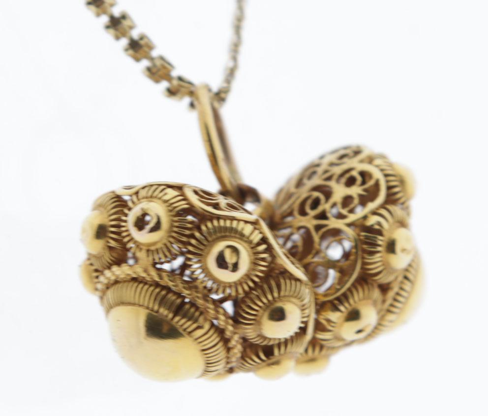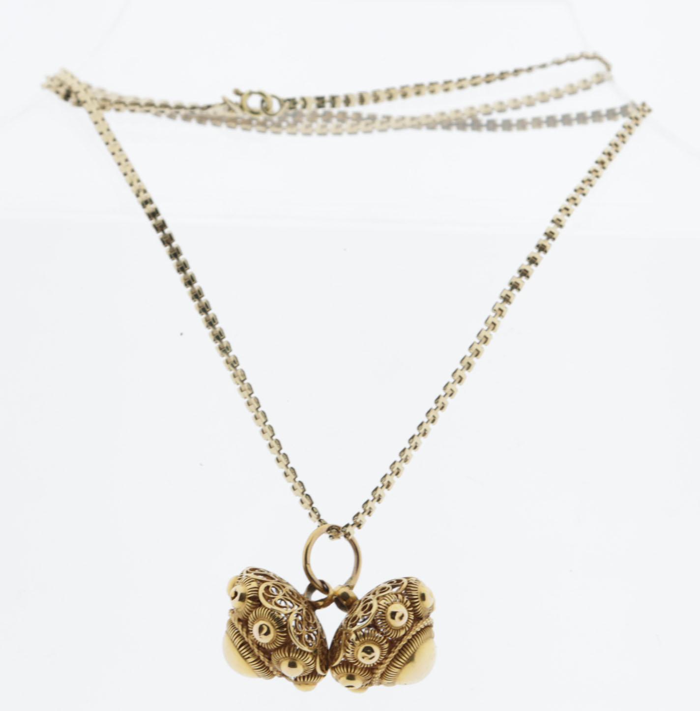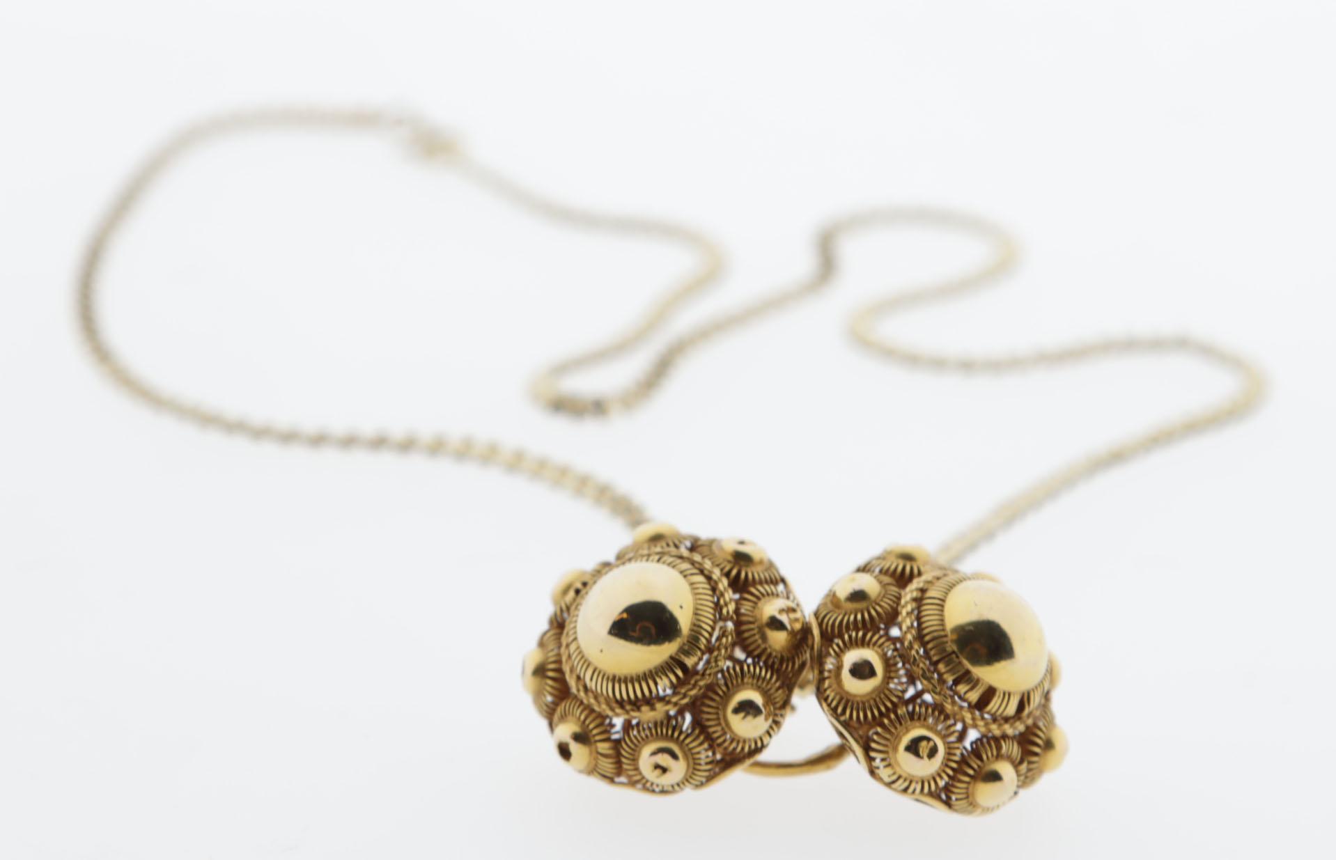 14 Kt. gouden collier met 2 filigrain Zeeuwse ballen als hanger, totaal 18,1 gram, lengte 52 cm.