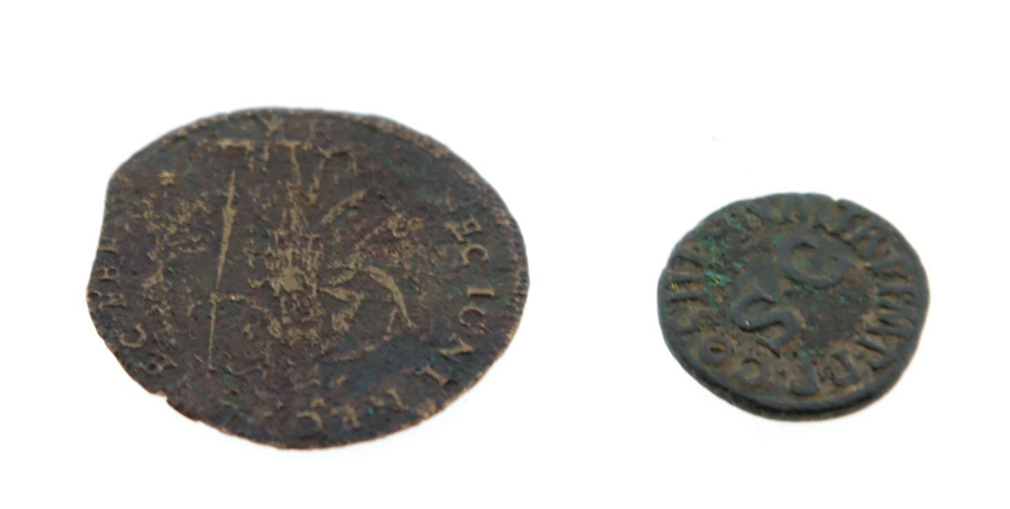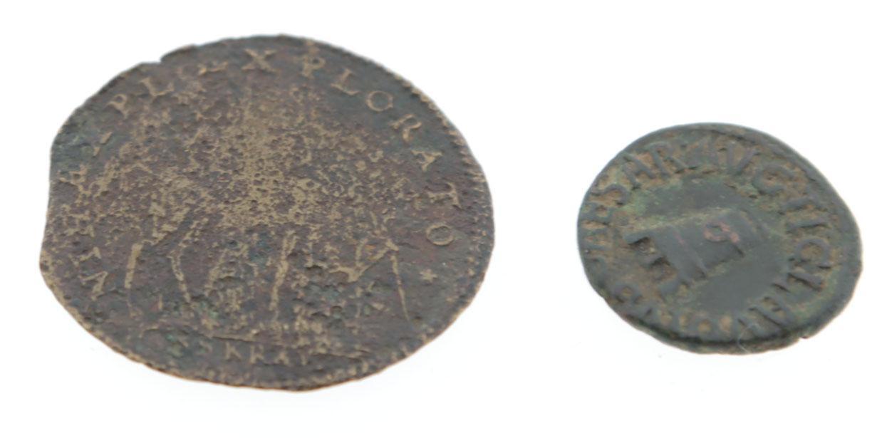 2 Antieke munten w.o. Claudius ca. 50AD, bodemvondst
