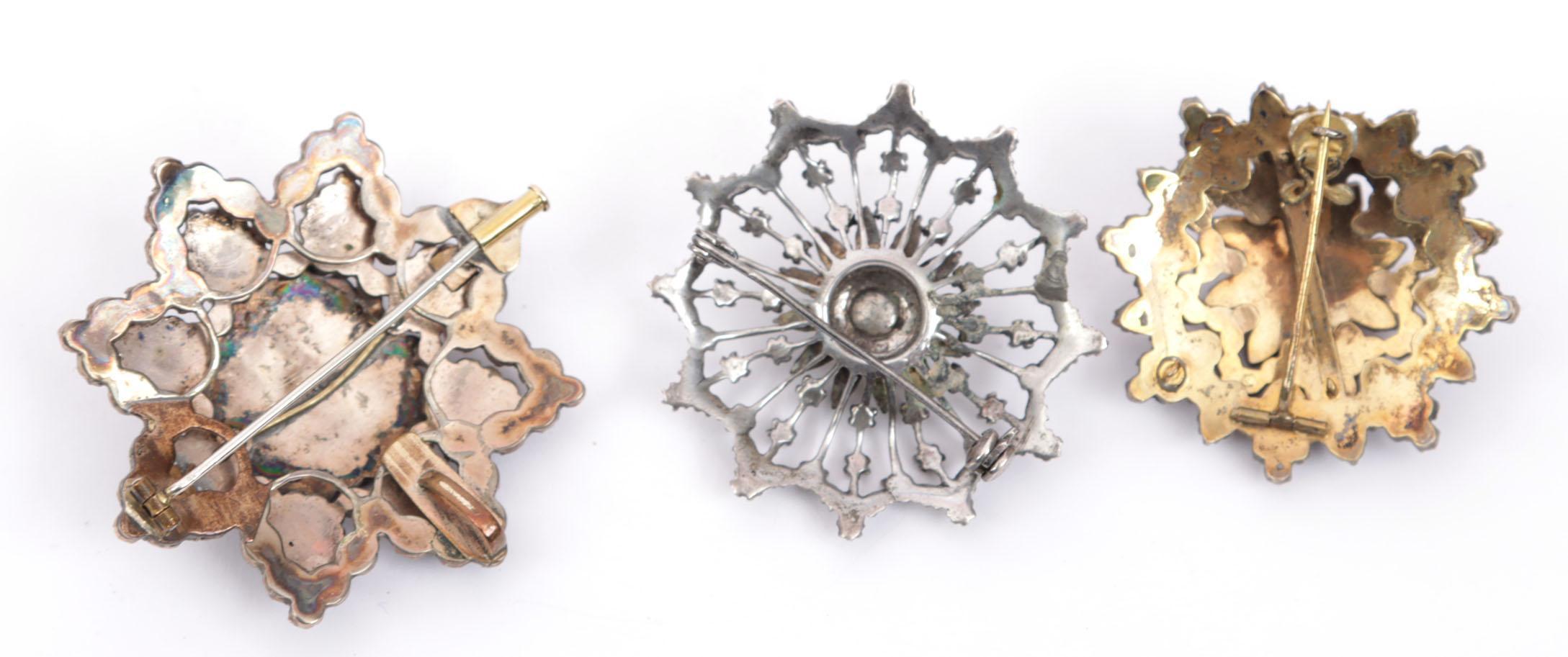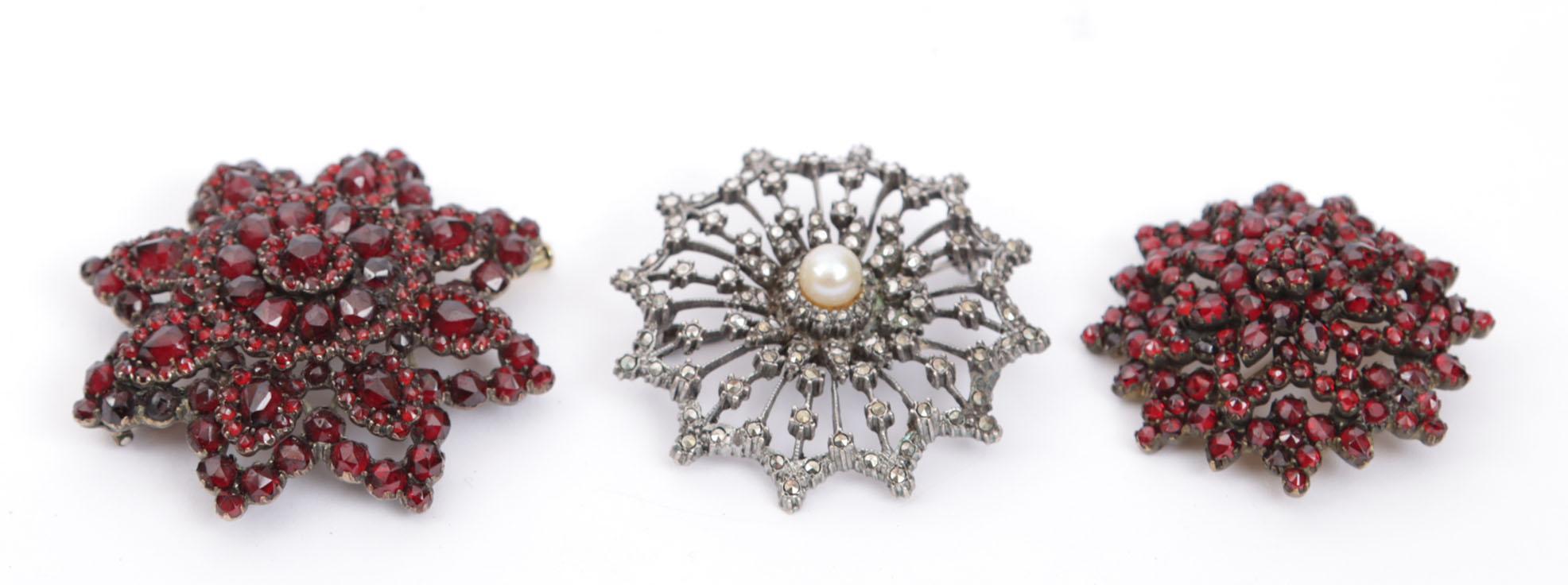 Koopje van 3 zilveren stervormige broches bezet met granaat, markesiet en parel