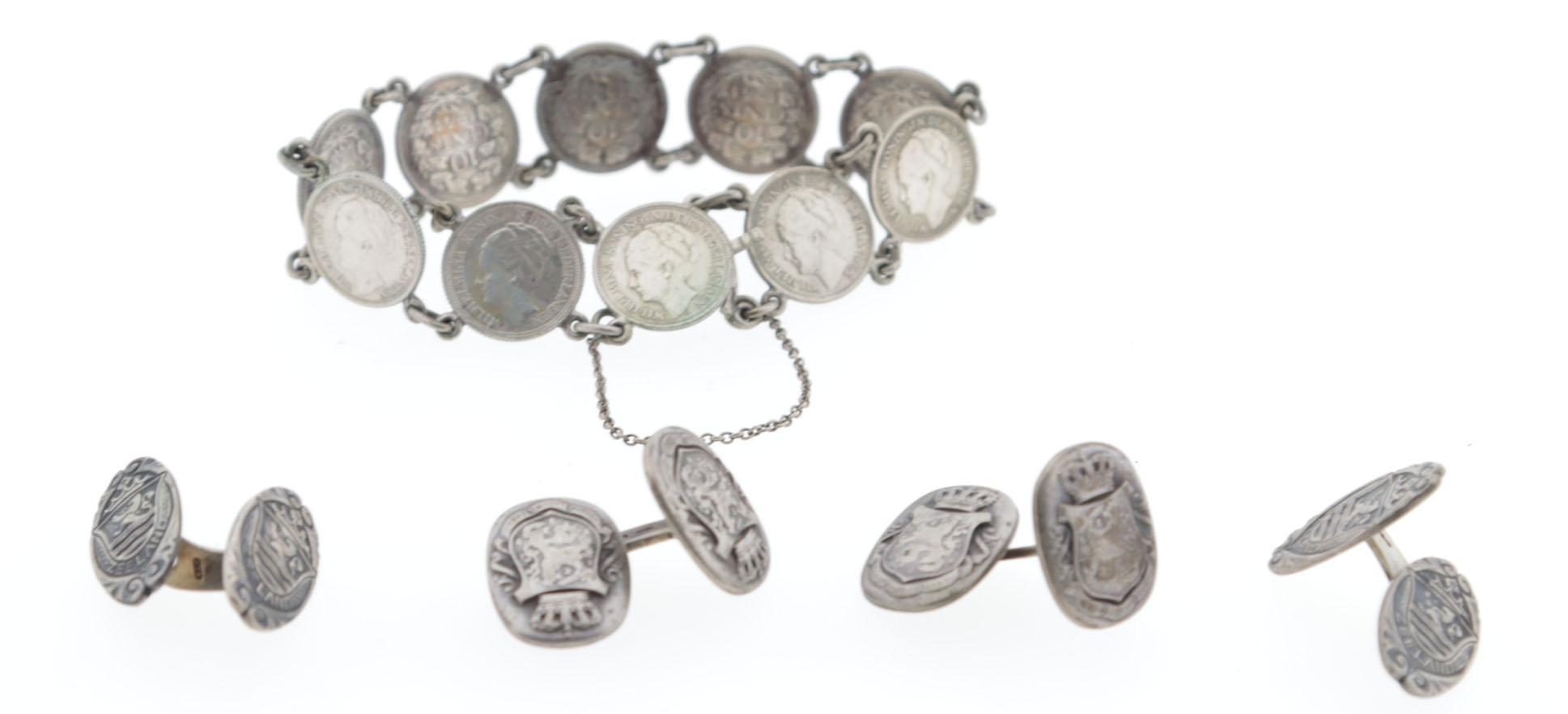 Zilveren dubbeltjes armband en twee paar zilveren manchetknopen, 45,8 gram