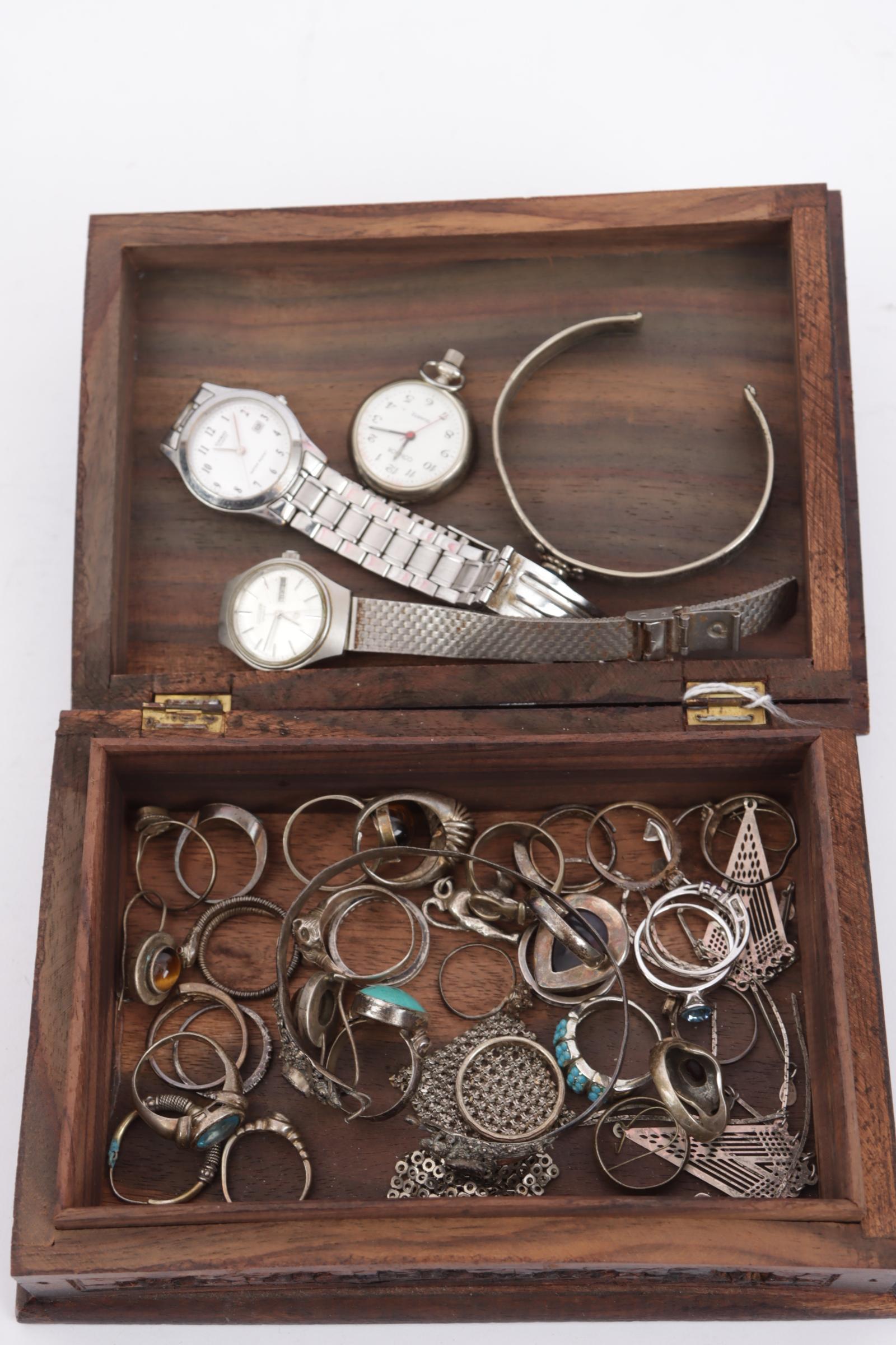 Rijkbewerkt houten kistje met inhoud van diverse zilveren sieraden, 2 polshorloge en een vestzakhorloge