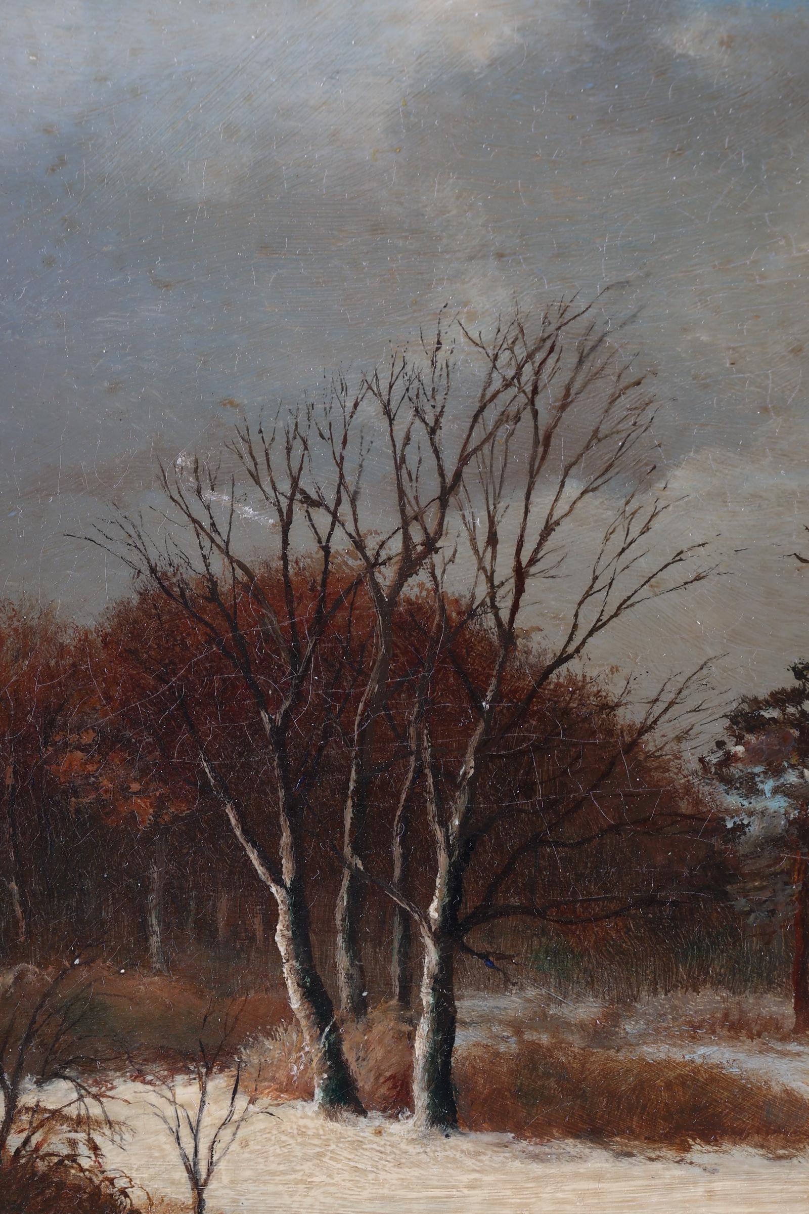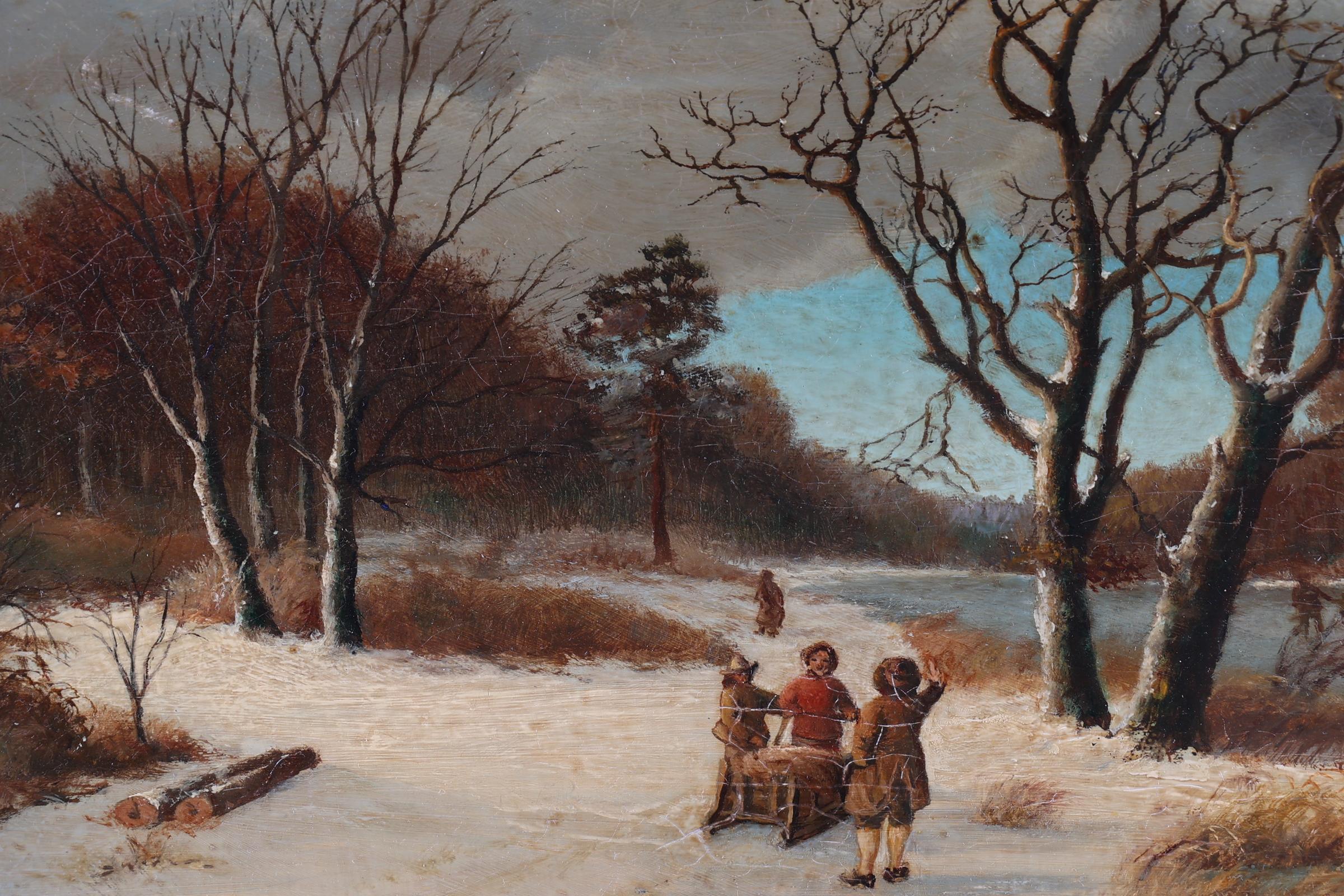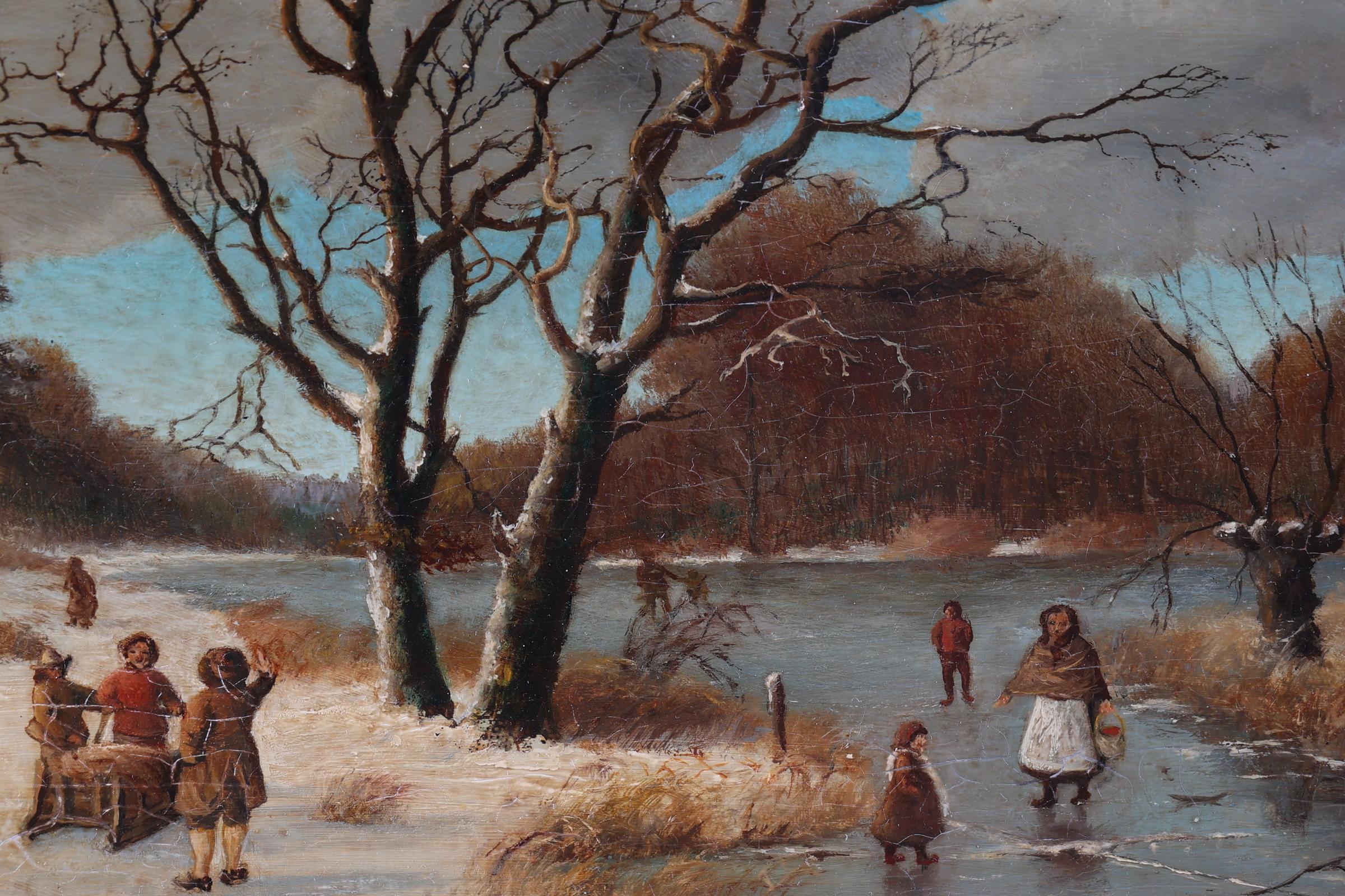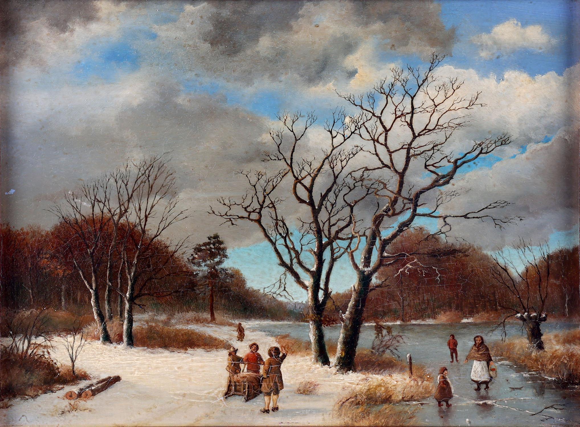 Onb.meester, Winters bosven met schaatsers en personen, olieverf op paneel, 40 x 30 cm.