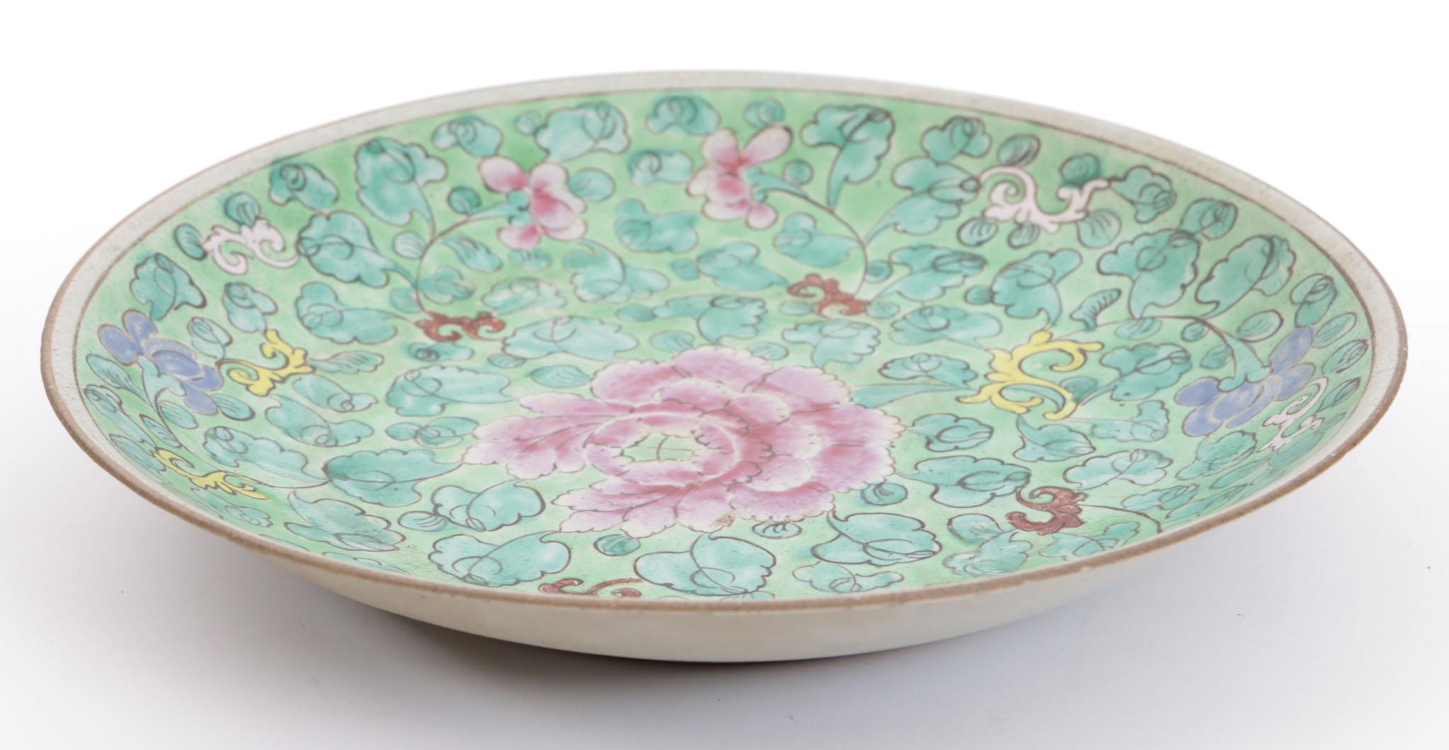 Met bloemen gedecoreerde aardewerken schotel, diam.32 cm.