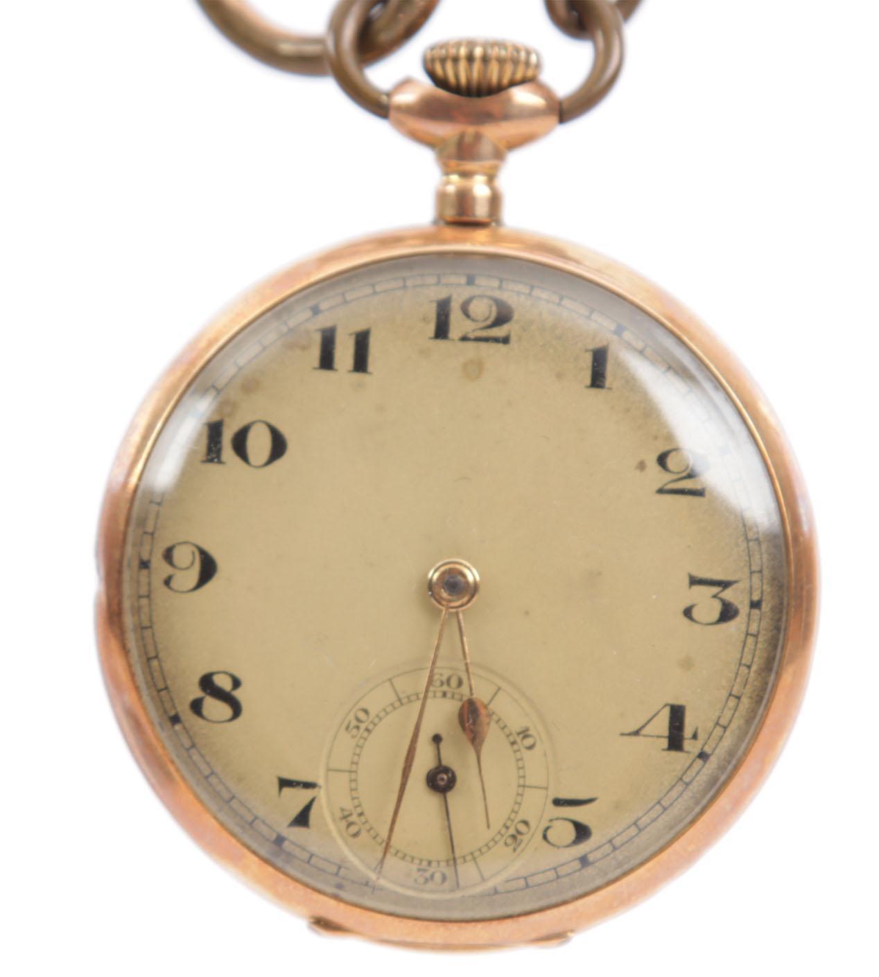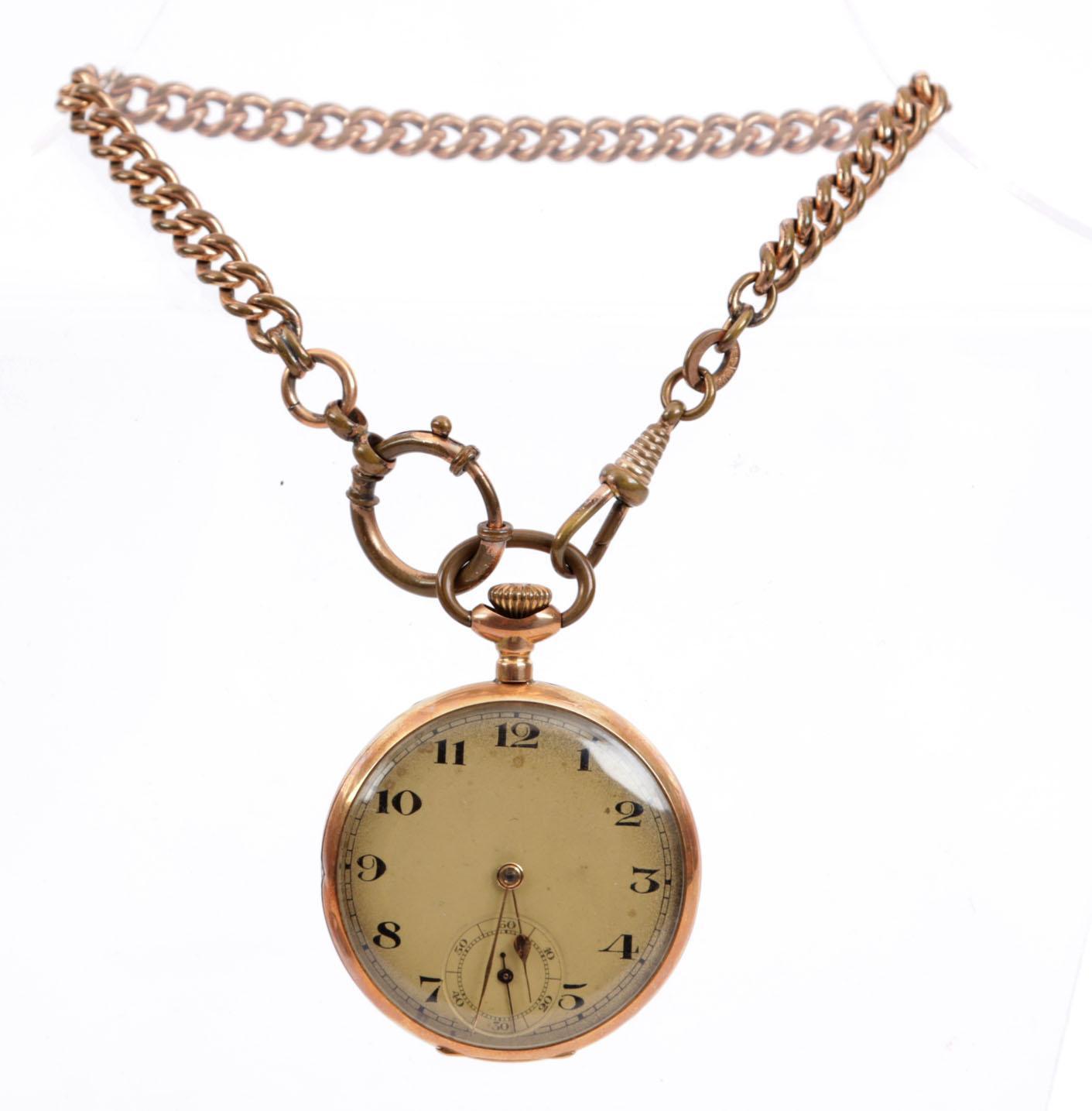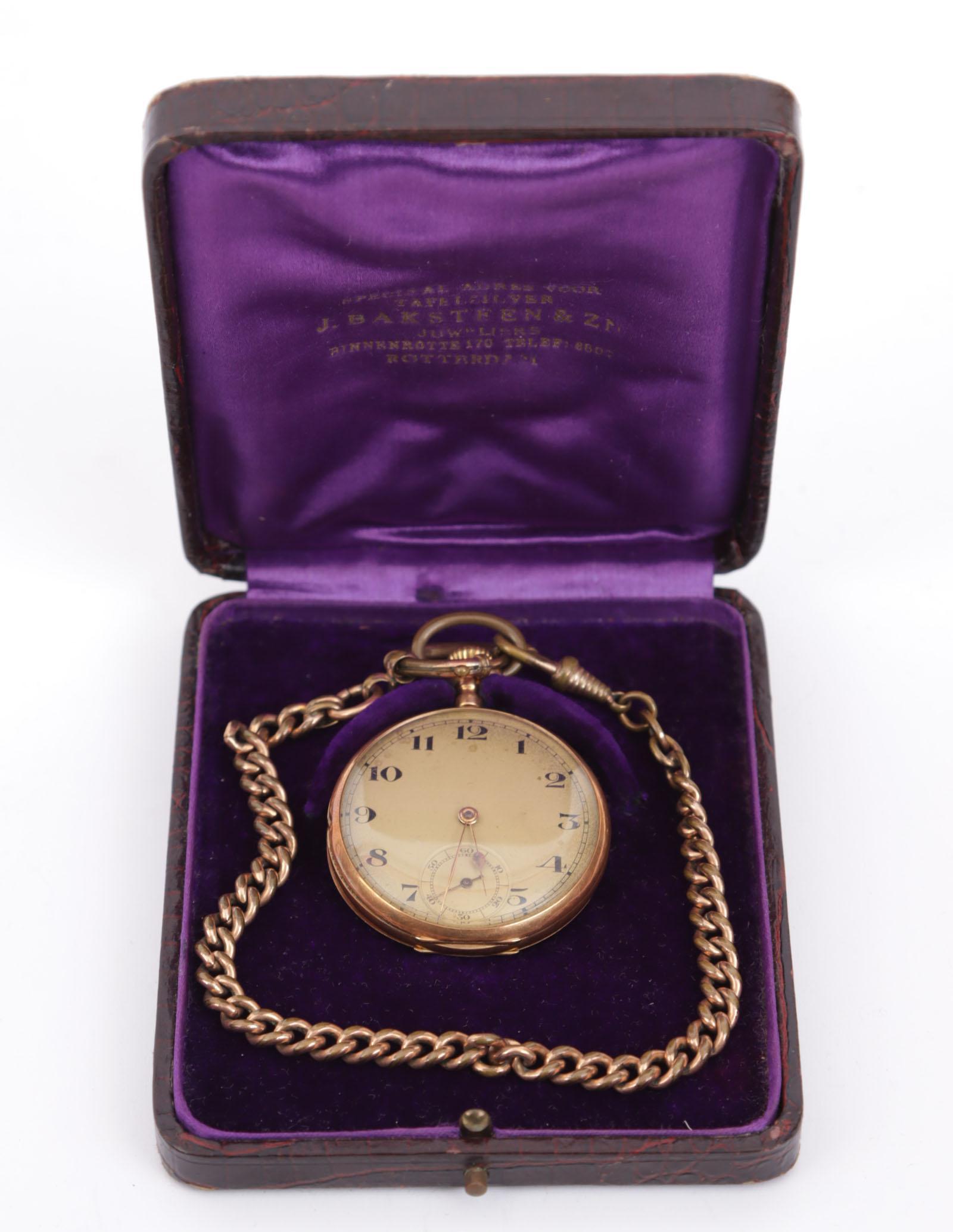 Antieke vestzakhorloge in 14 kt. gouden kast met doublé horlogeketting in origineel foudraal
