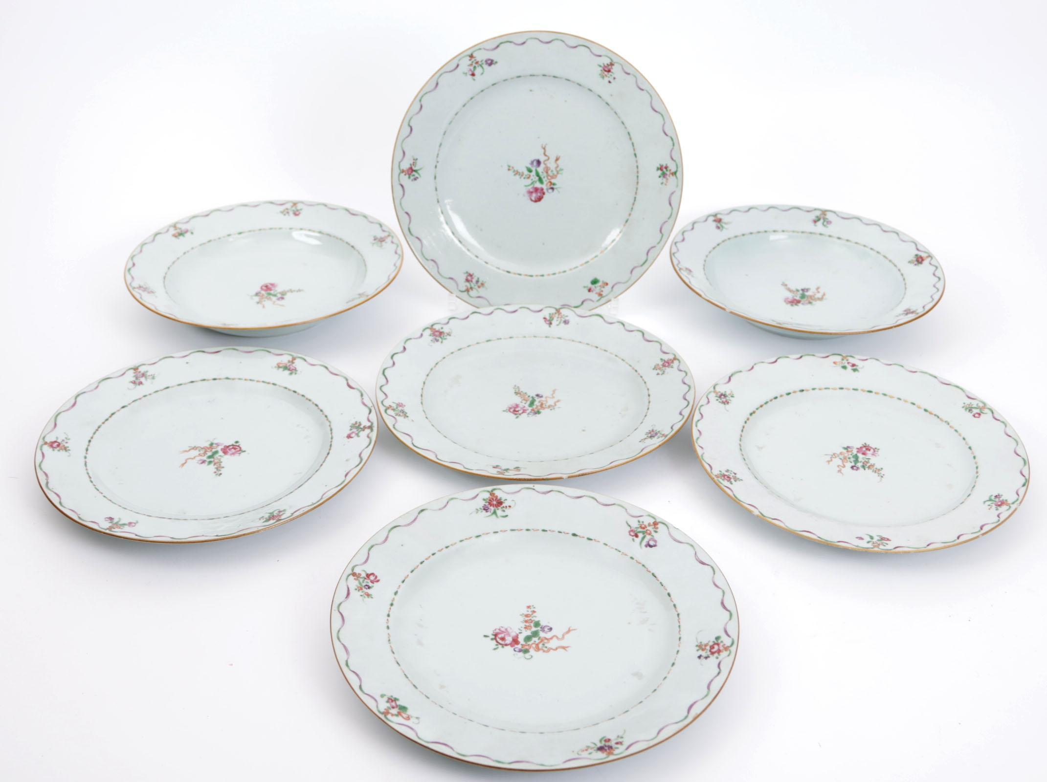 Koop van 5 platte en 2 diepe Lowestoft borden, diam.23 cm.