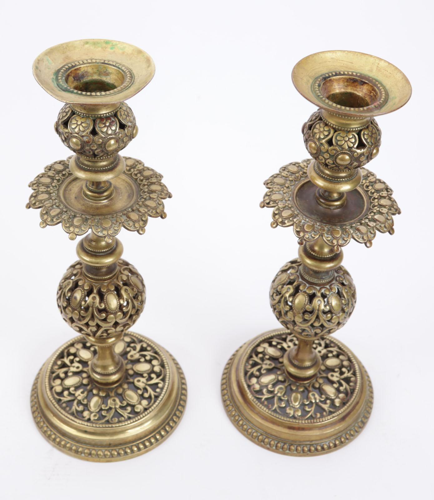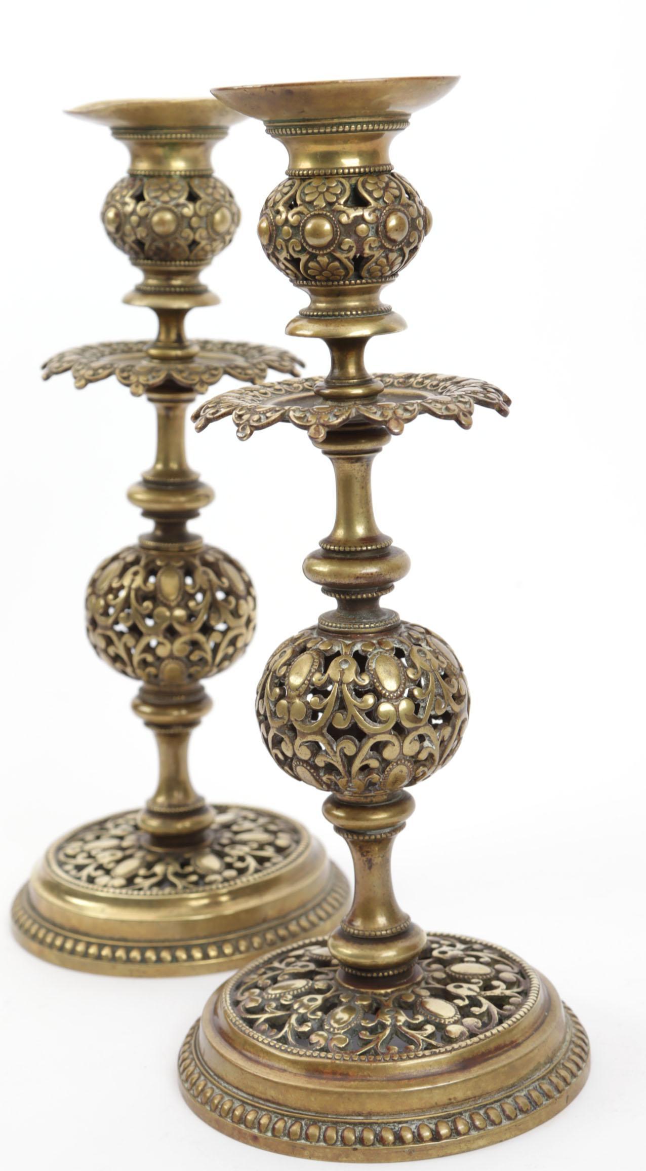 Stel bewerkte koperen kandelaars, h.26,5 cm.