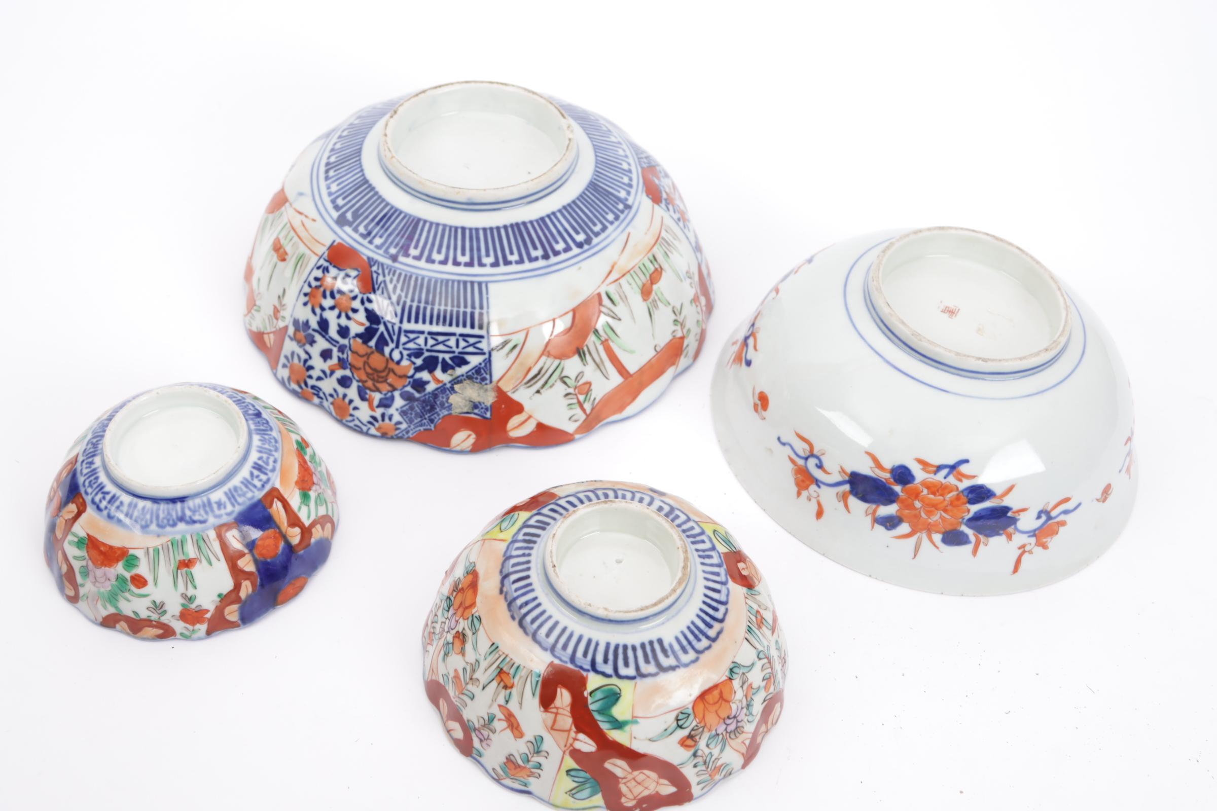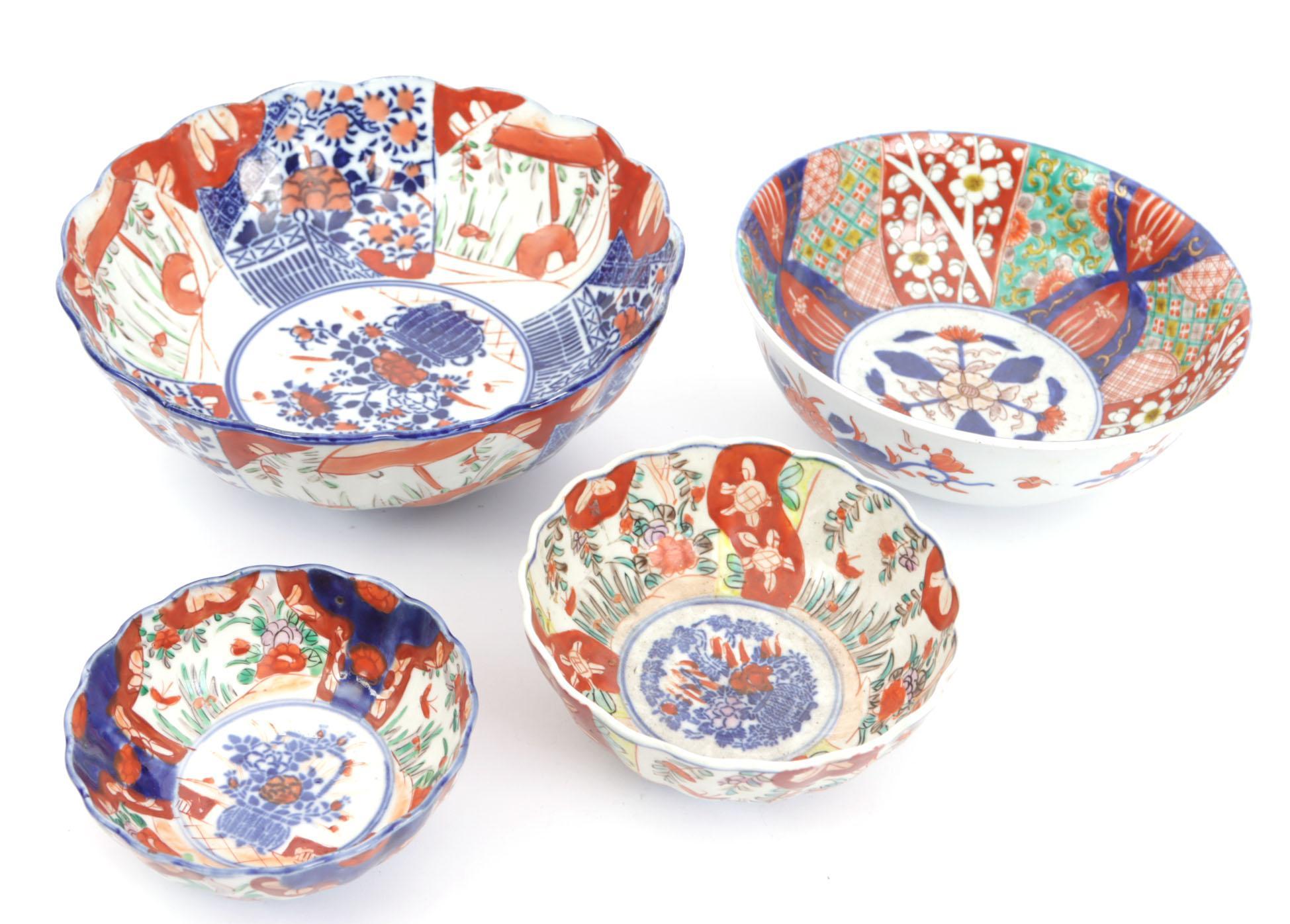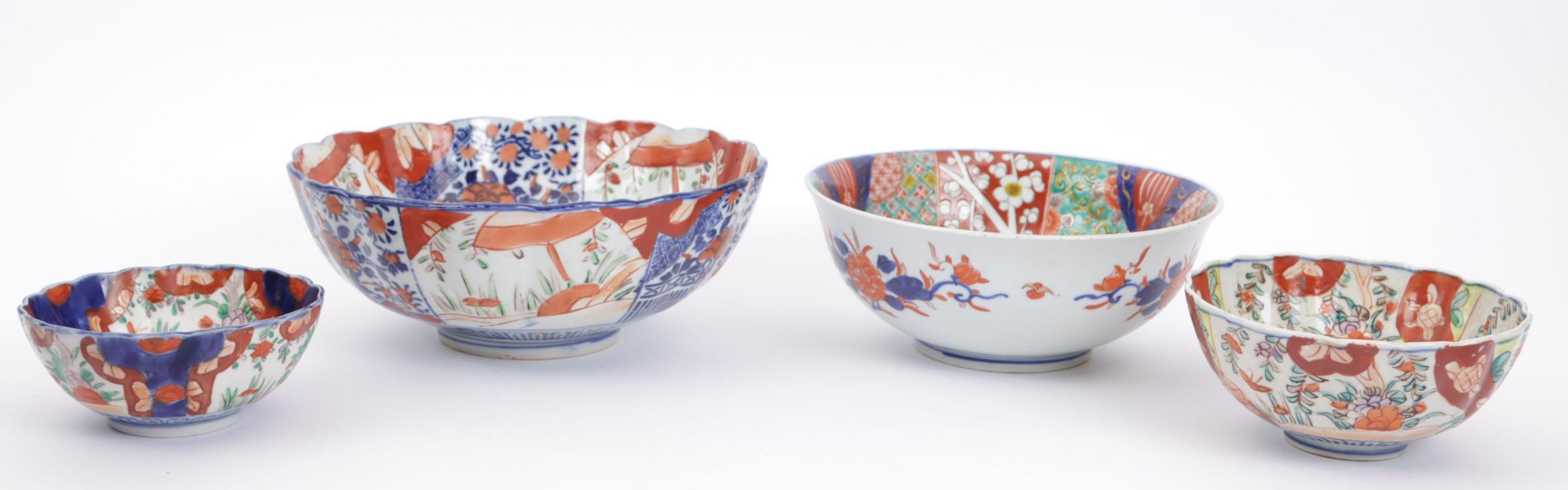 4 Diverse Imari porseleinen kommen, diam.13, 15, 22 en 28 cm.