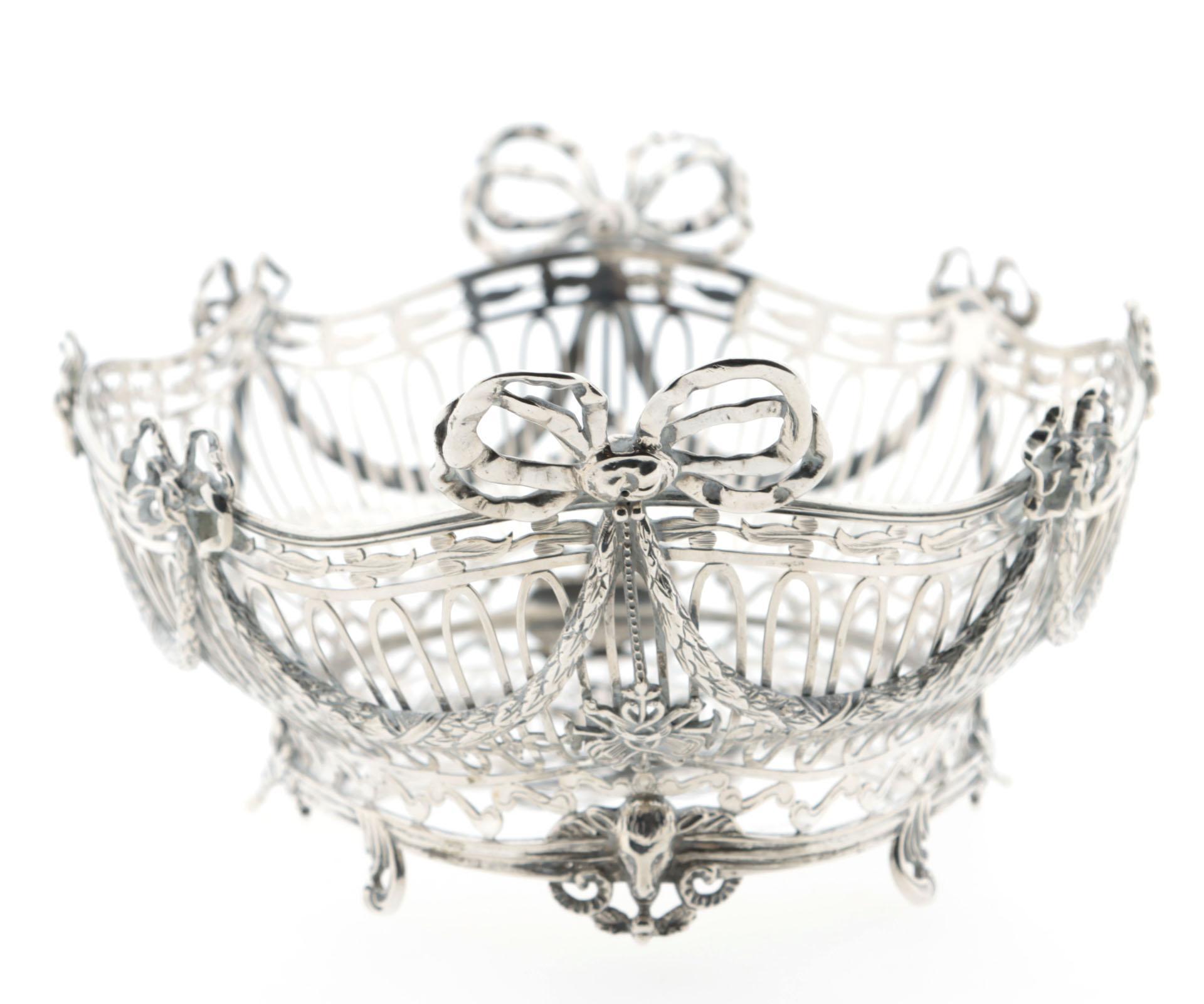 Hendrik Poelman (Arnoldes van der Beek) 's Gravenhage 1923-1925, Louis Quinze stijl 2e gehalte zilveren broodmand, h.11,5 x b.28.5 x d.20.5 cm. 684 gram.
