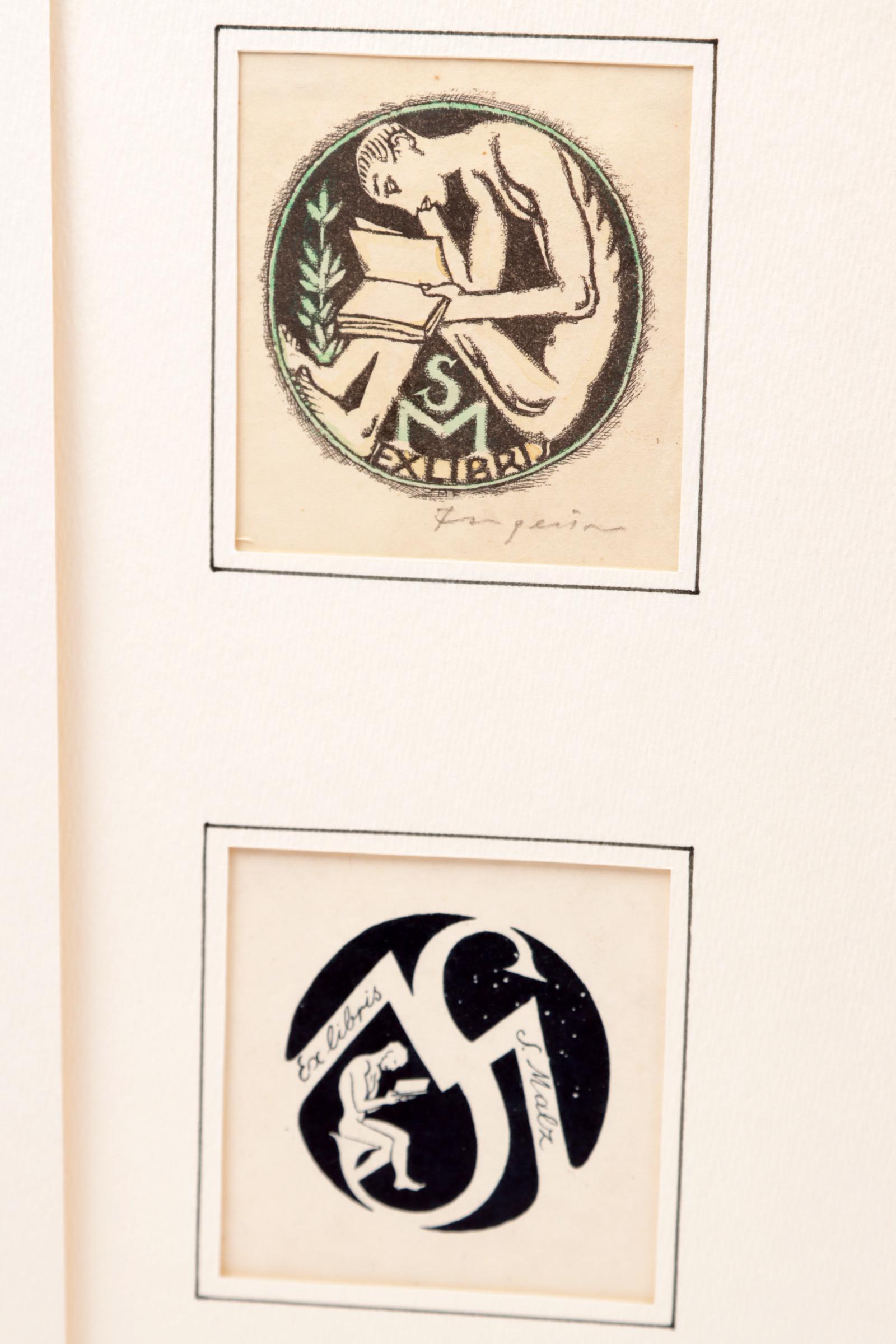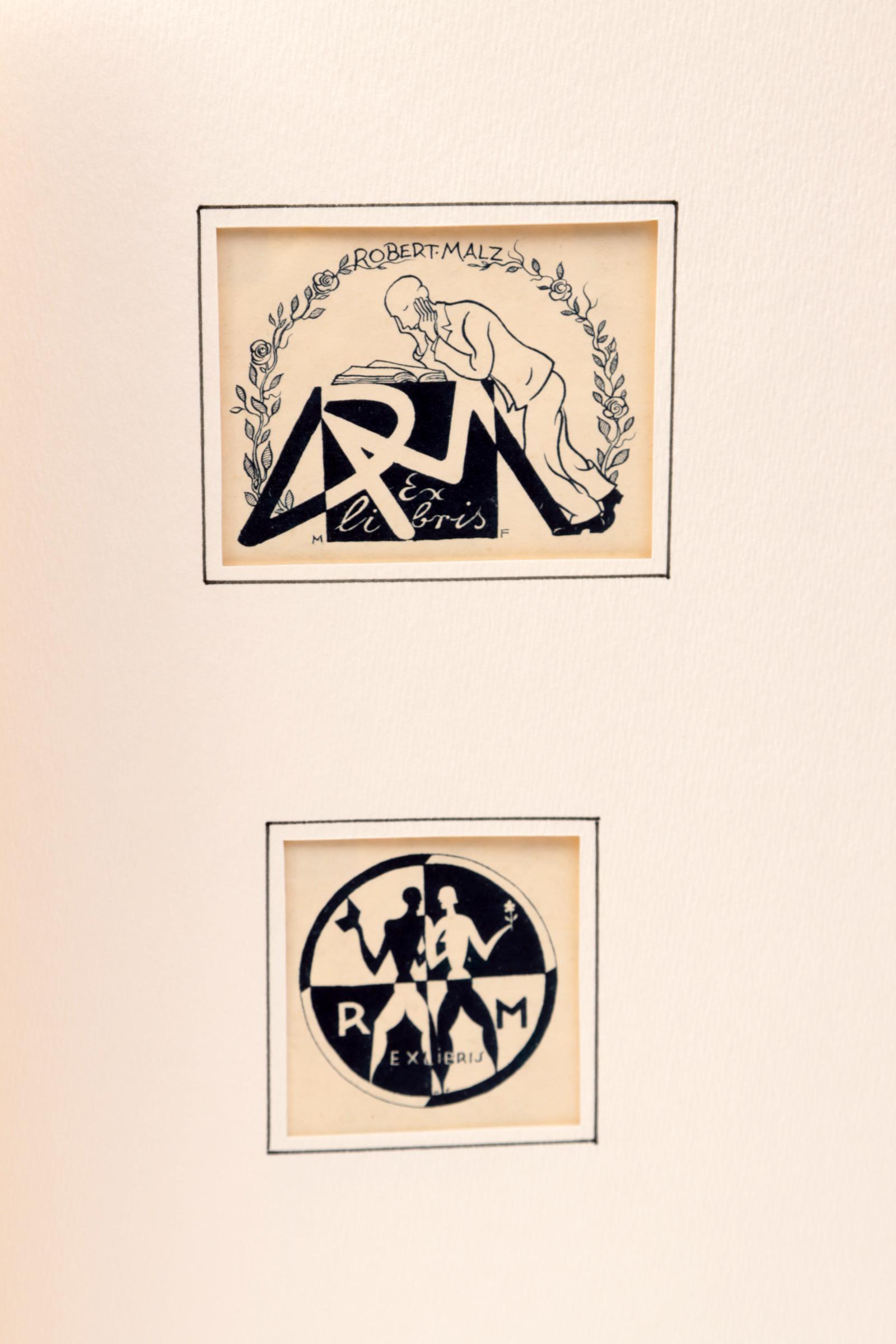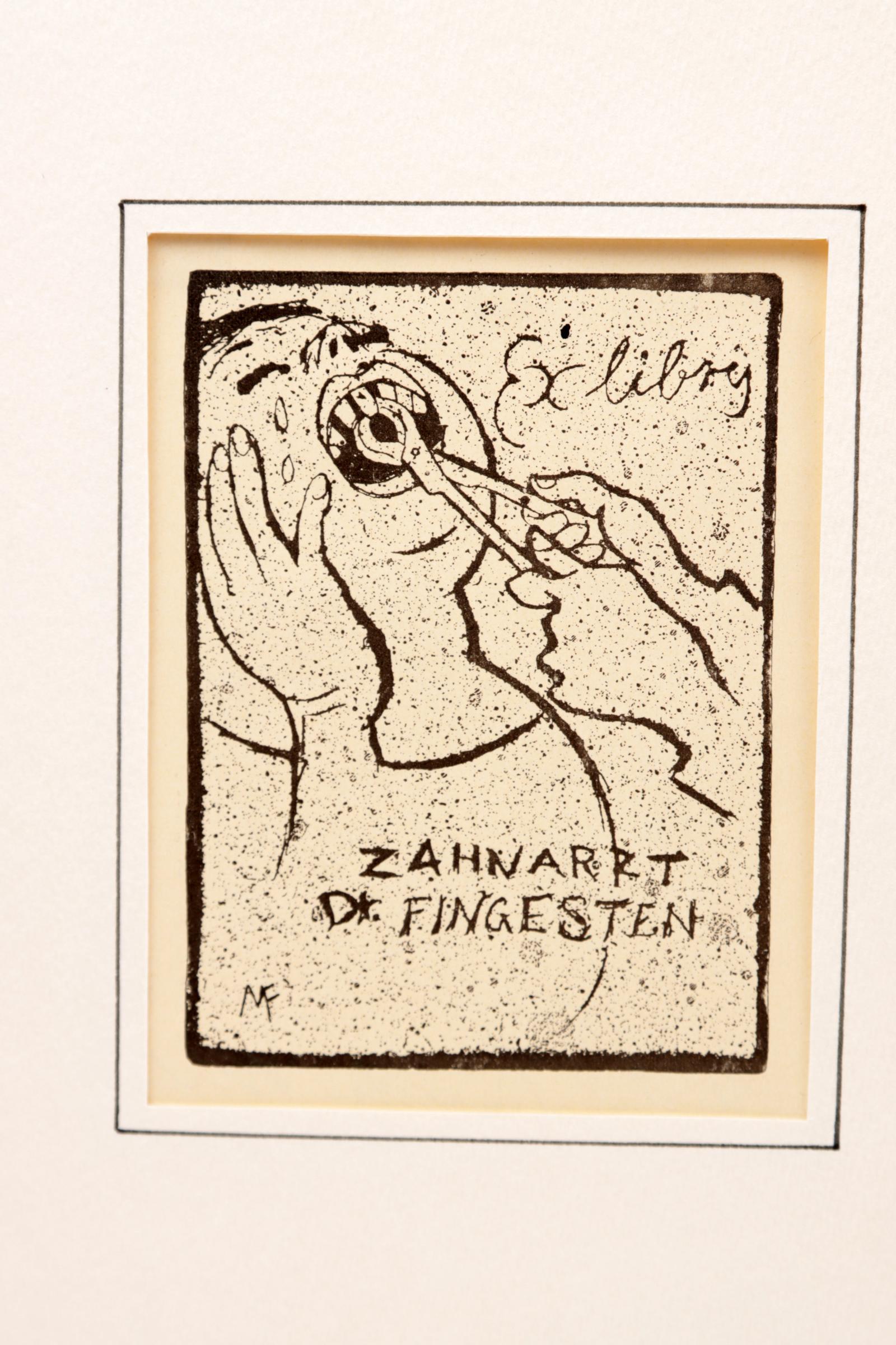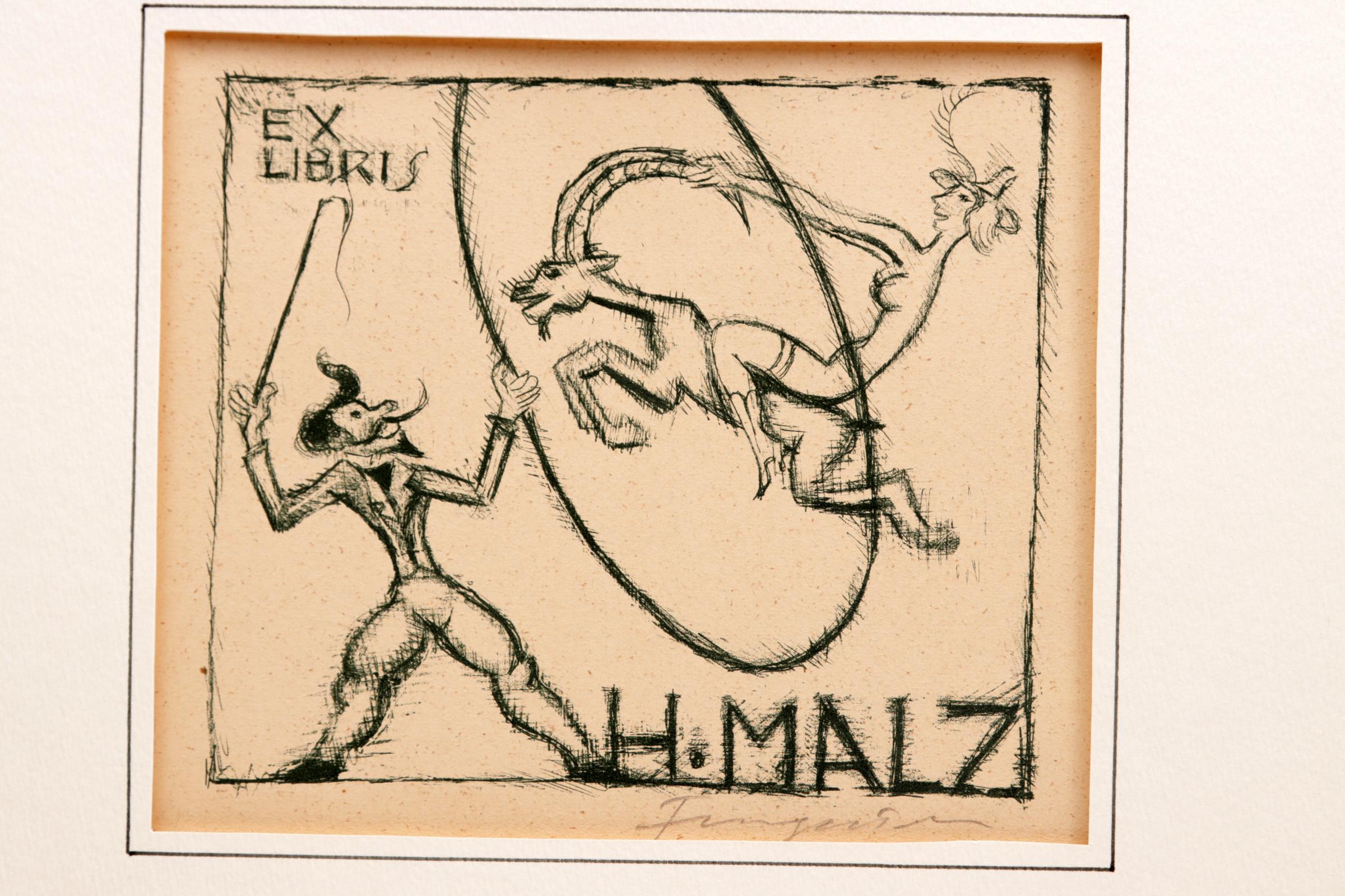 Fingesten, M., 6 exlibris / kleingrafiek, litho / cliché, opgeplakt, 2 x gesigneerd. Gemaakt voor: S.M., Dr. Fingesten, Malz, R.M.