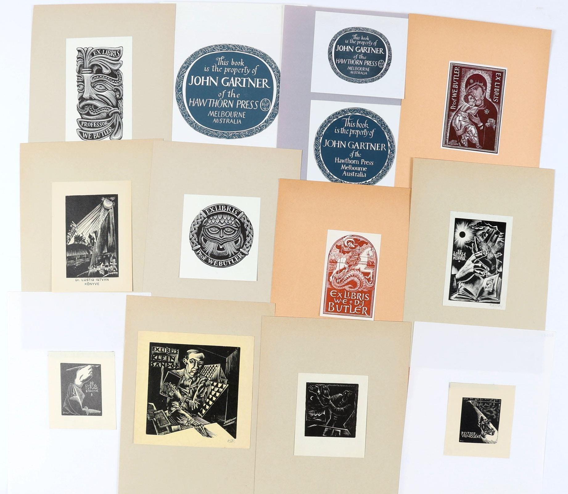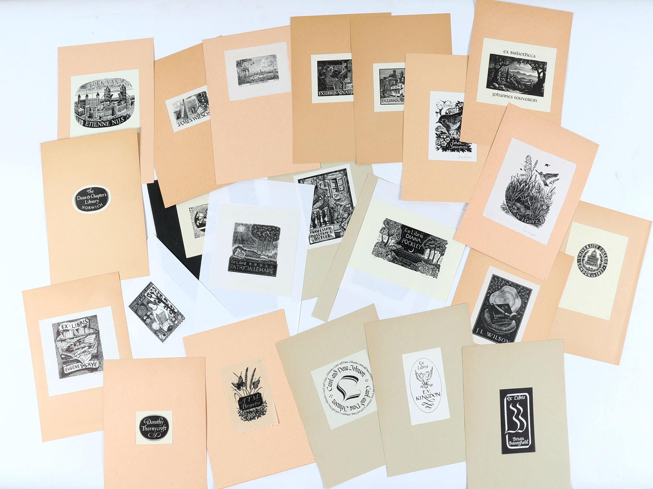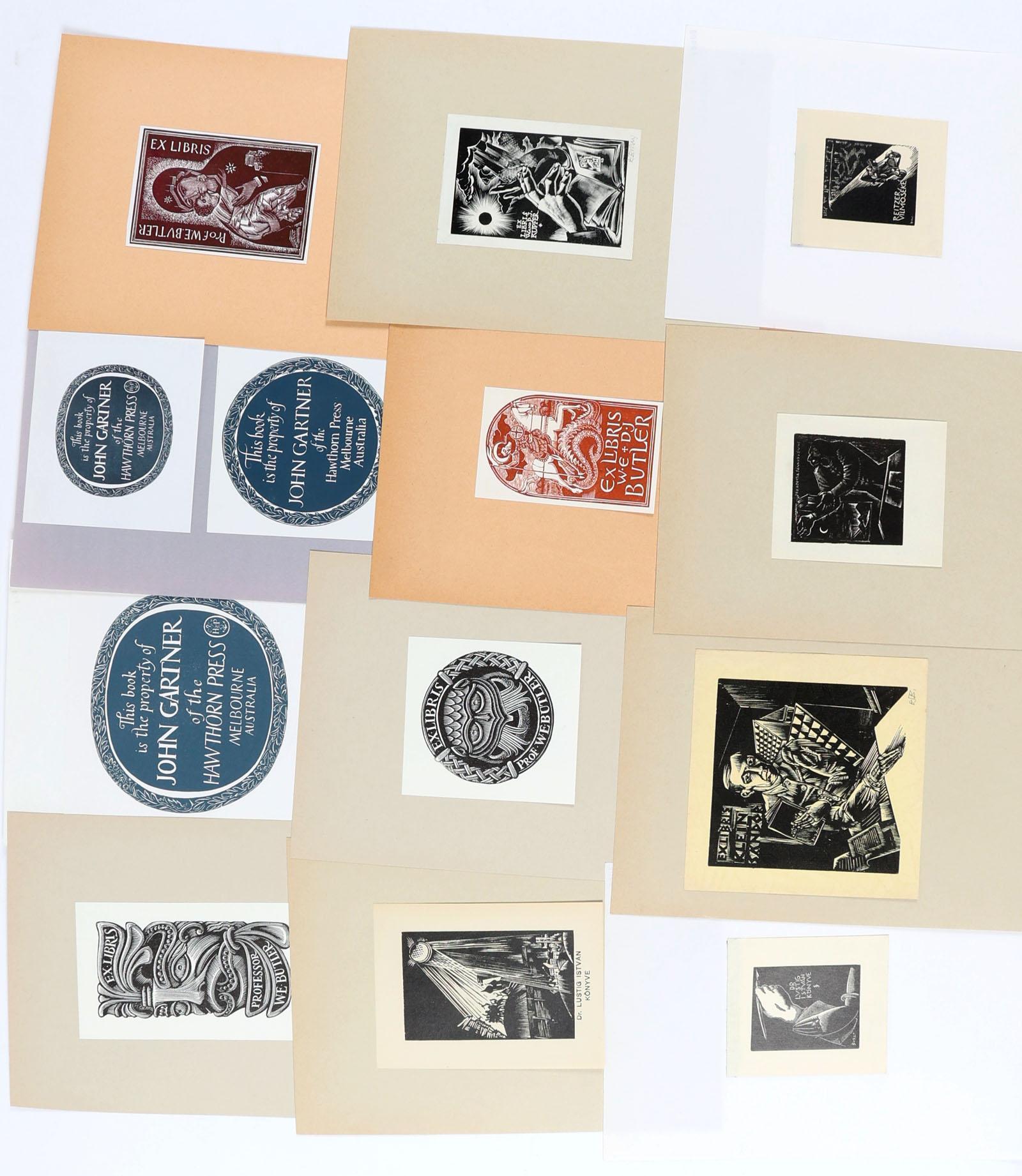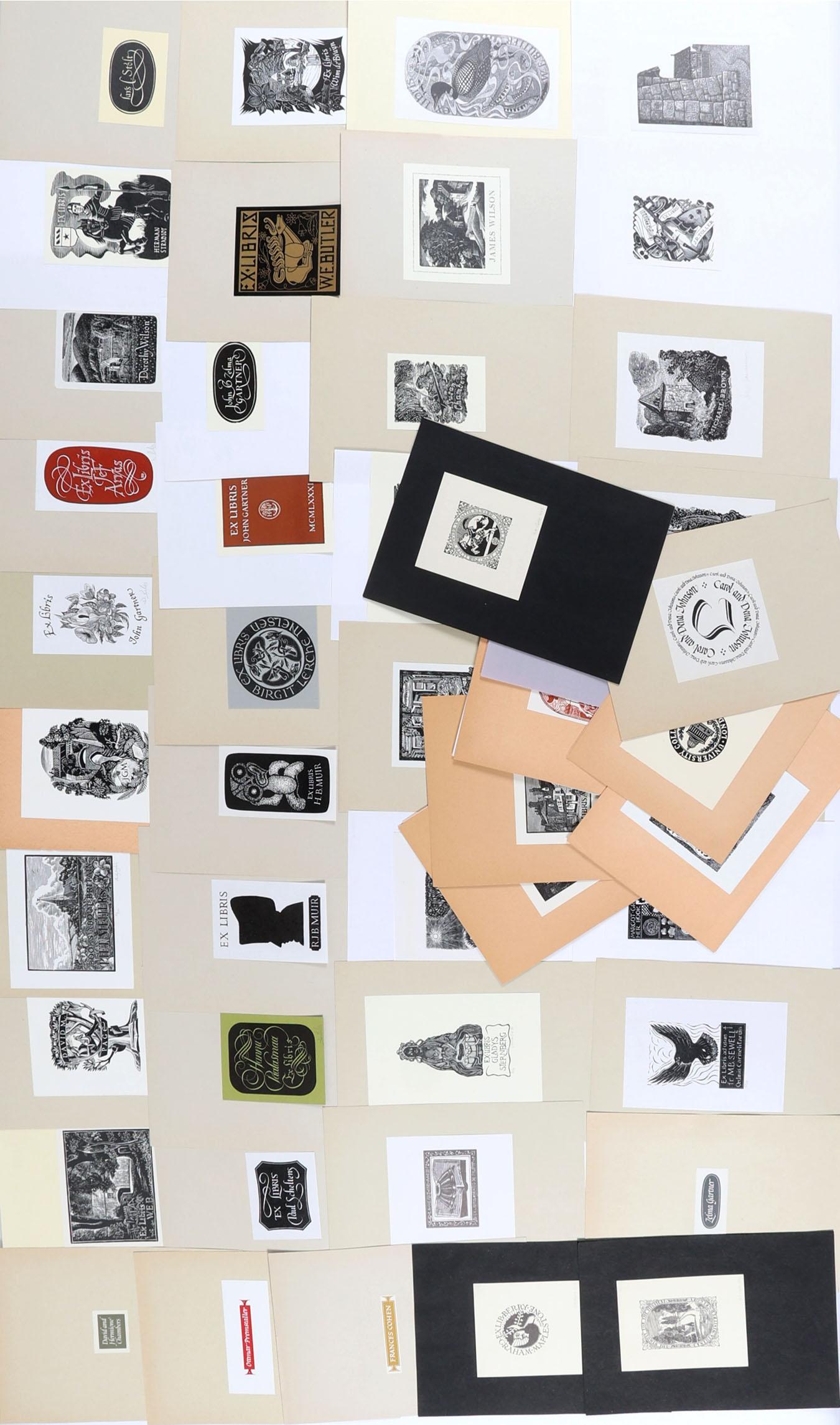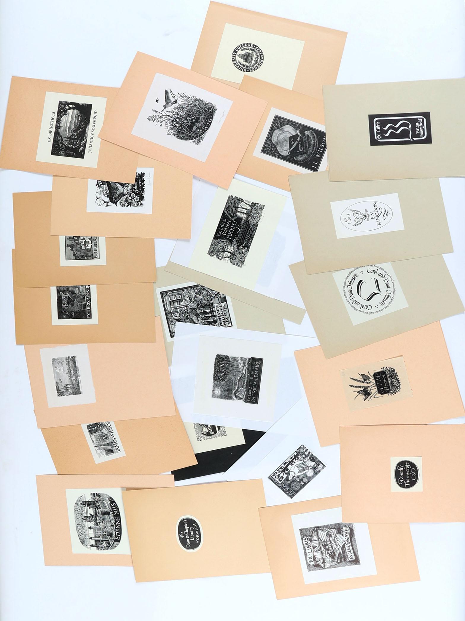 collectie plm. 75 exlibris, gemaakt door kunstenaars uit het Verenigd Koninkrijk - GB. Hoogdruk / vlakdruk, opgeplakt. Deels gesigneerd. Werk van o.a. Brett, Beaven, Boulton, Bloomfield, Clark, Carter, Lemaire, Riley.