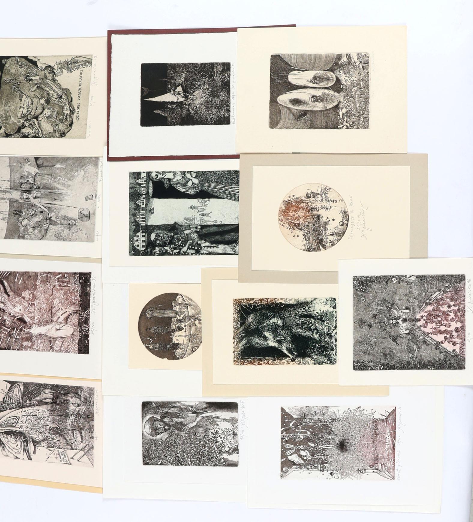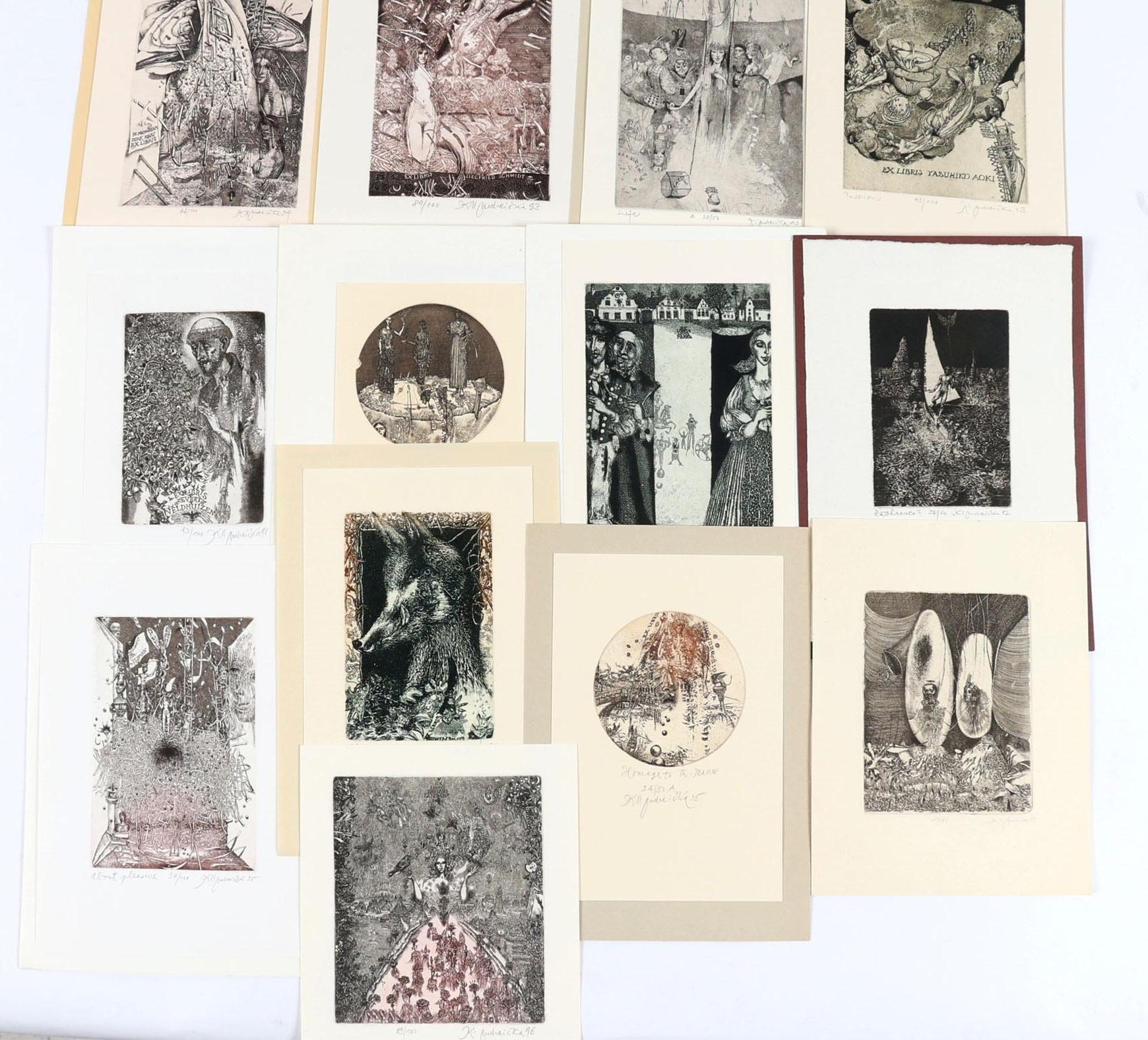 Ondreicka, K, 13 exlibris, diepdruk, alle gesigneerd, opgeplakt. Voor o.a. Hart, Schmidt, Bolotsky, Aoki, Veldhuizen, Visser, Pisane, Goetz, Van den Briele, Beumont.