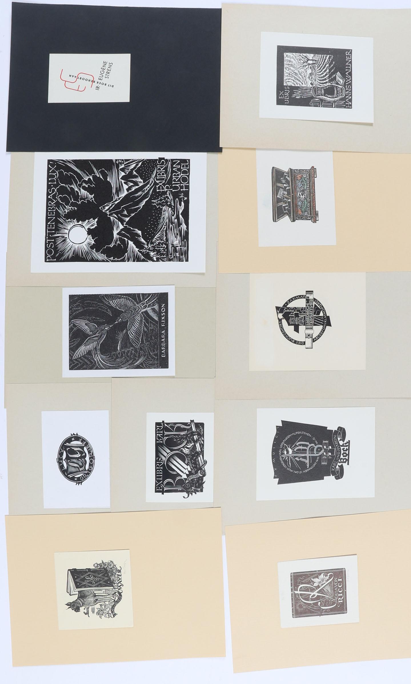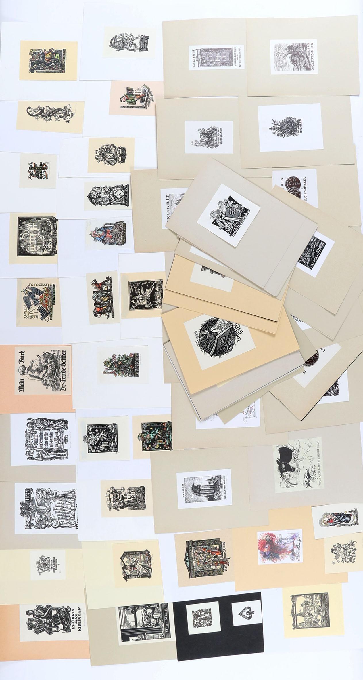 collectie van plm. 90 exlibris, gemaakt door Oostenrijkse kunstenaars, hoogdruk / vlakdruk. Opgeplakt, deels gesigneerd. Werk van o.a. Cernajcek, Reinhold, Hollemann, Hofmann, Hofer, Haselboeck, Haemmerle. Toegevoegd: 7 exlibris, gemaakt door A. Feint (Australie), hoogdruk.