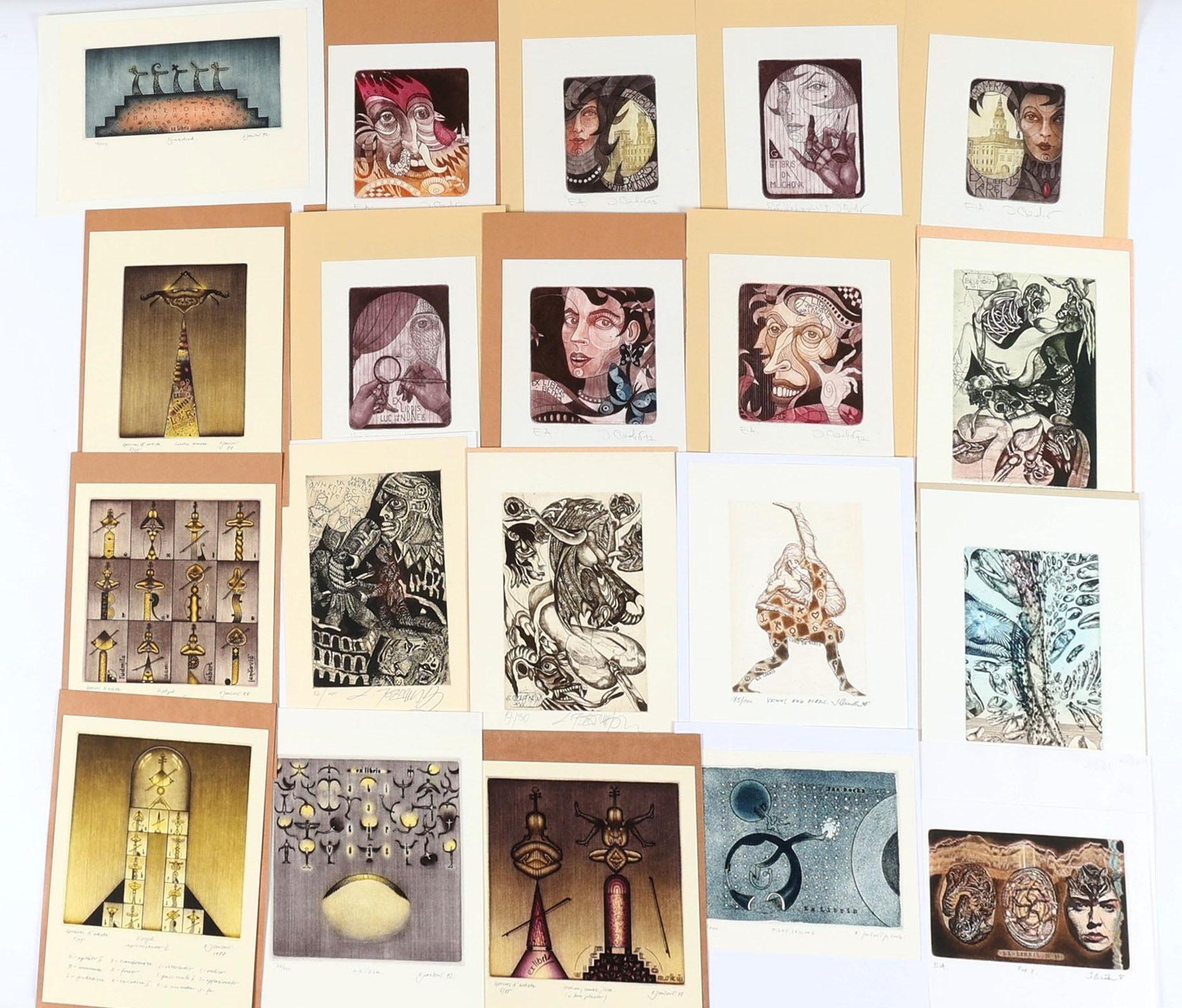 20 exlibris, gemaakt door kunstenaars uit Slowakije. Diepdruk, opgeplakt, grotendeels gesigneerd. Werk van Jancovic, Piacka, Bednarik, Cvacho.