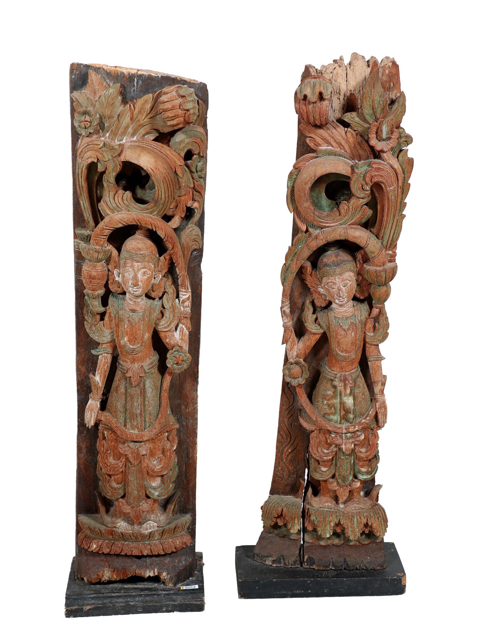 Stel gepolychromeerde Thaise houten beelden van danseressen, h.100 cm.