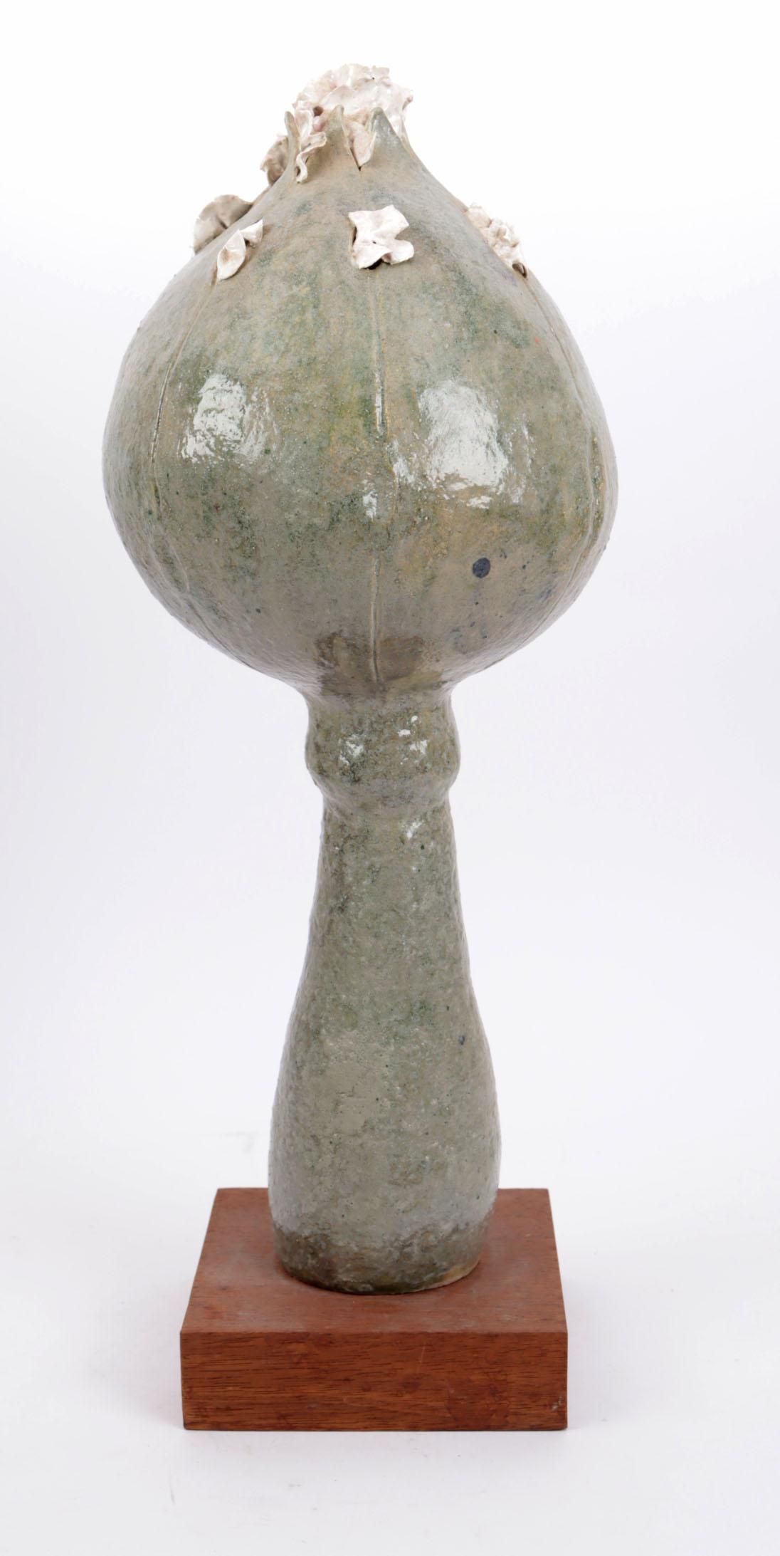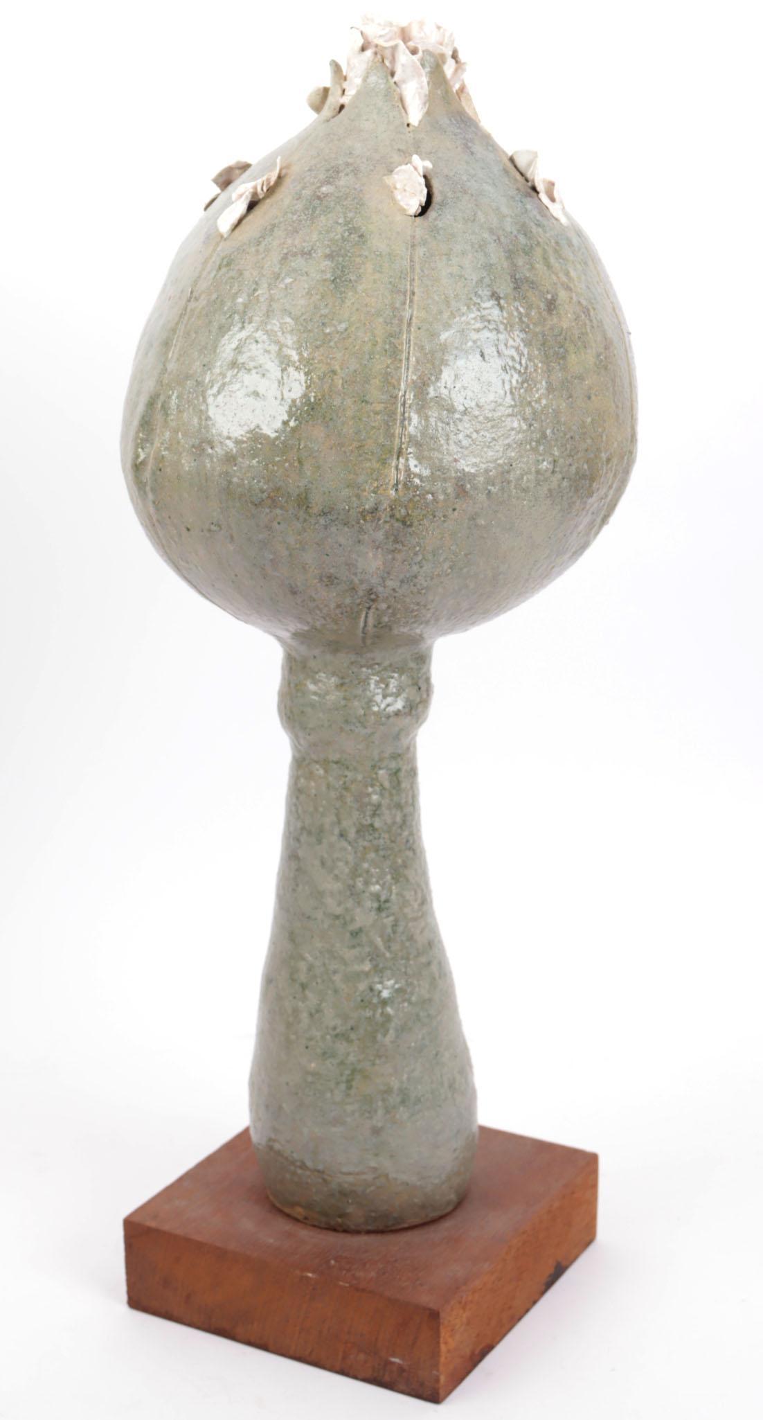 Carry Heesen, Keramiek sculptuur van een bloemknop op houten voetstuk, h.50 cm.