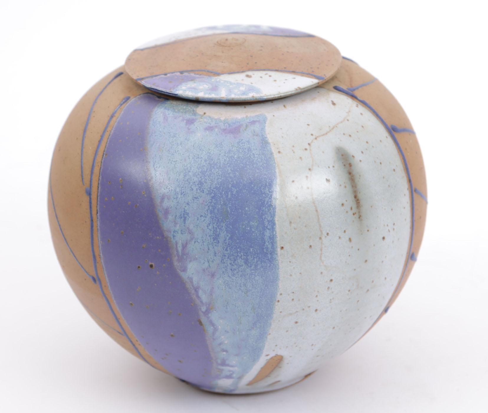 Bruin/blauwe keramieken dekselpot, h.15 cm.