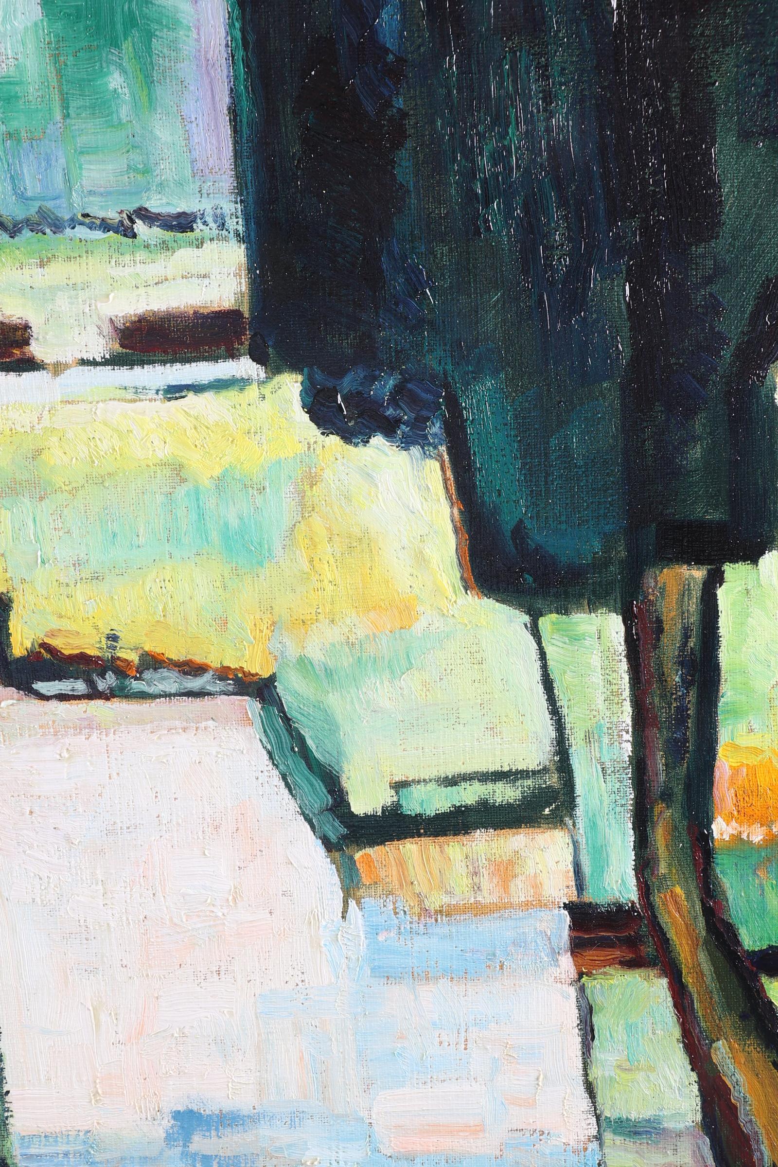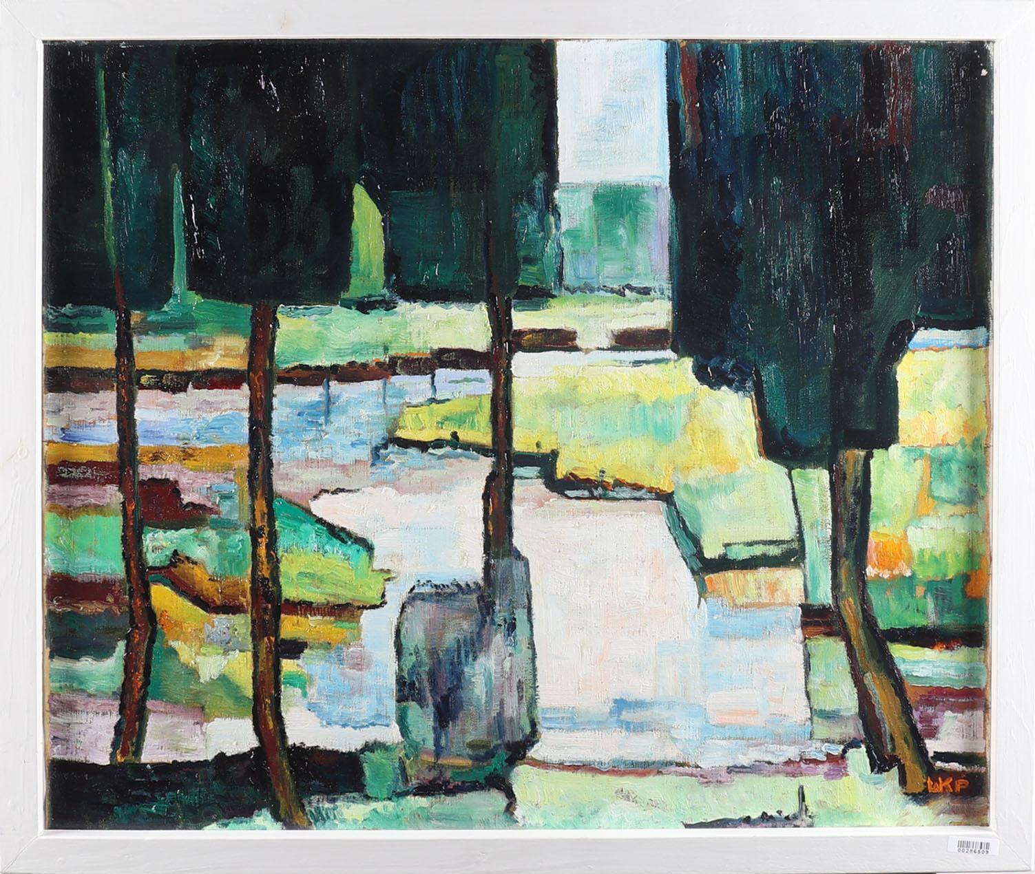 Monogram LKP, Landschap met bomen langs het water, olieverf op doek, 50 x 60 cm.