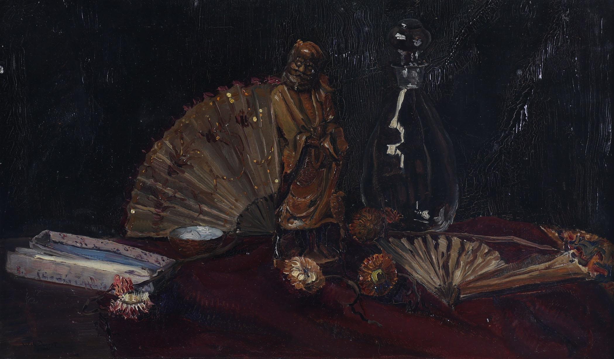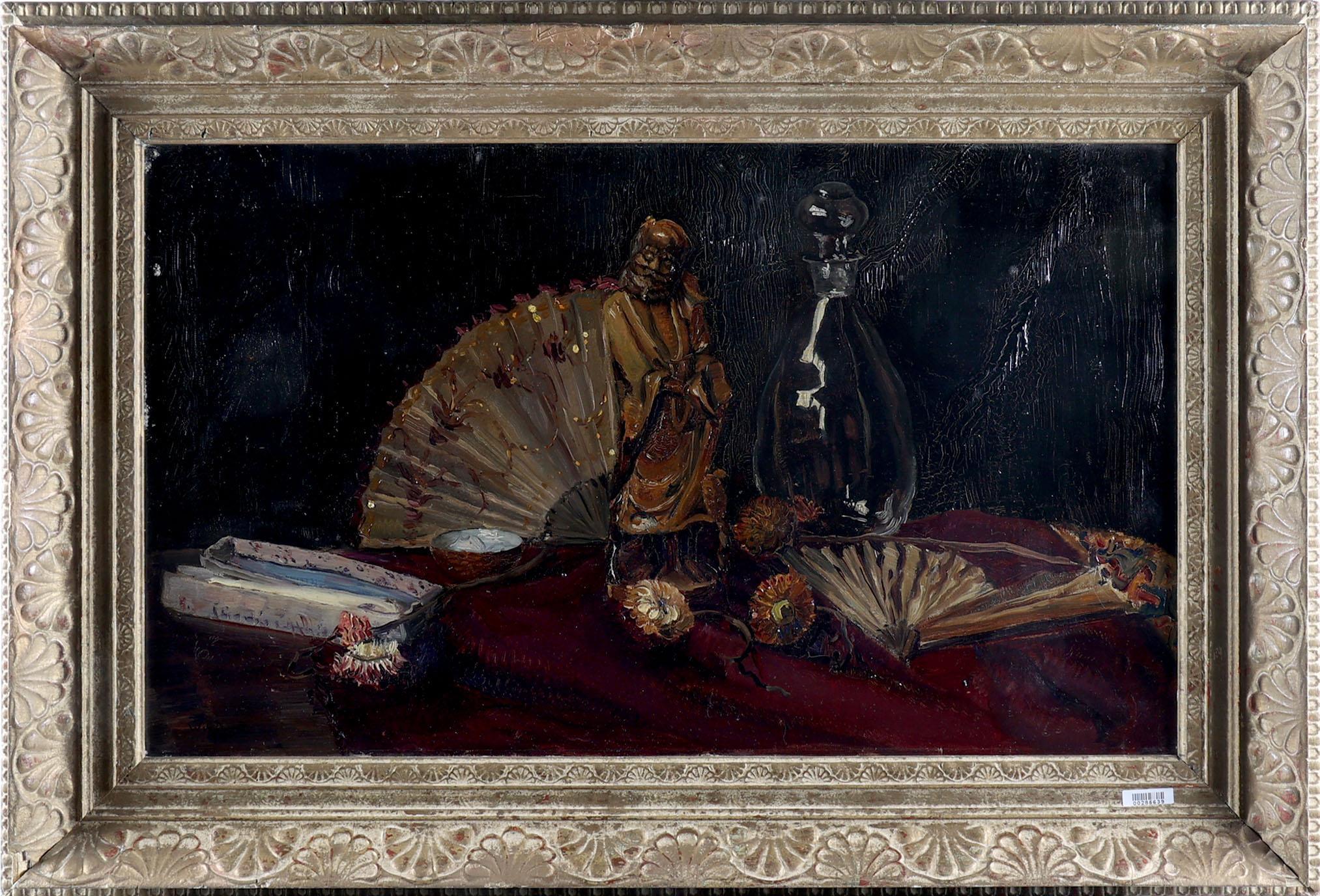 Wilhelmus Henricus Petrus Johannes (Willem) de Zwart (1862-1931), Stilleven met bloemen, waaier, beeld en karaf, olieverf op doek, 66 x 40 cm.
