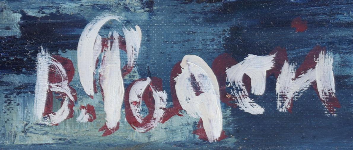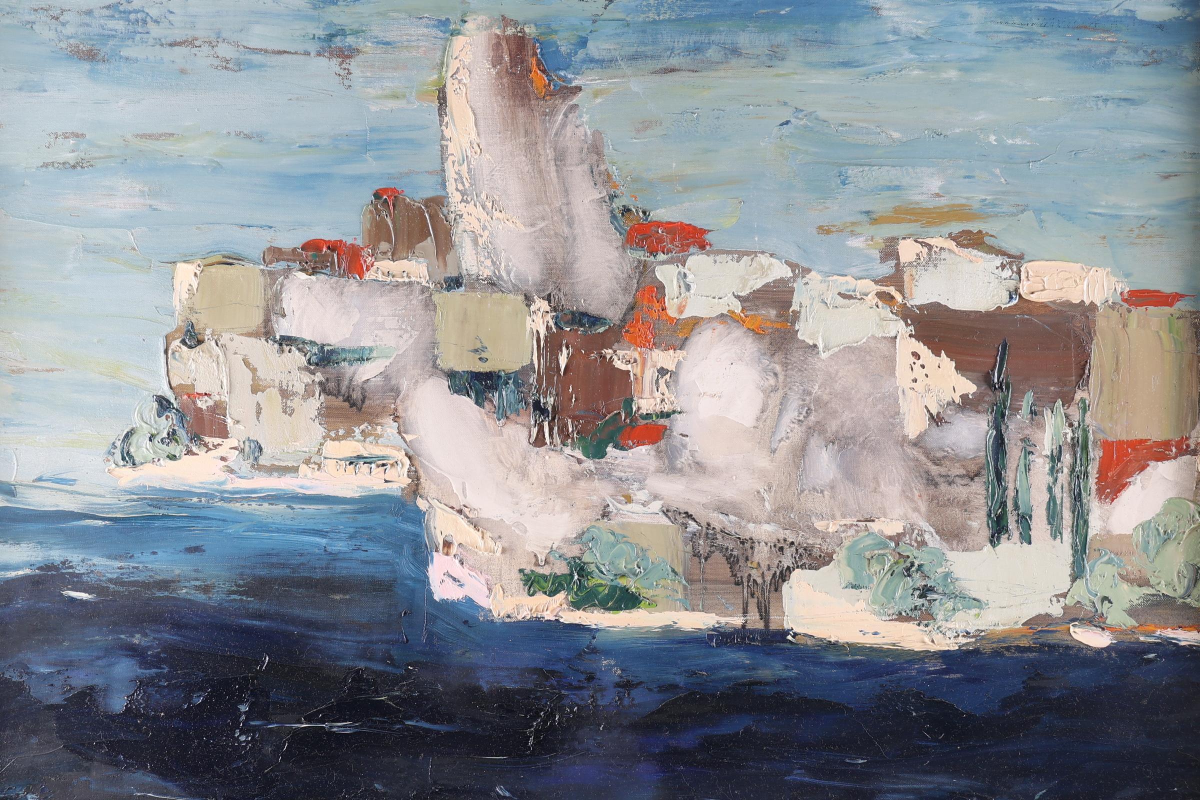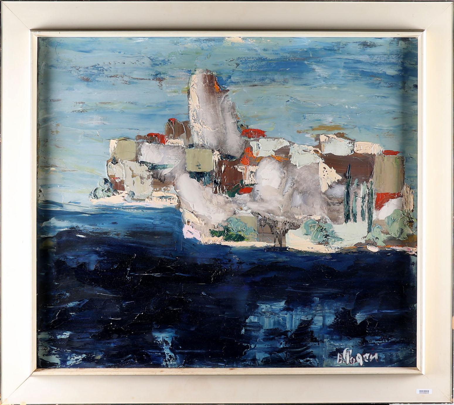 Brat Islava Pagon, Mediterraans dorpje aan zee, olieverf op doek, 70 x 80 cm.