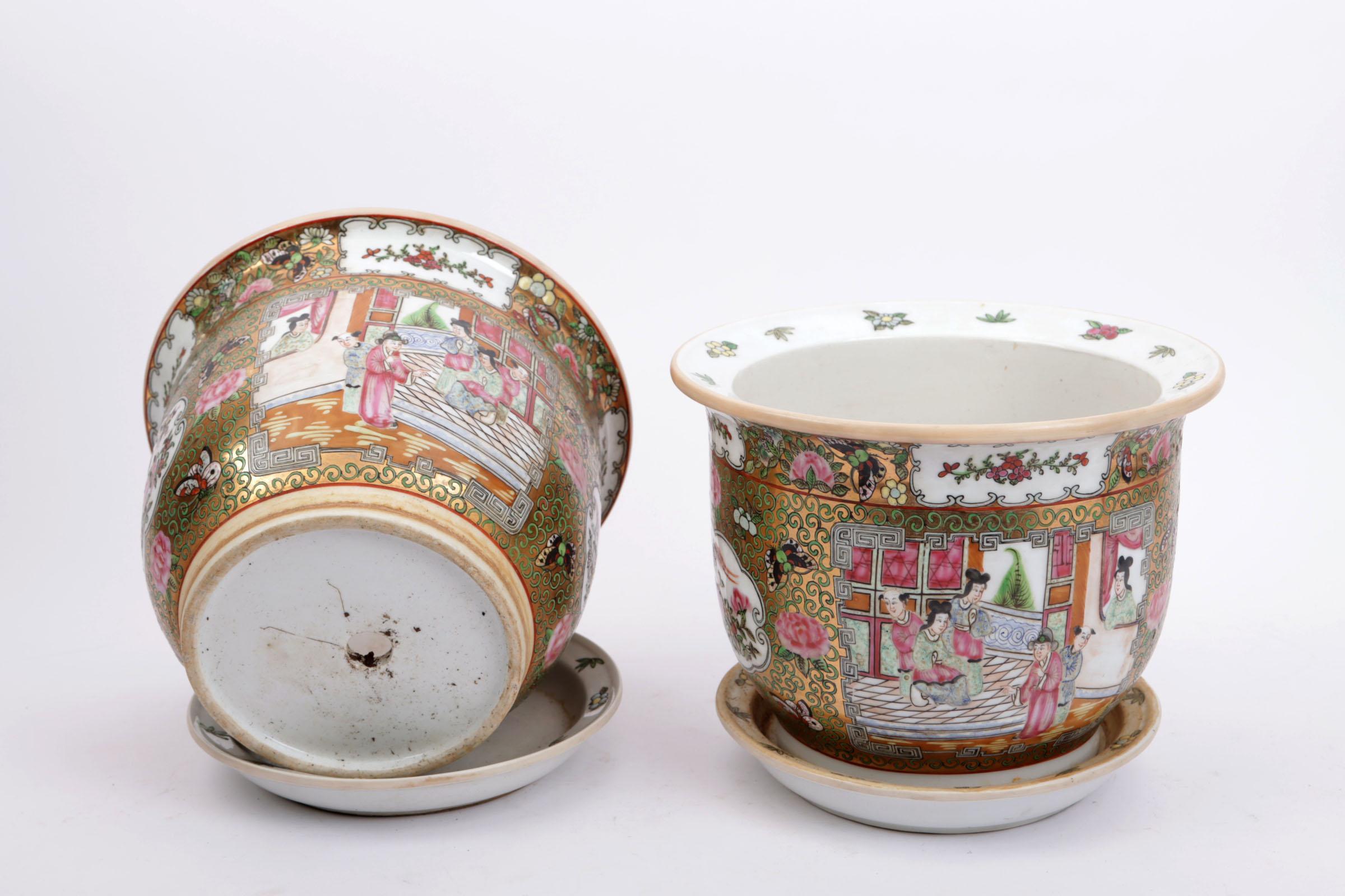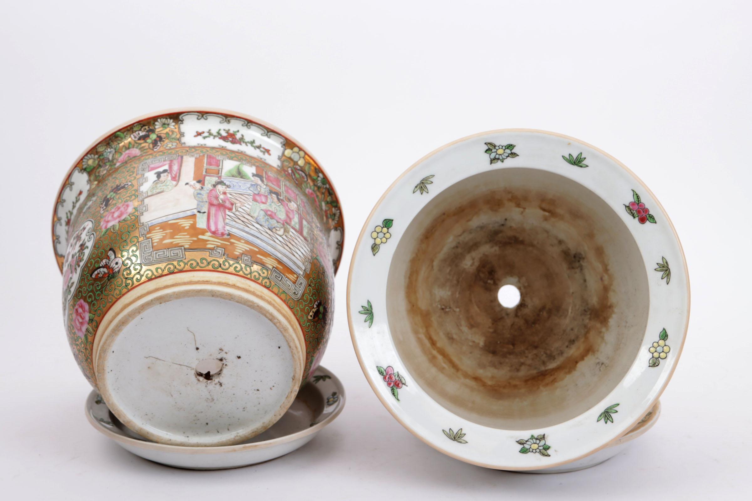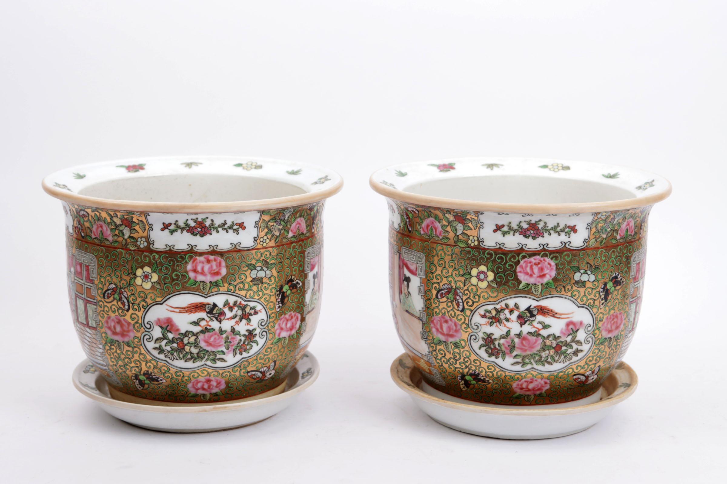 Stel Chinees porseleinen cache pots op onderschotel, h.19 cm.