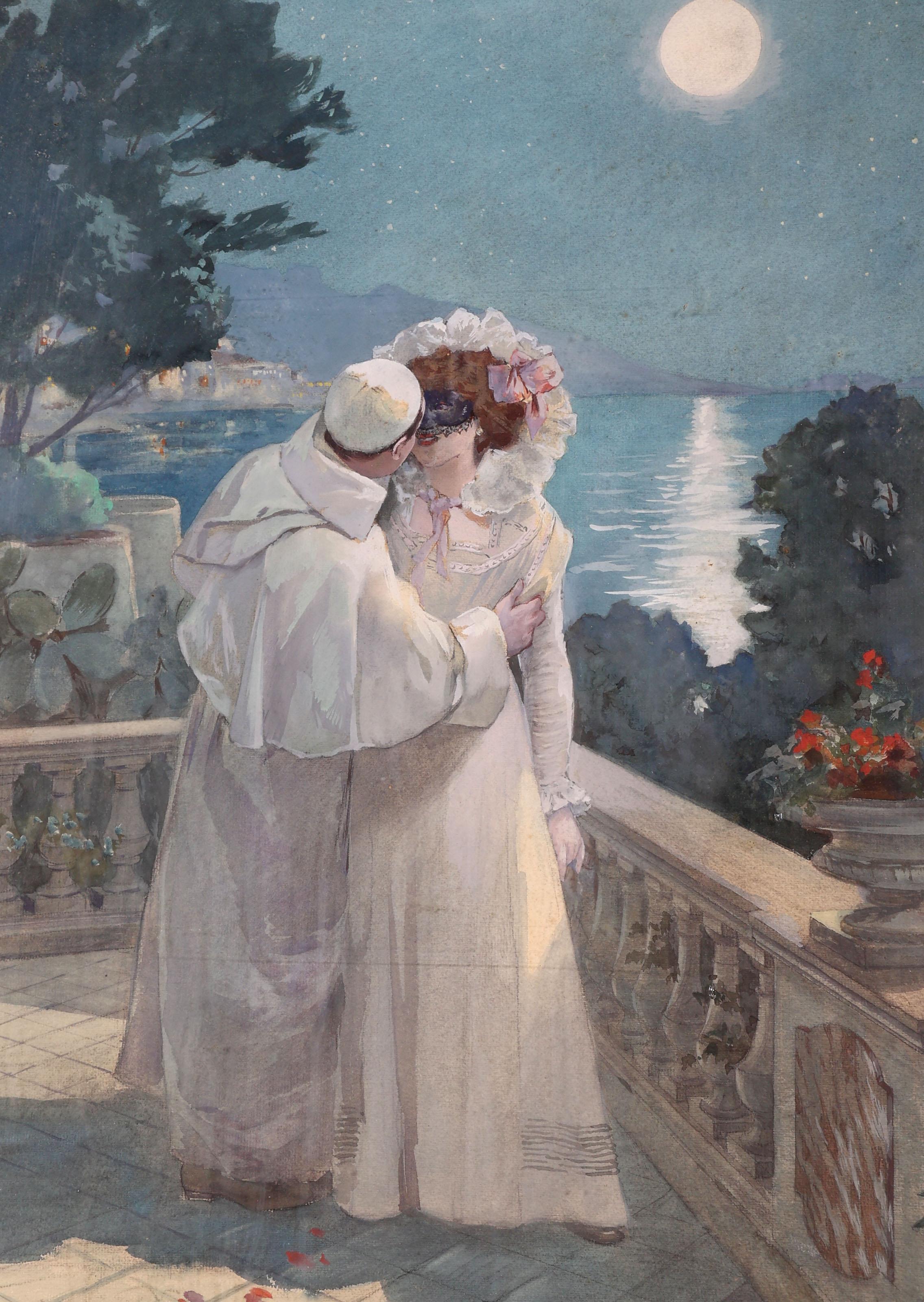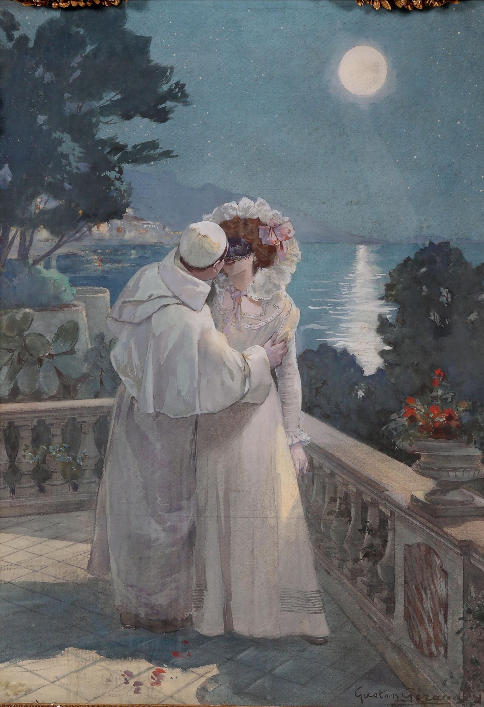 Gaston Gérard (1859), Balkonscène bij maanlicht, aquarel, 60 x 44 cm. (lijst licht beschadigd)