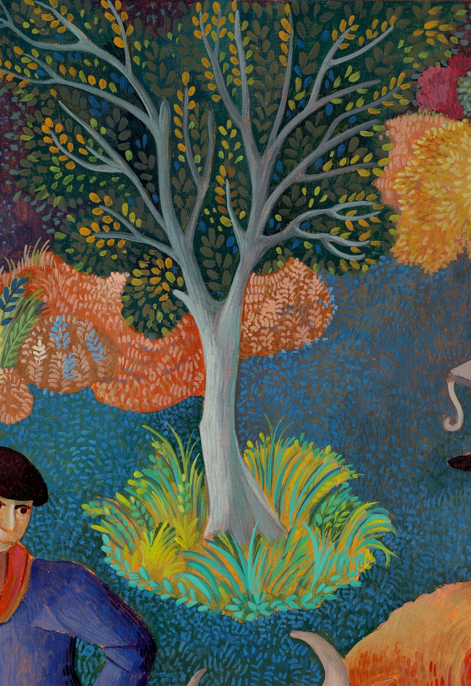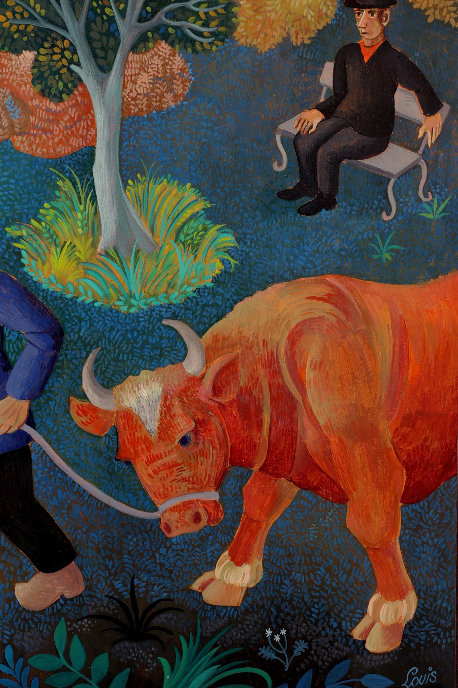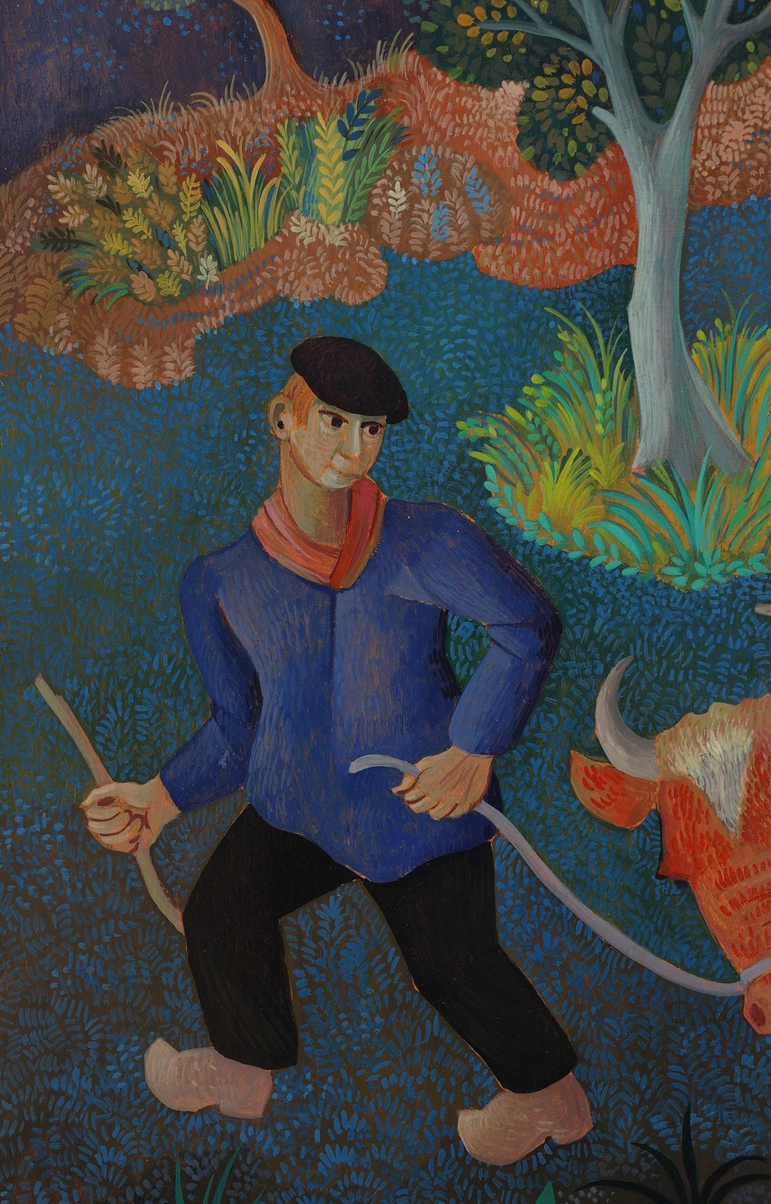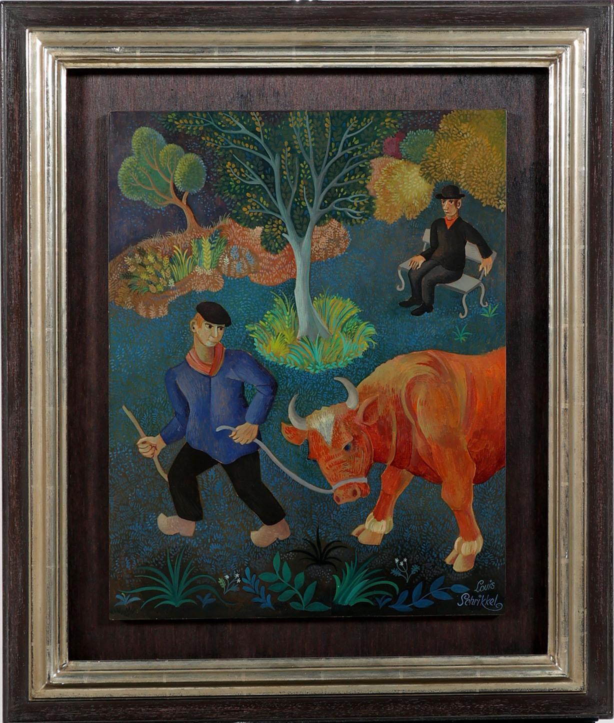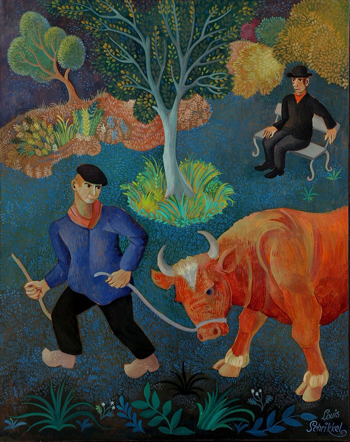 Louis Schrikkel (1903-1995), Boer met koe in landschap, olieverf op