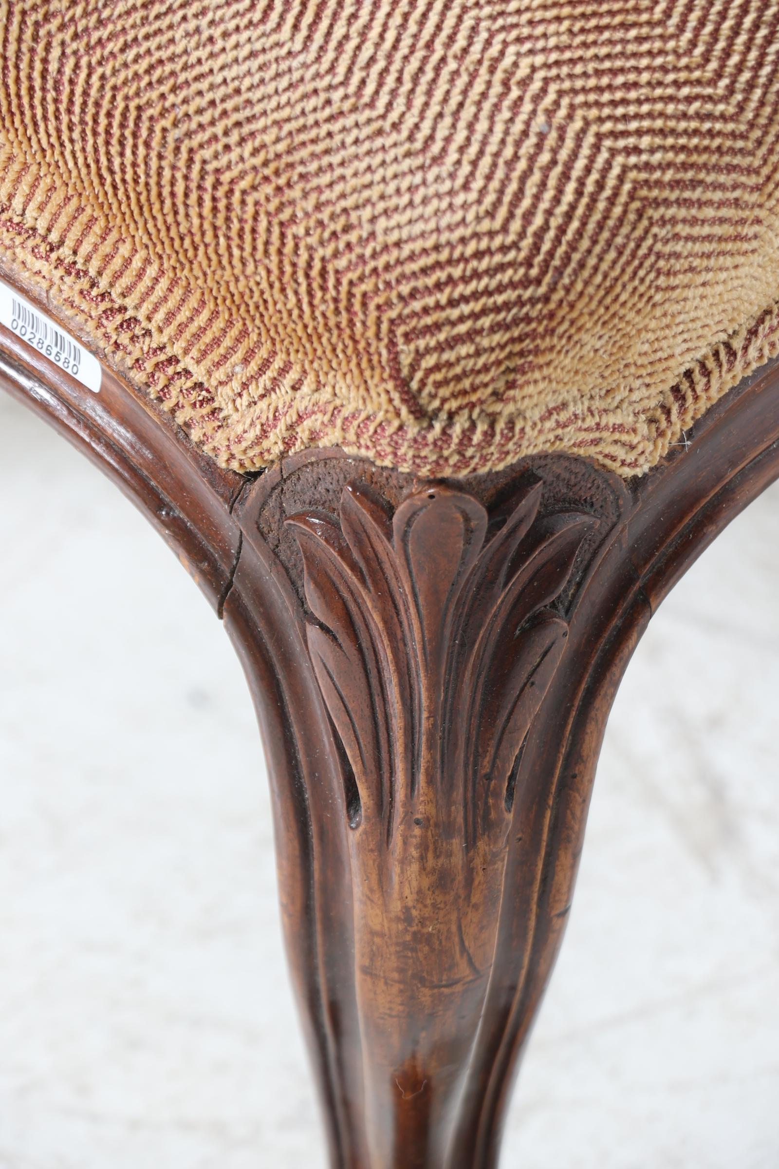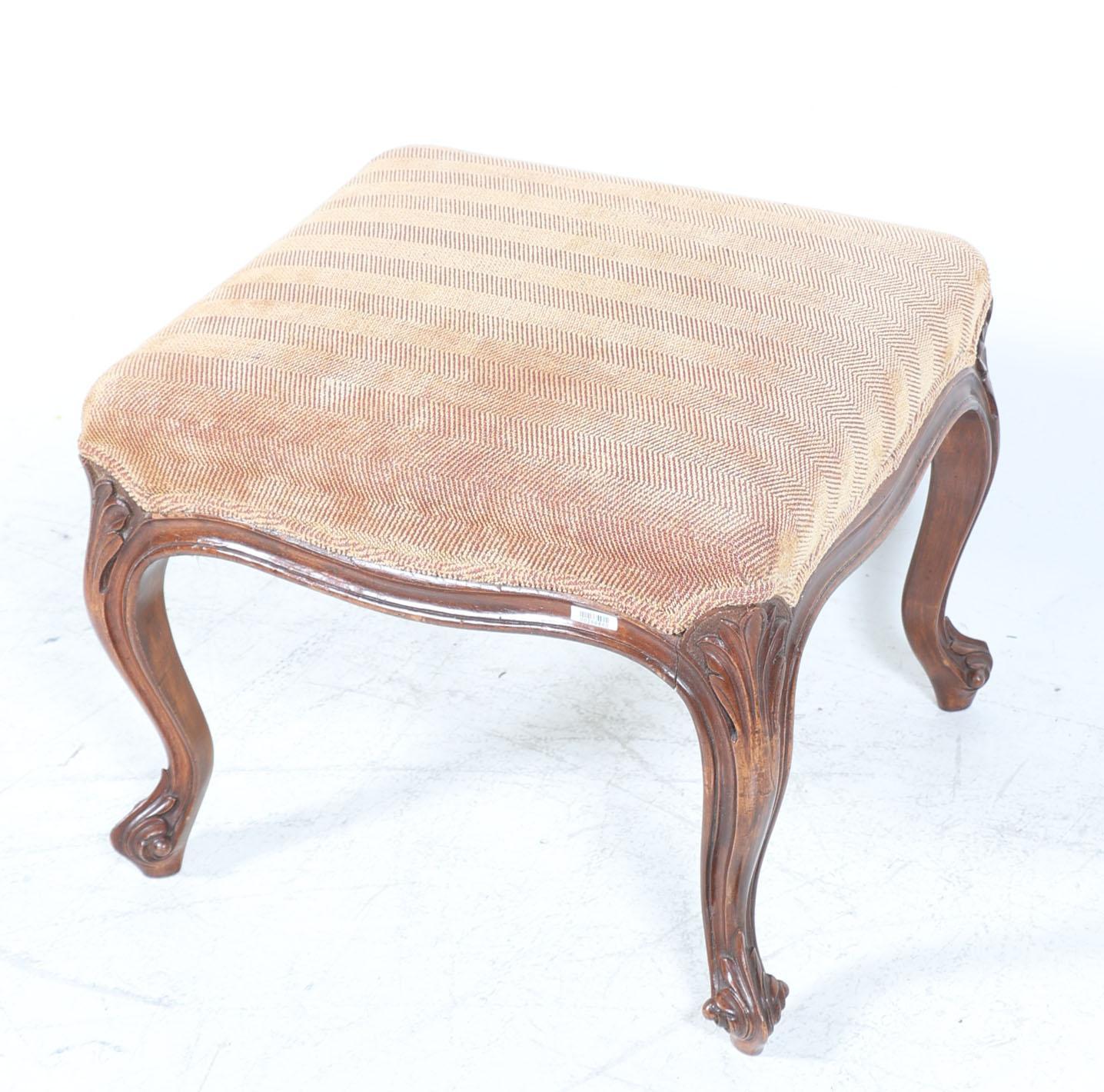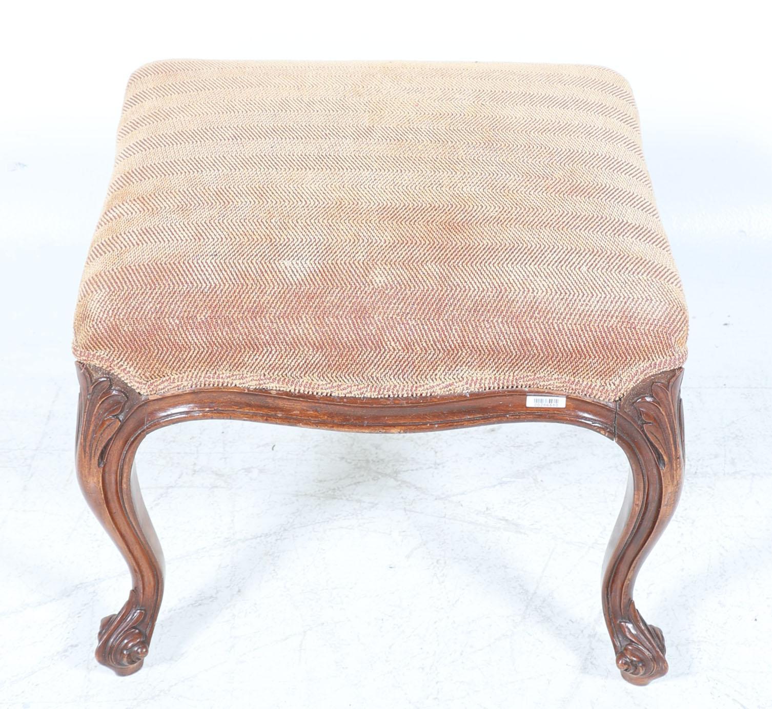 Notenhouten voetenbank met bruine stoffering