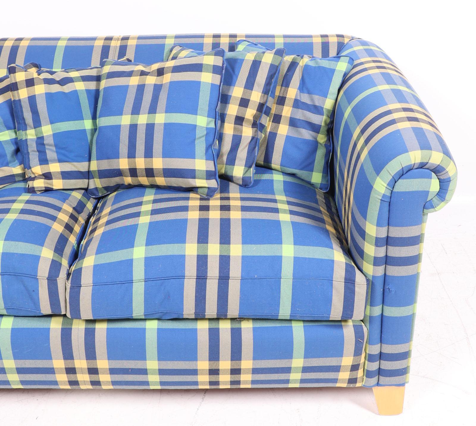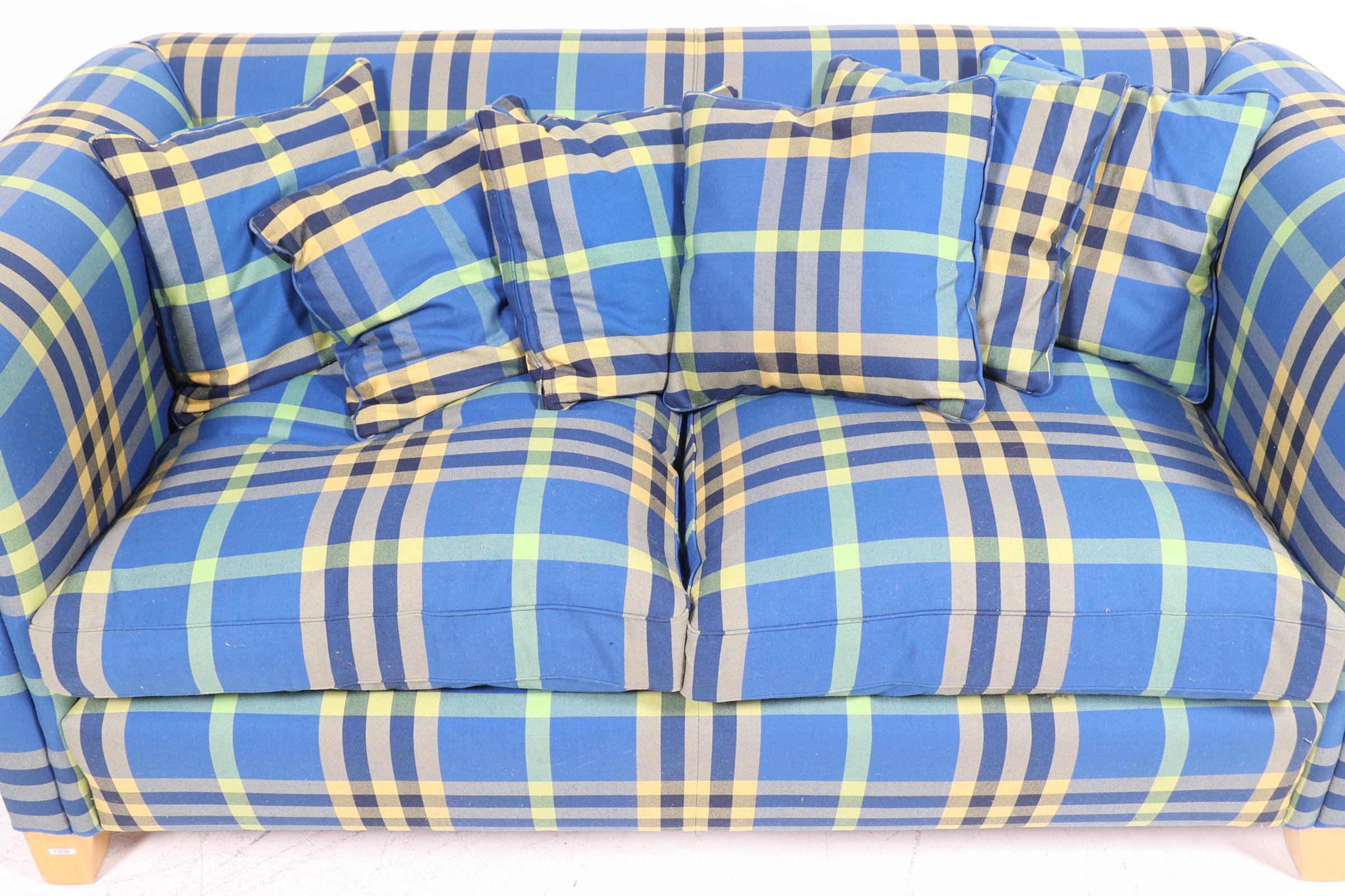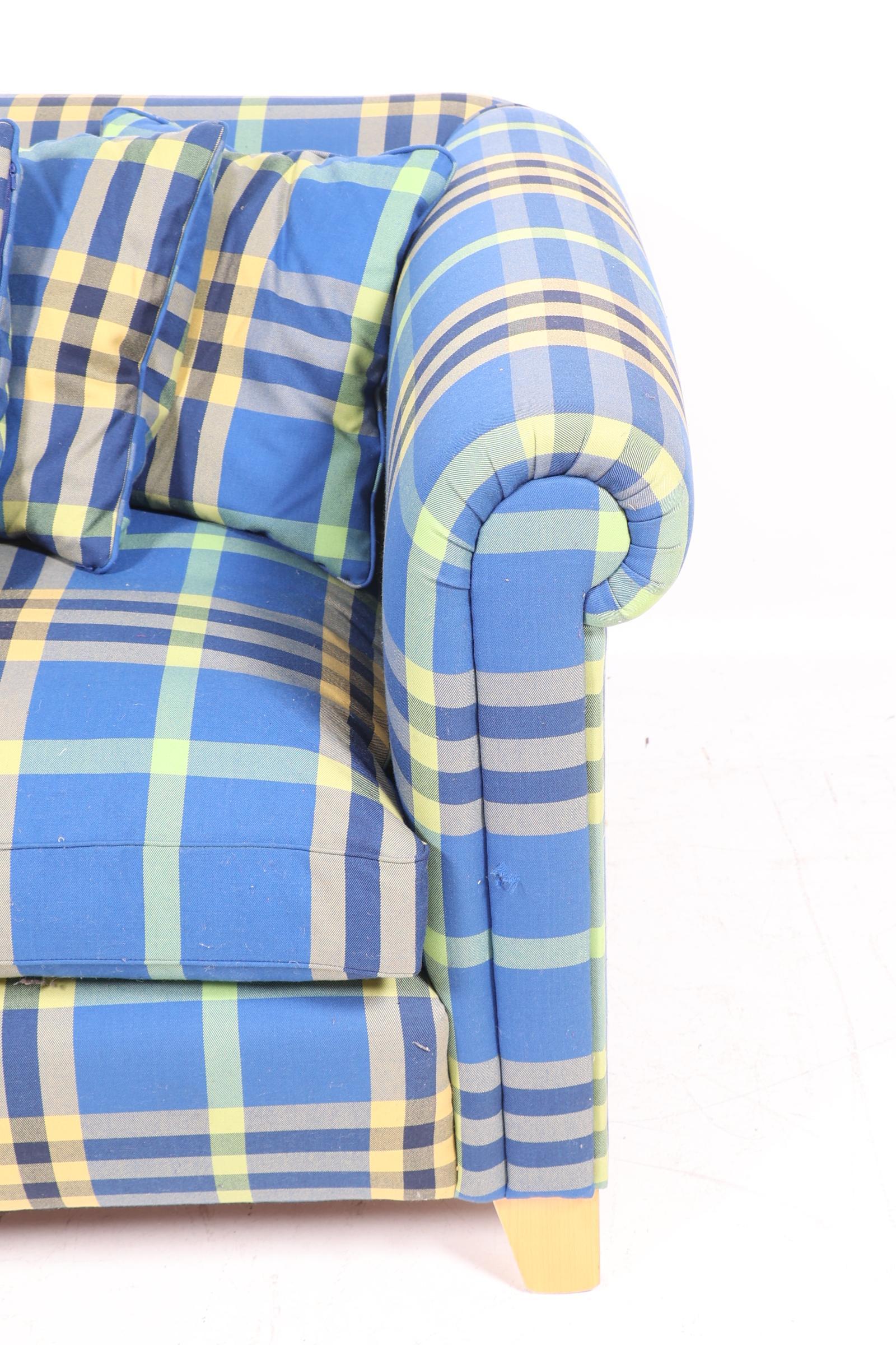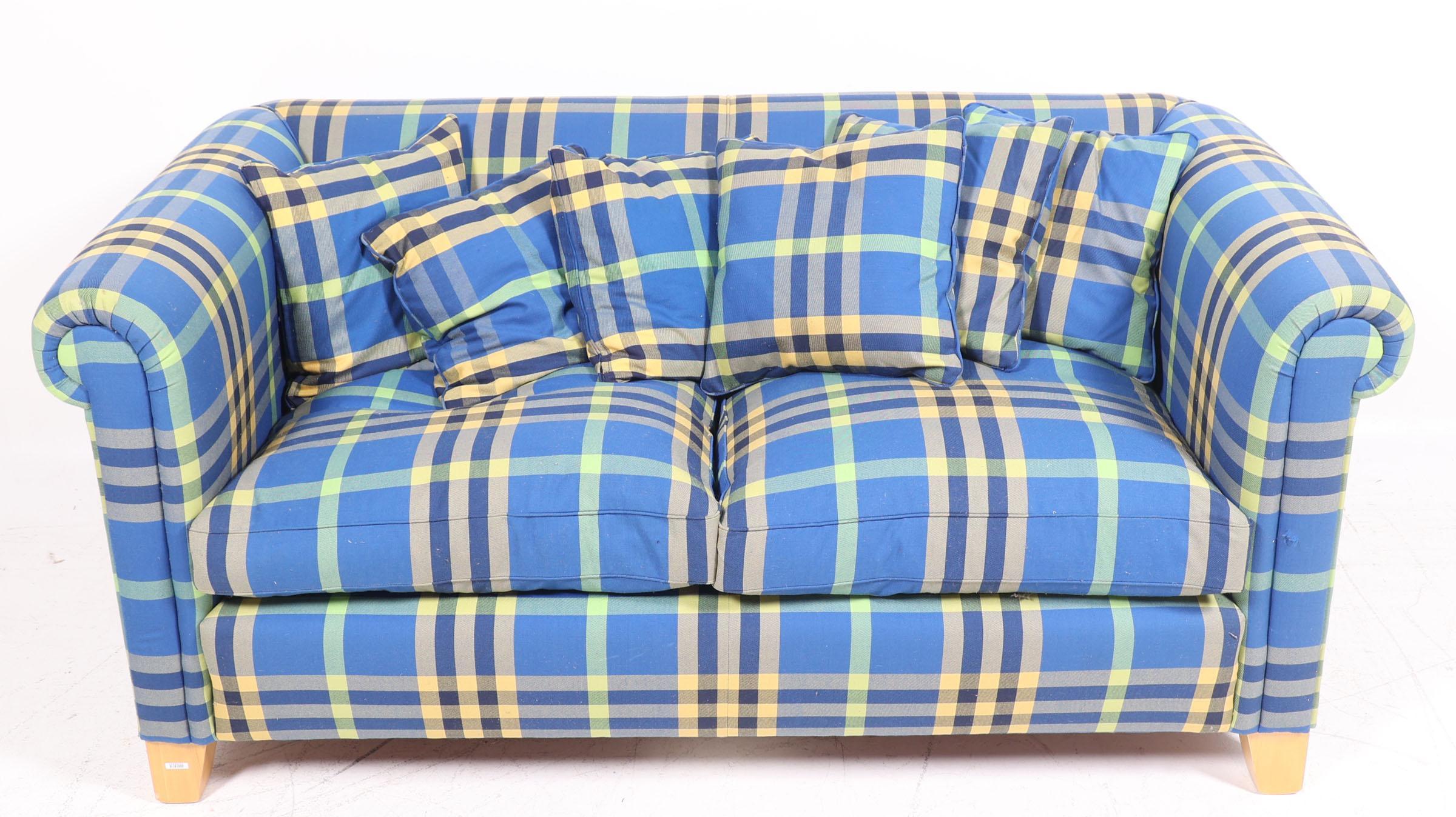Blauw/geel gestreepte 2-zits bank, h.82 x b.178 x d.95 cm. (scheurtje in bekleding)