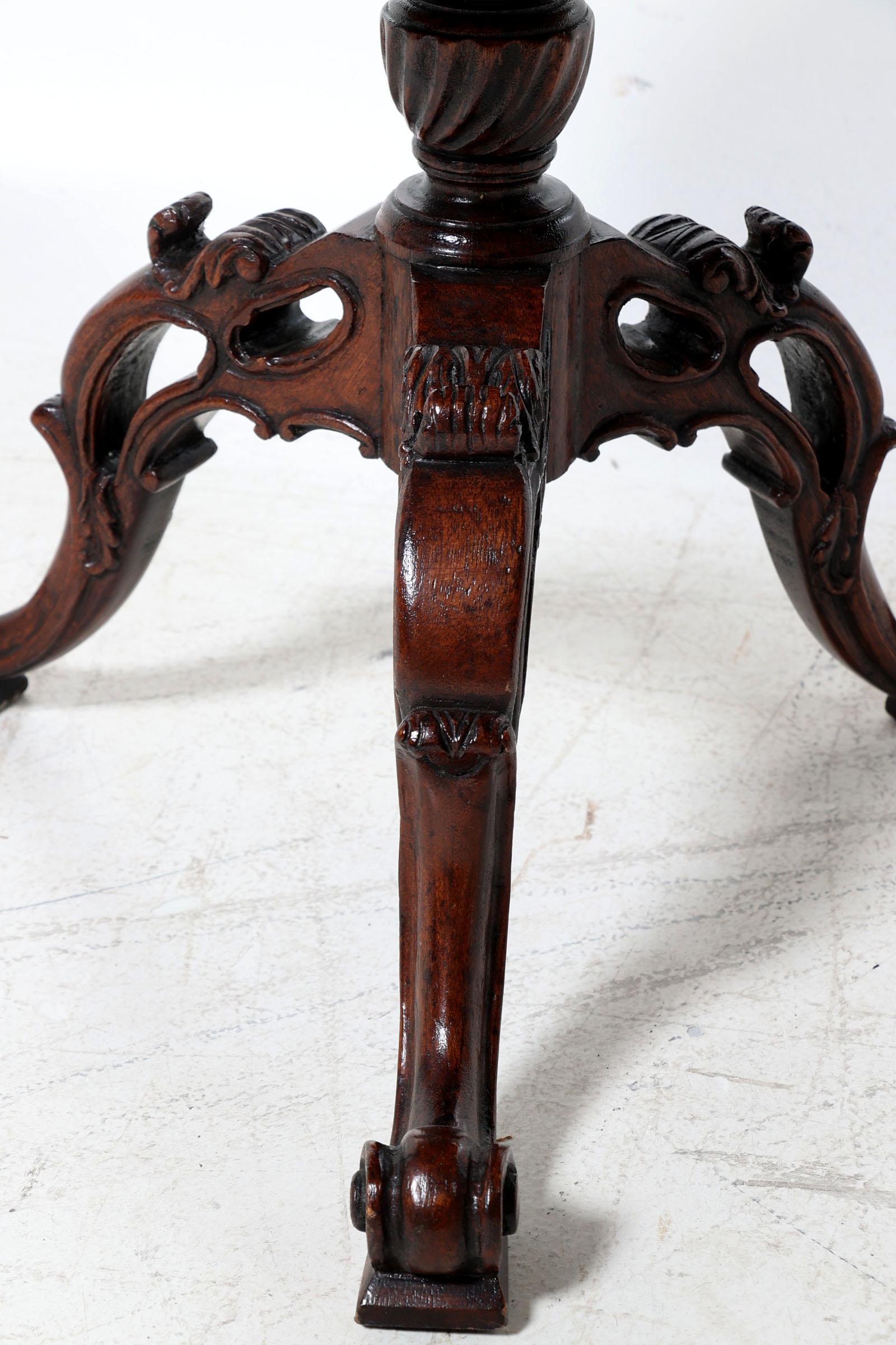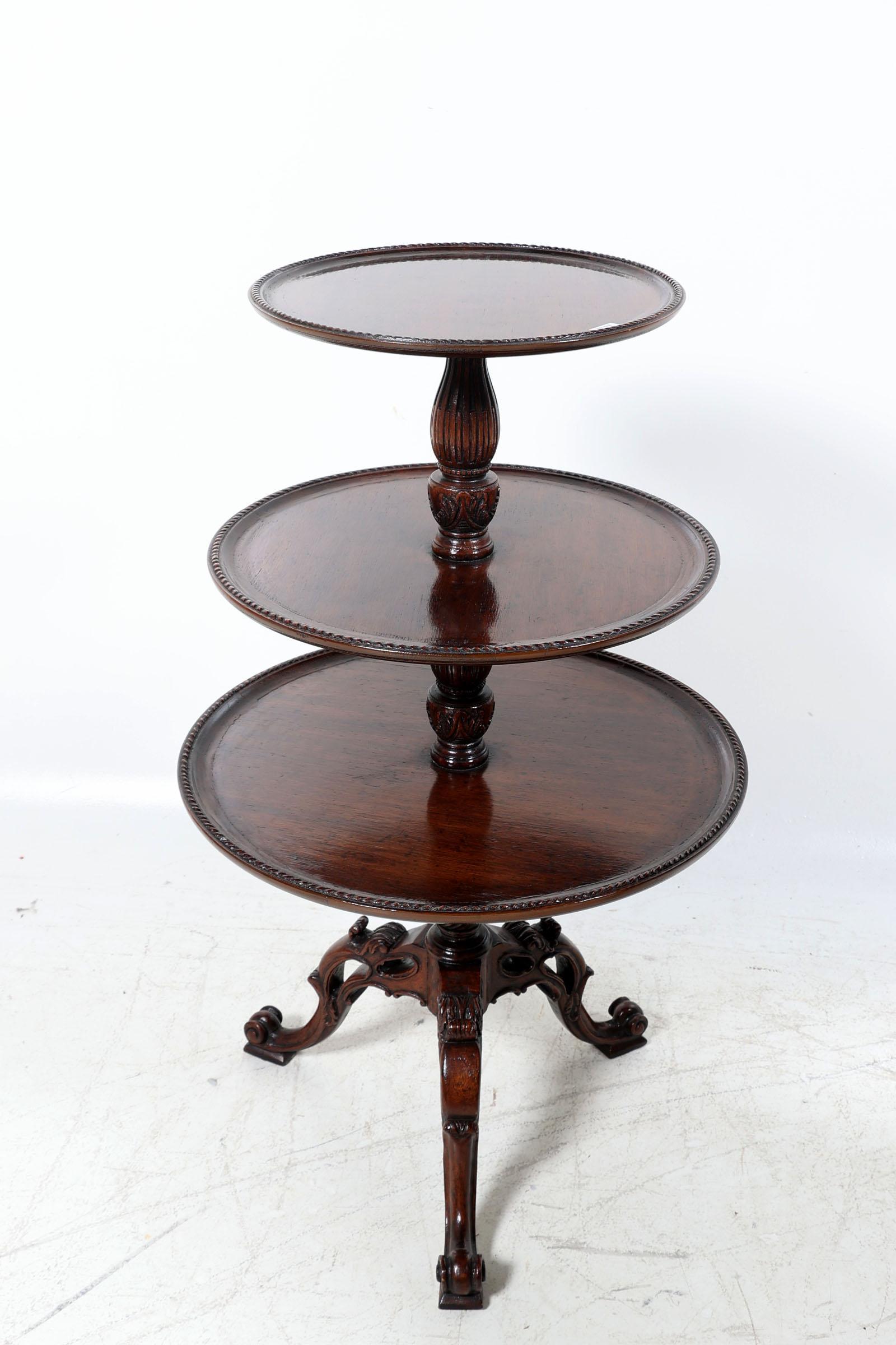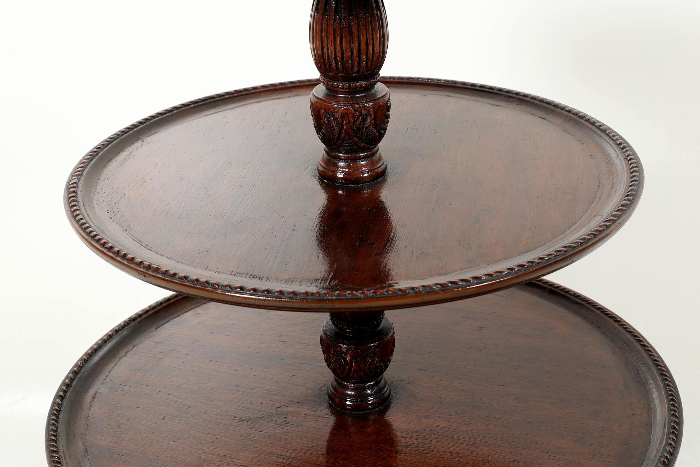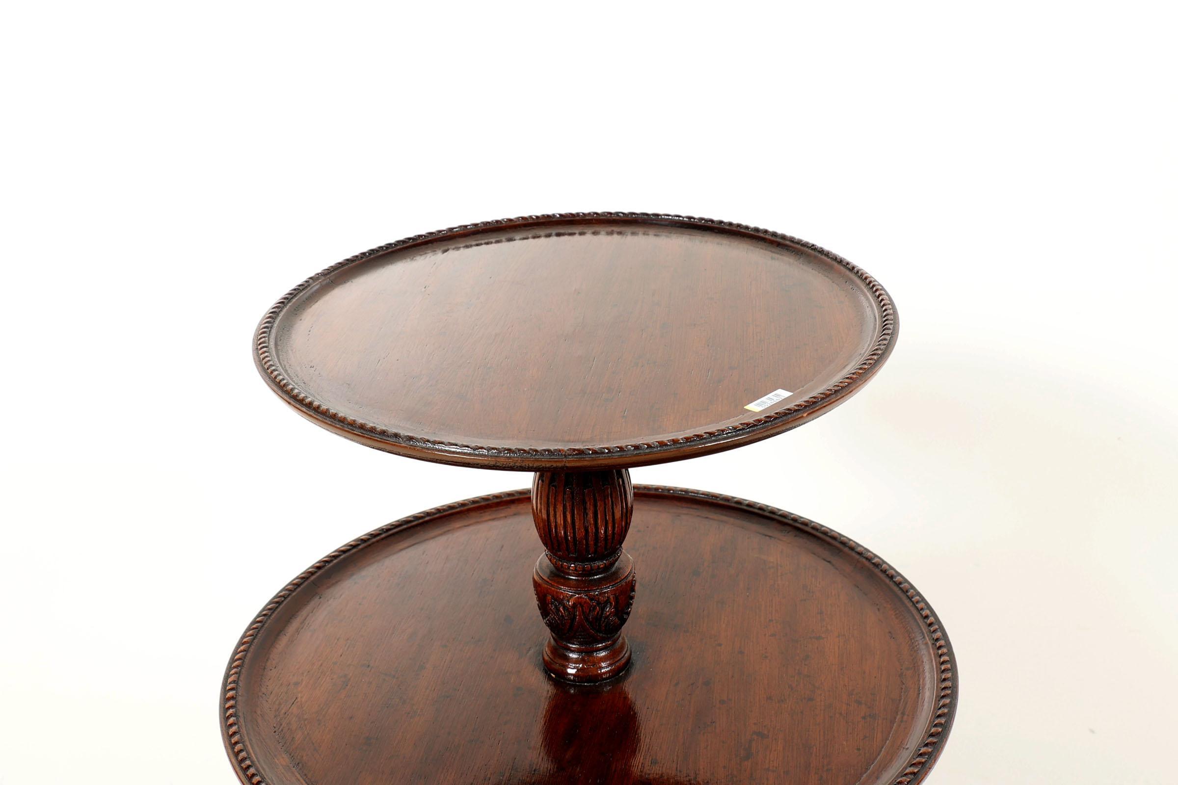 Set van 2 antieke eikenhouten etagère/bijzettafels zgn. "Domme Knecht", met deels opengewerkt onderstel en kabelranden, Engeland, George III, h.102 x diam.60 cm.
