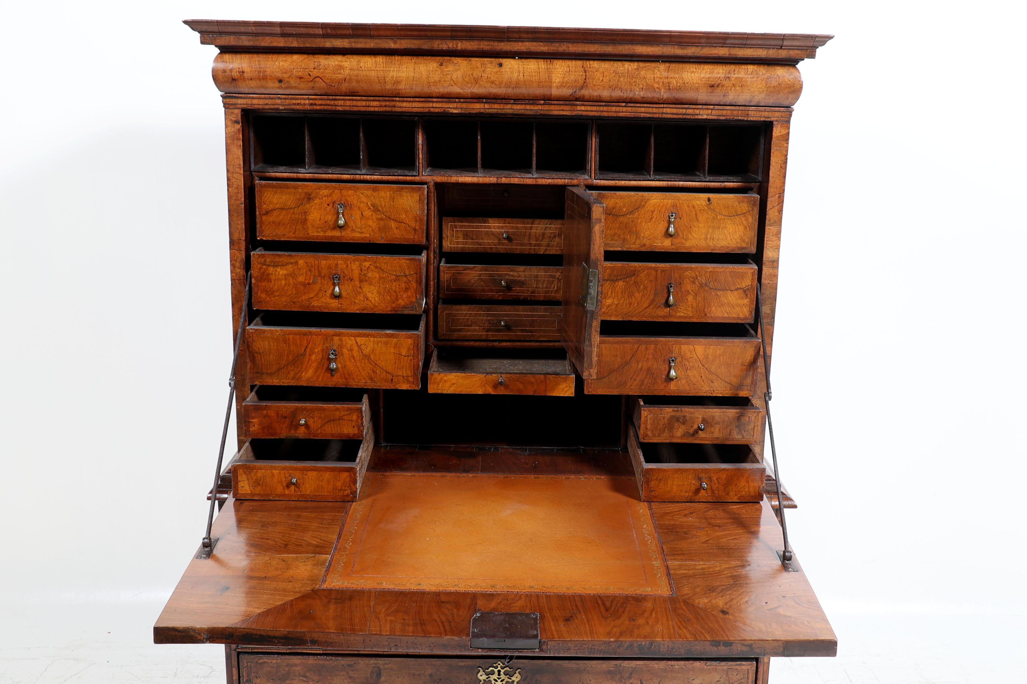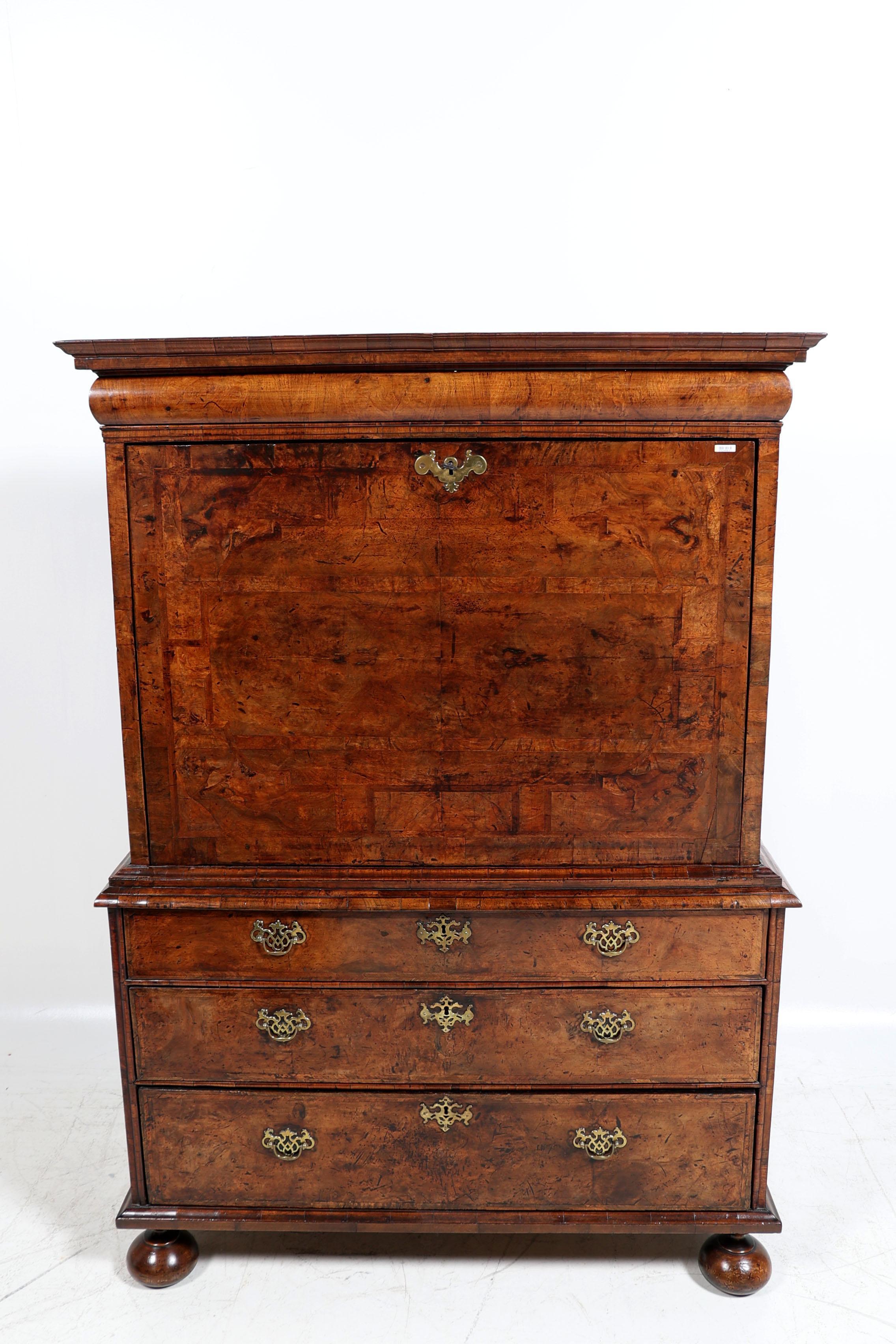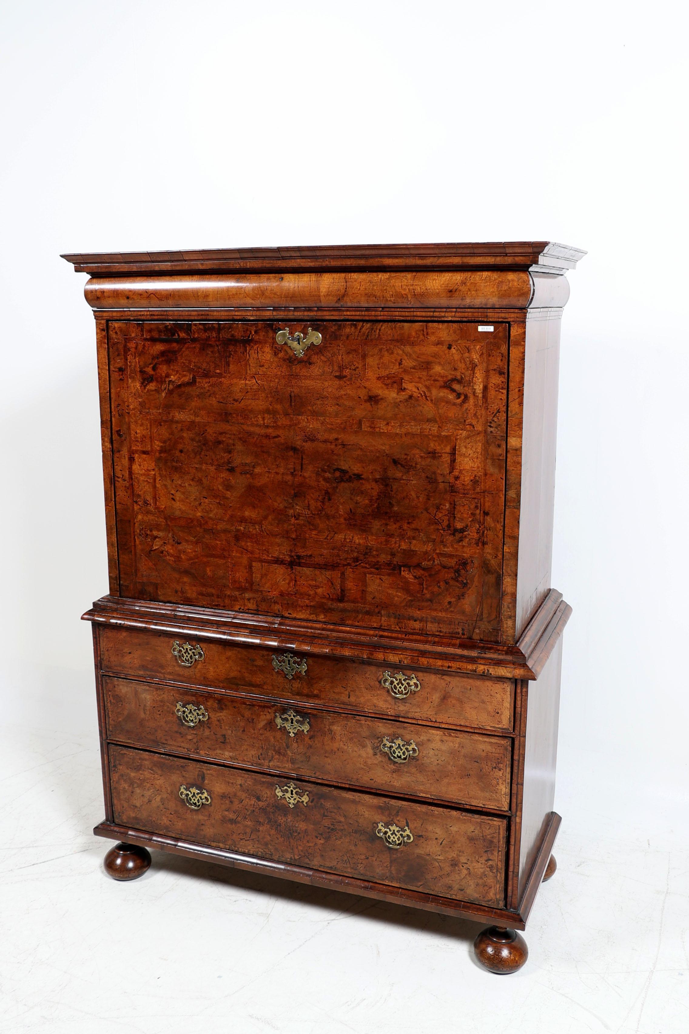 Antieke wortelnoten gefineerde secretaire a abbatant met koperen beslag en rustend op bolpoten, Engeland, William & Mary, h.169 x b.118 x d.53 cm.