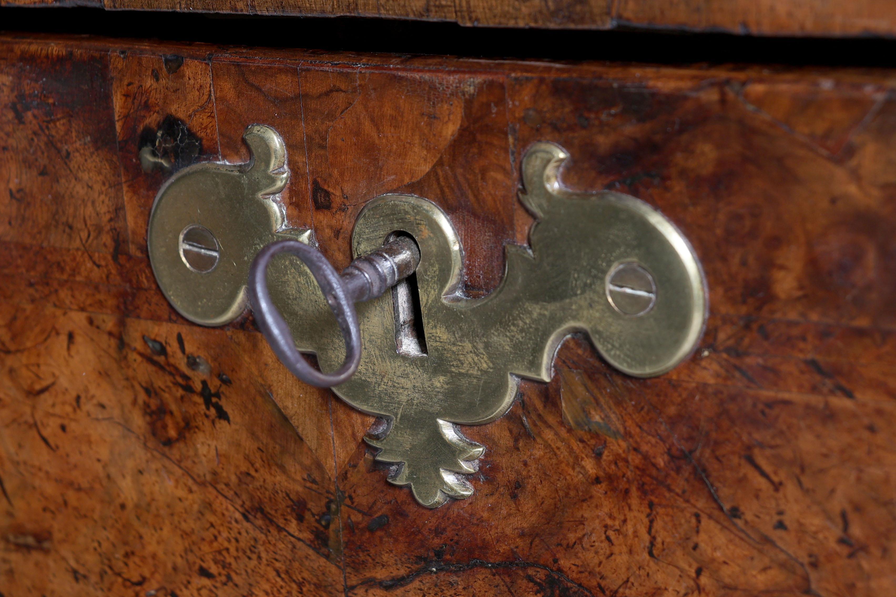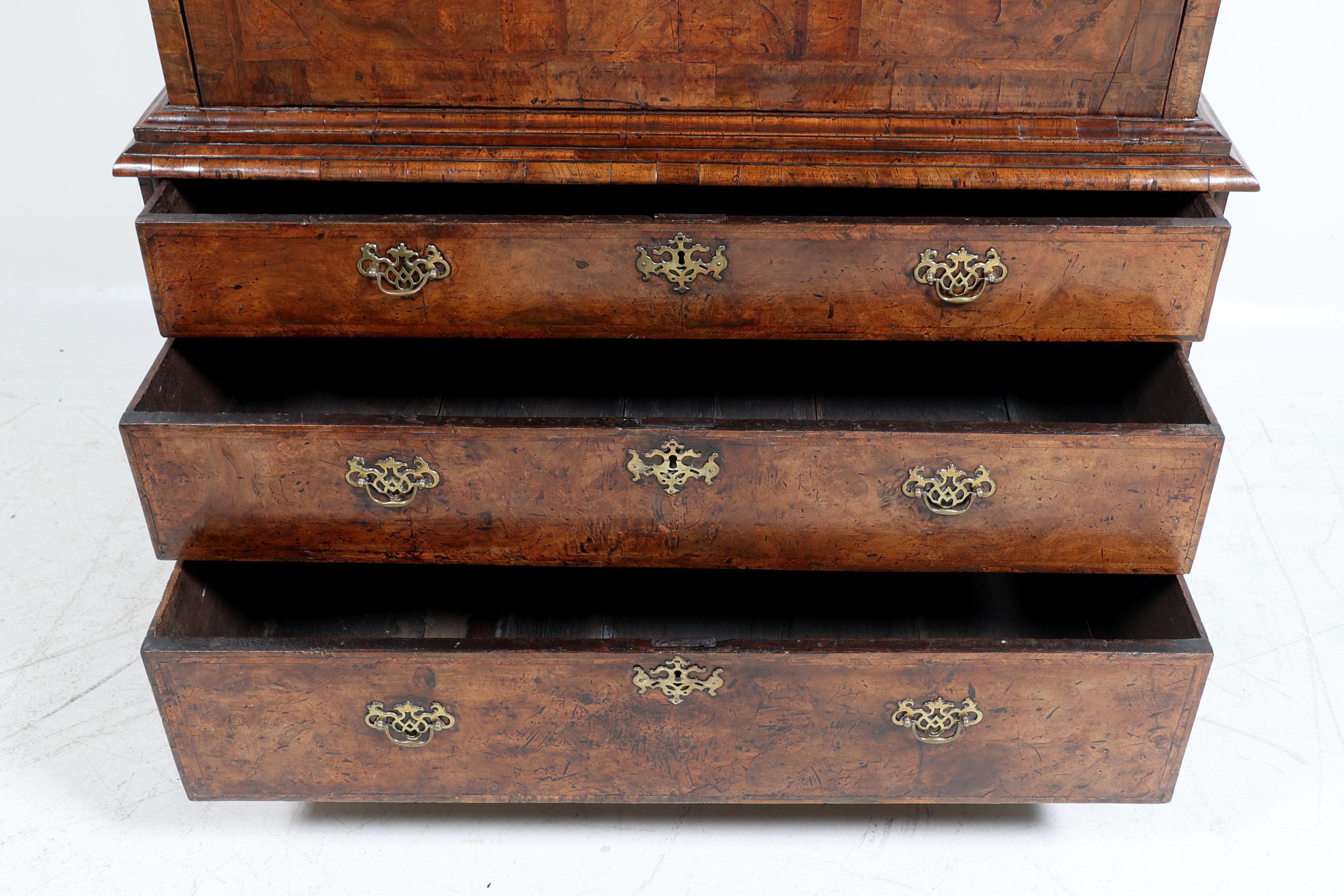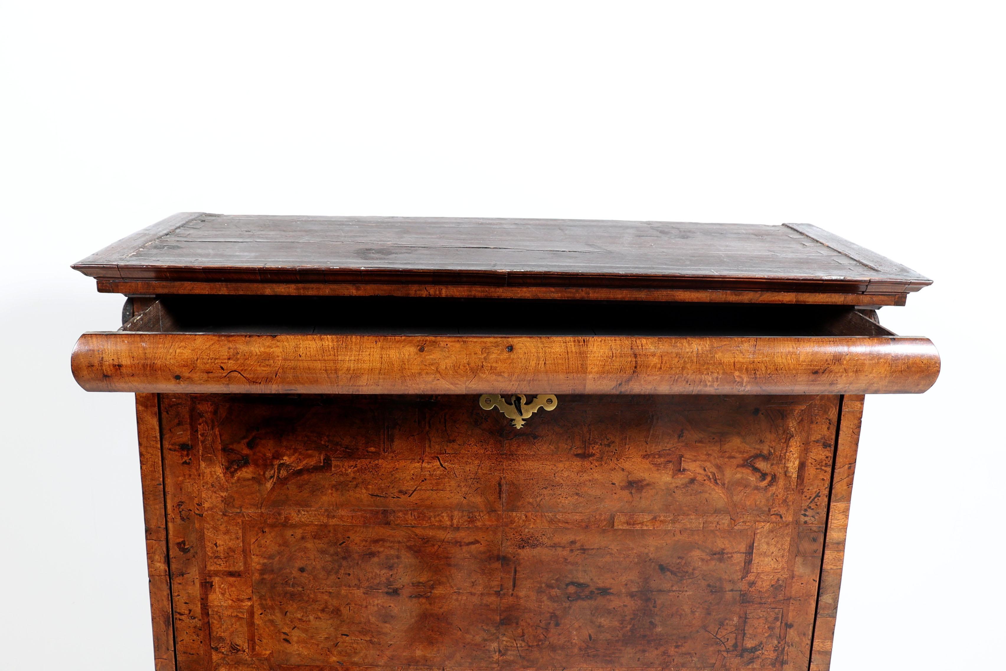 Antieke wortelnoten gefineerde secretaire a abbatant met koperen beslag en rustend op bolpoten, Engeland, William & Mary, h.169 x b.118 x d.53 cm.