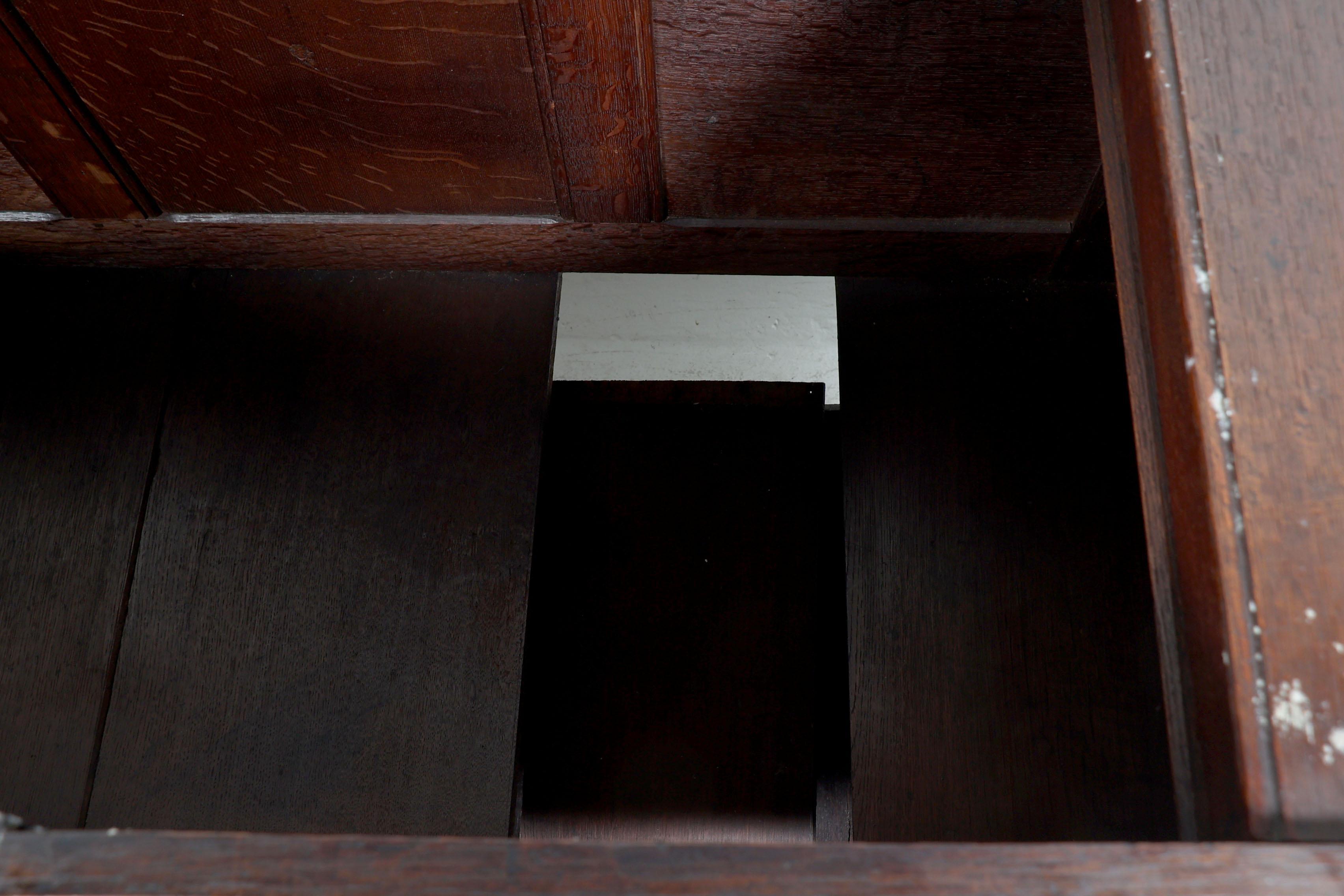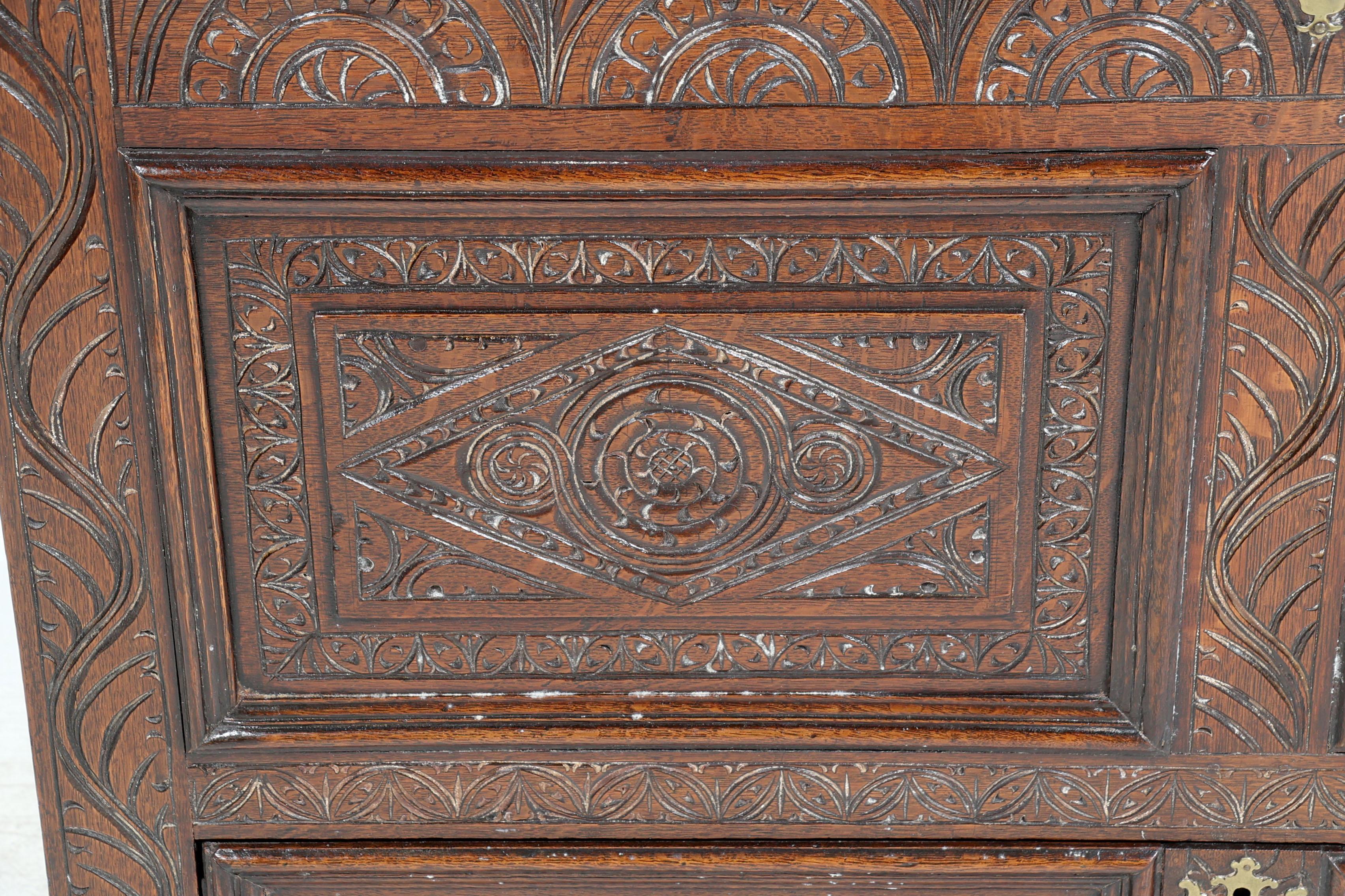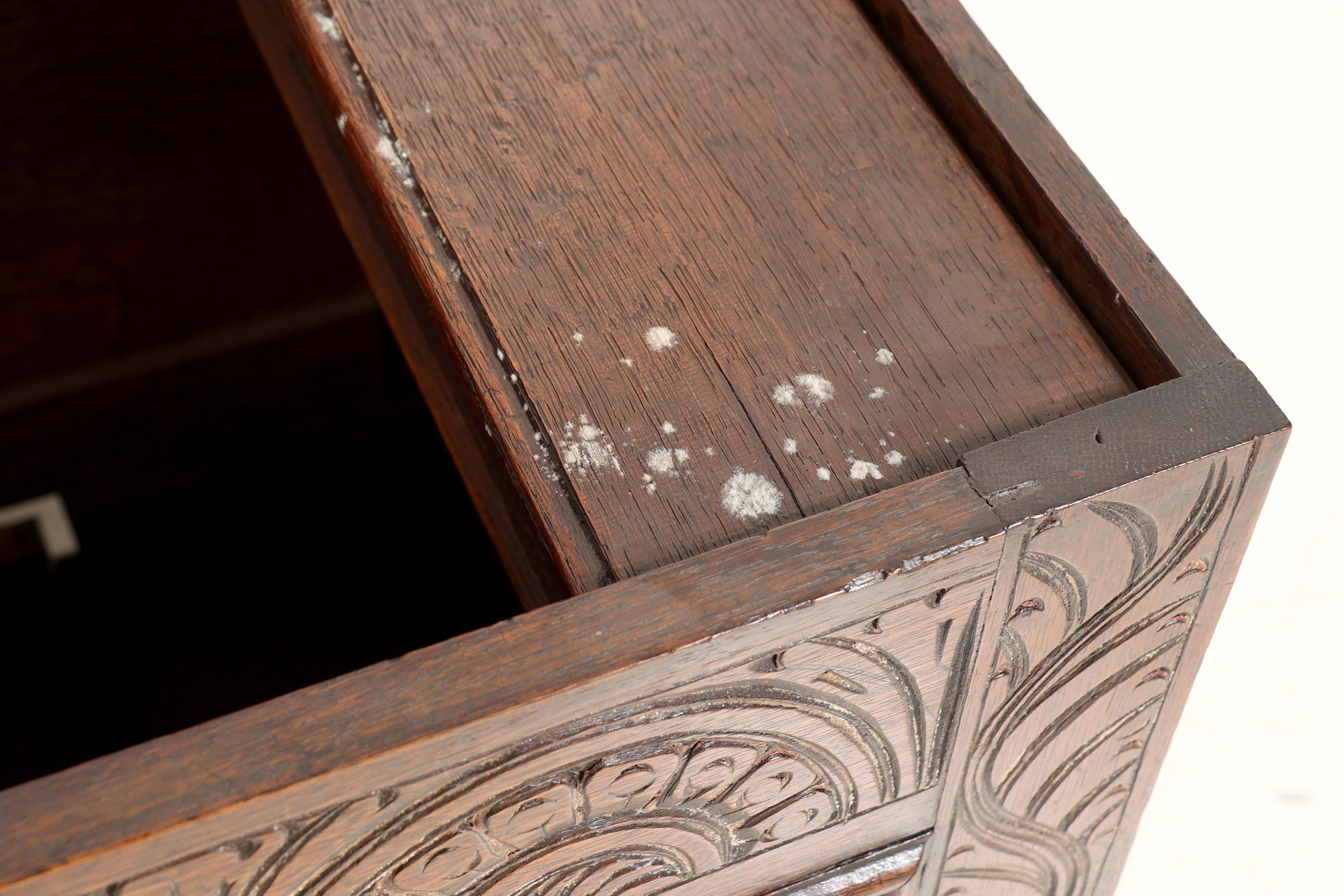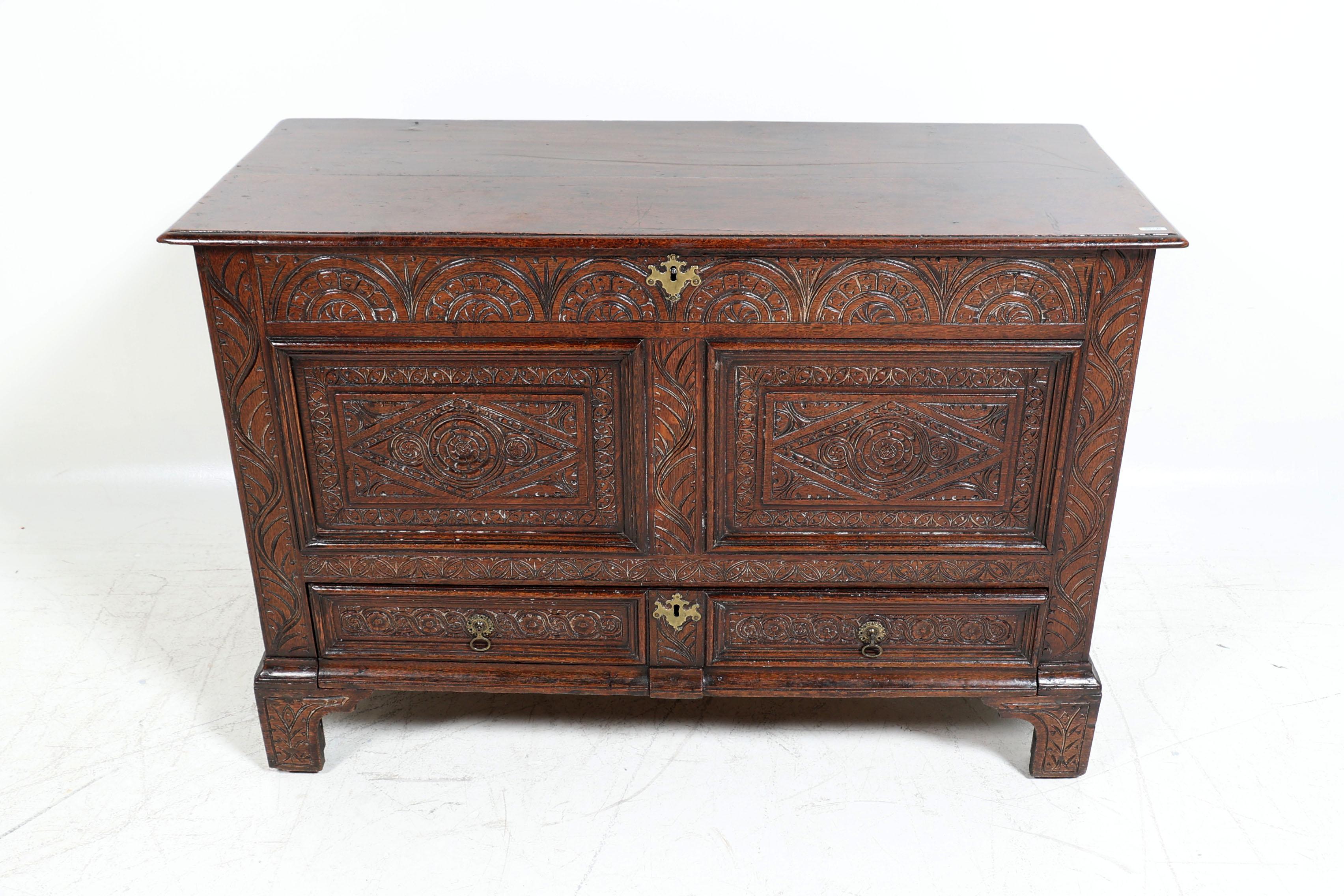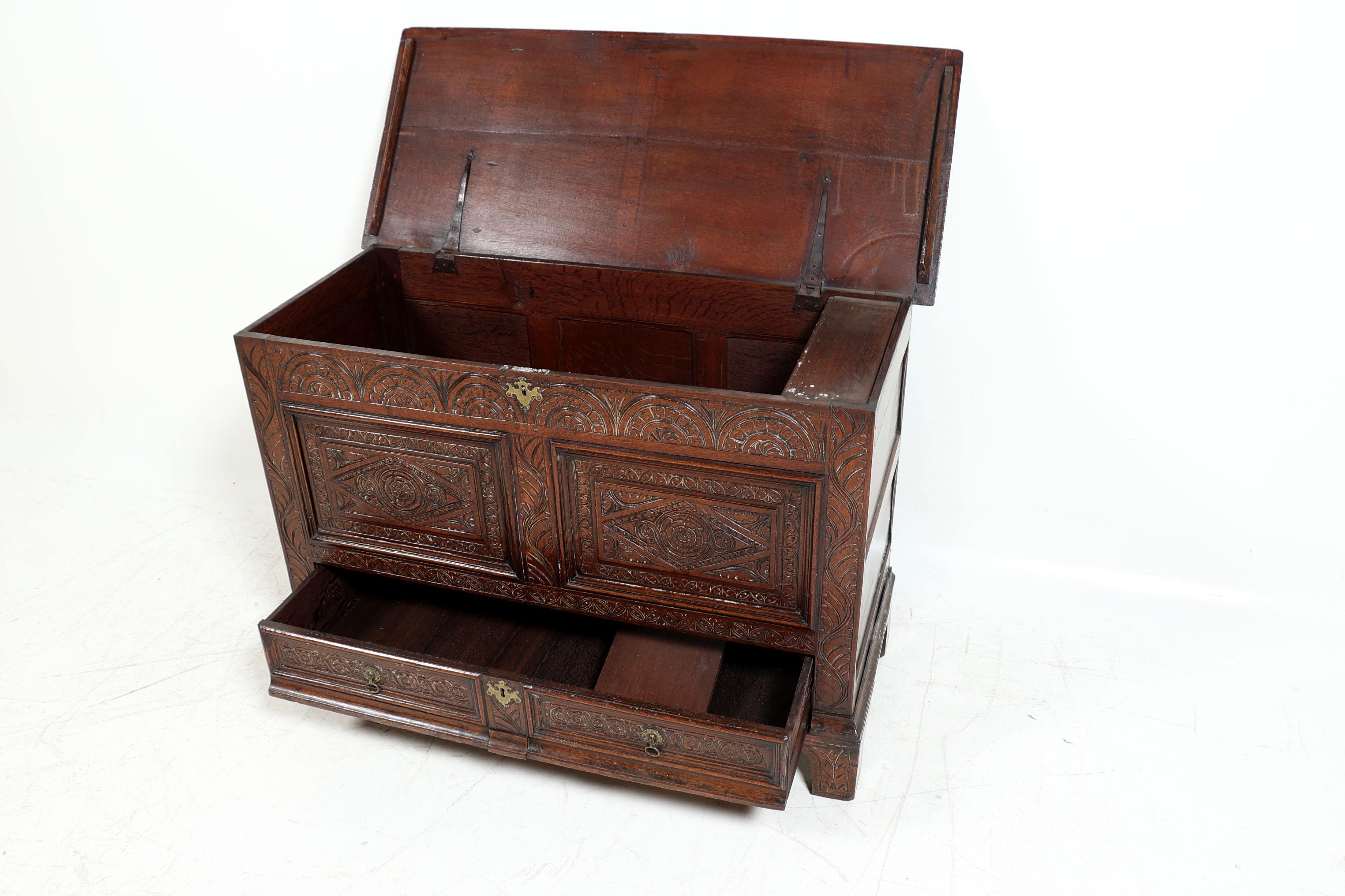 Antieke rijkbewerkte eikenhouten dekenkist met lade, h.86 x b.126 x d.53 cm.