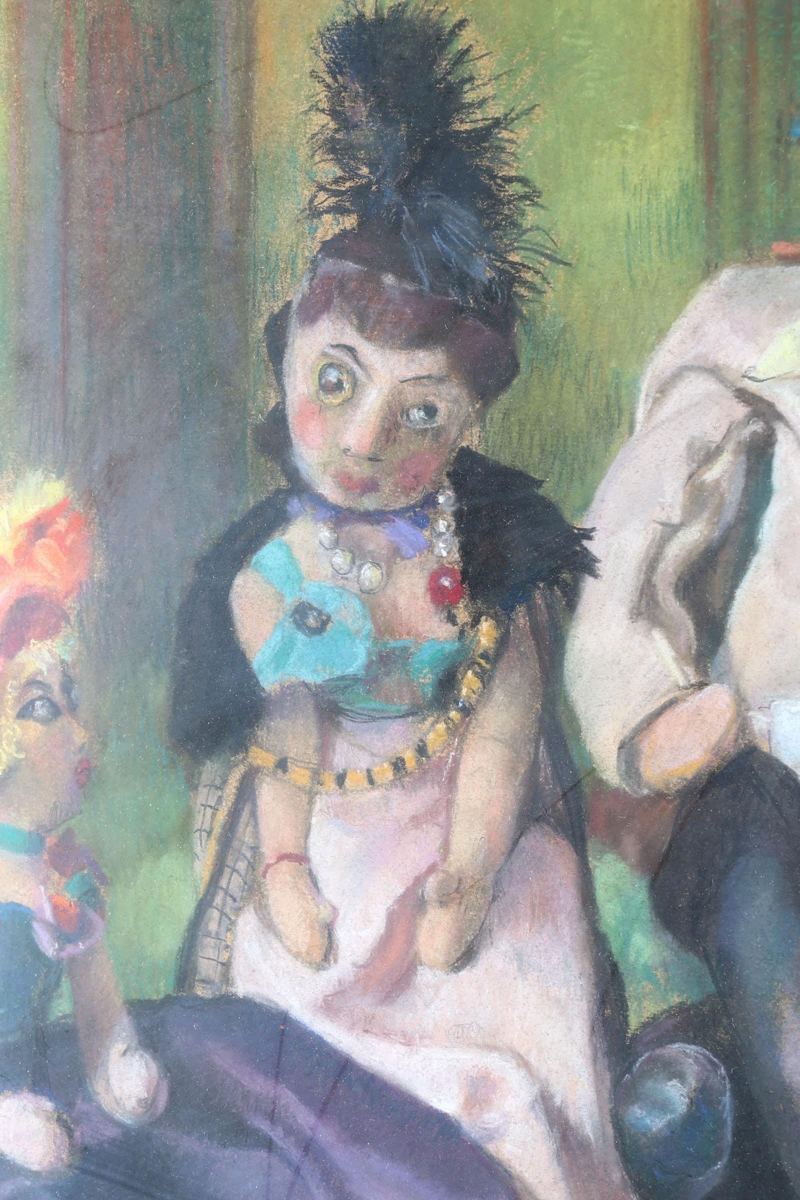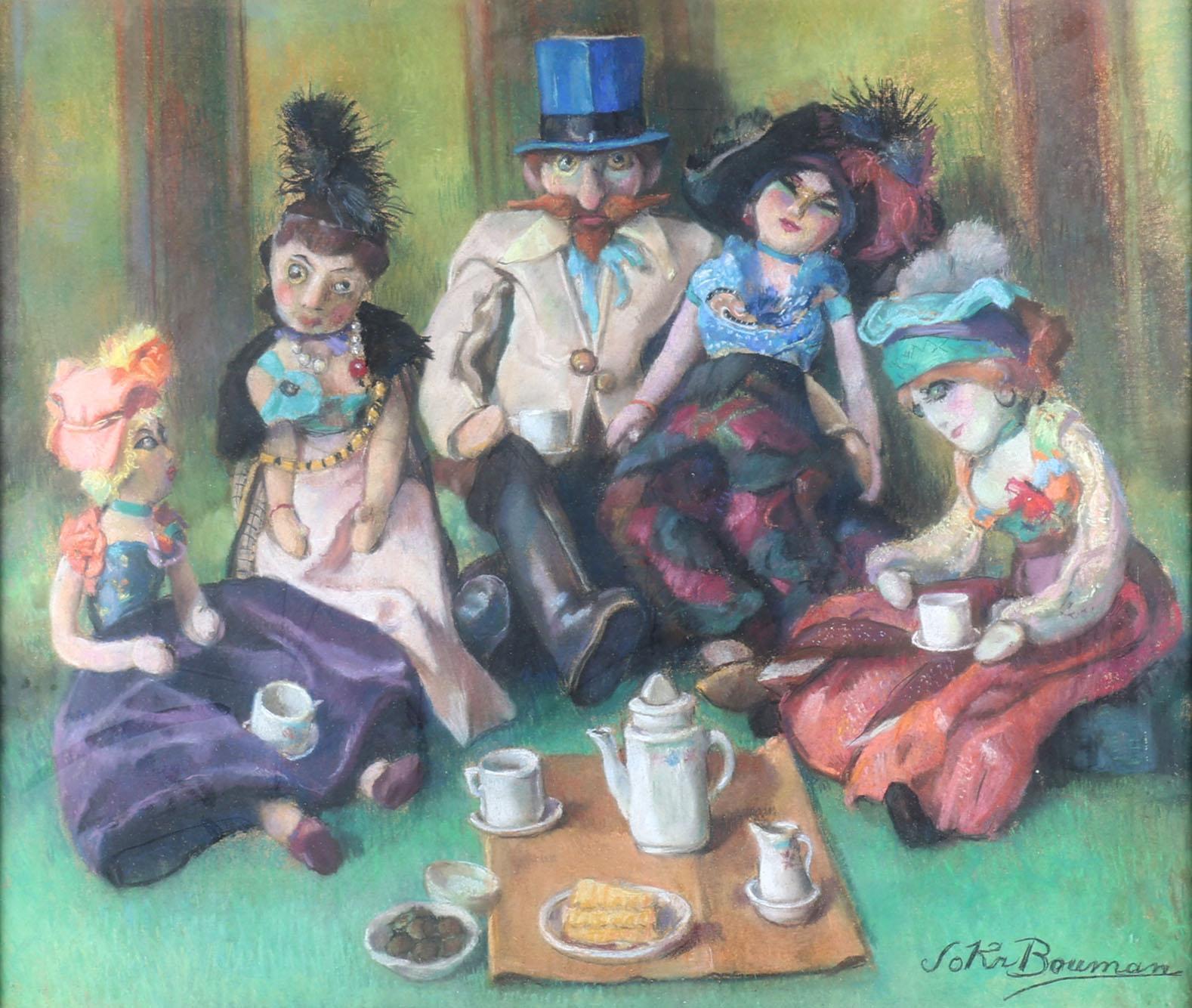Jo Kruyder-Bouman (1886-1973), Vijf poppen in interieur, pasteltekening, 73 x 62 cm.