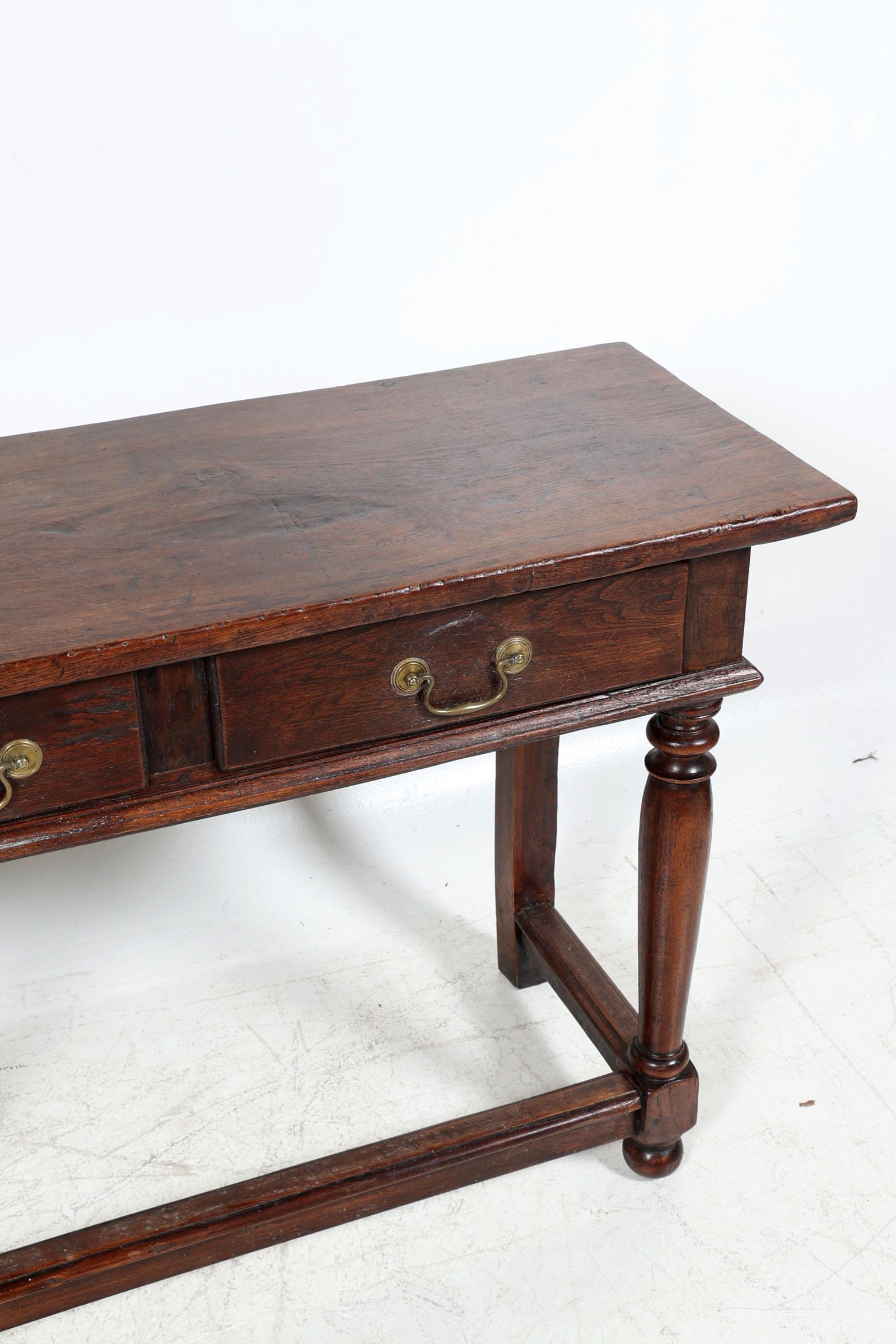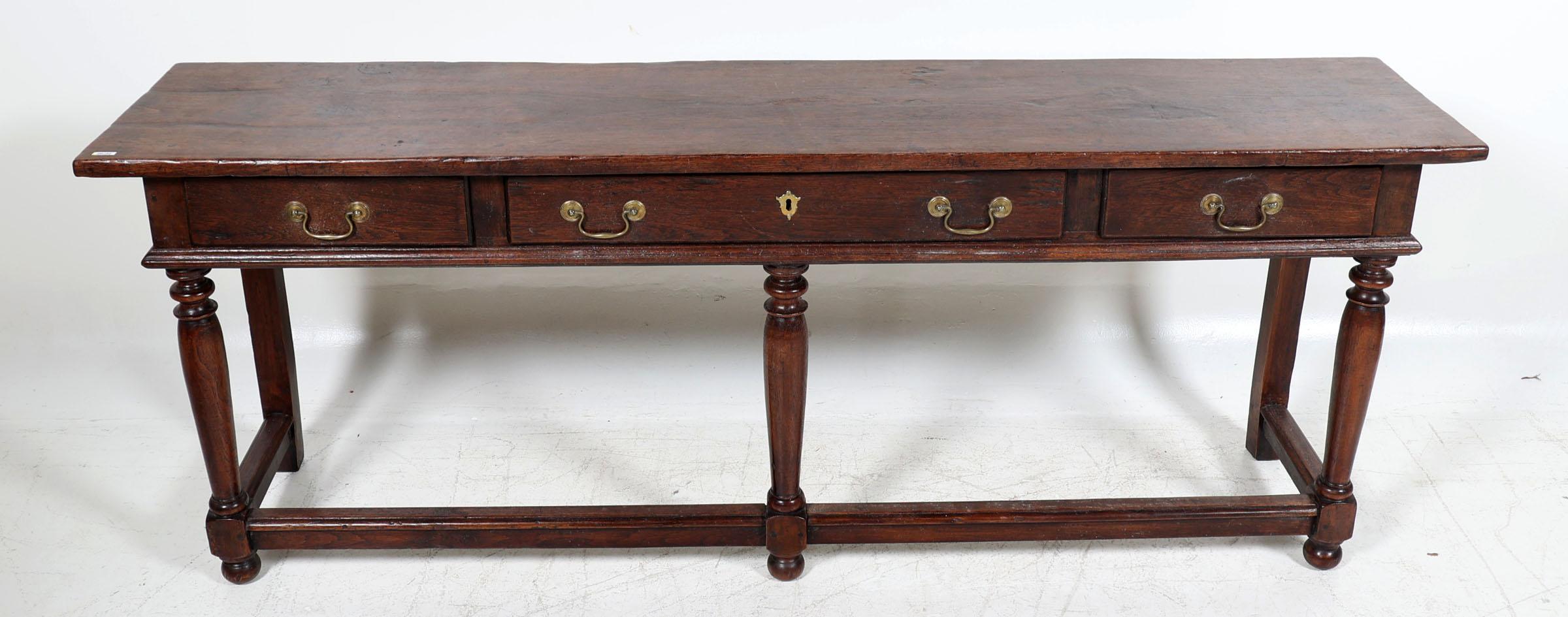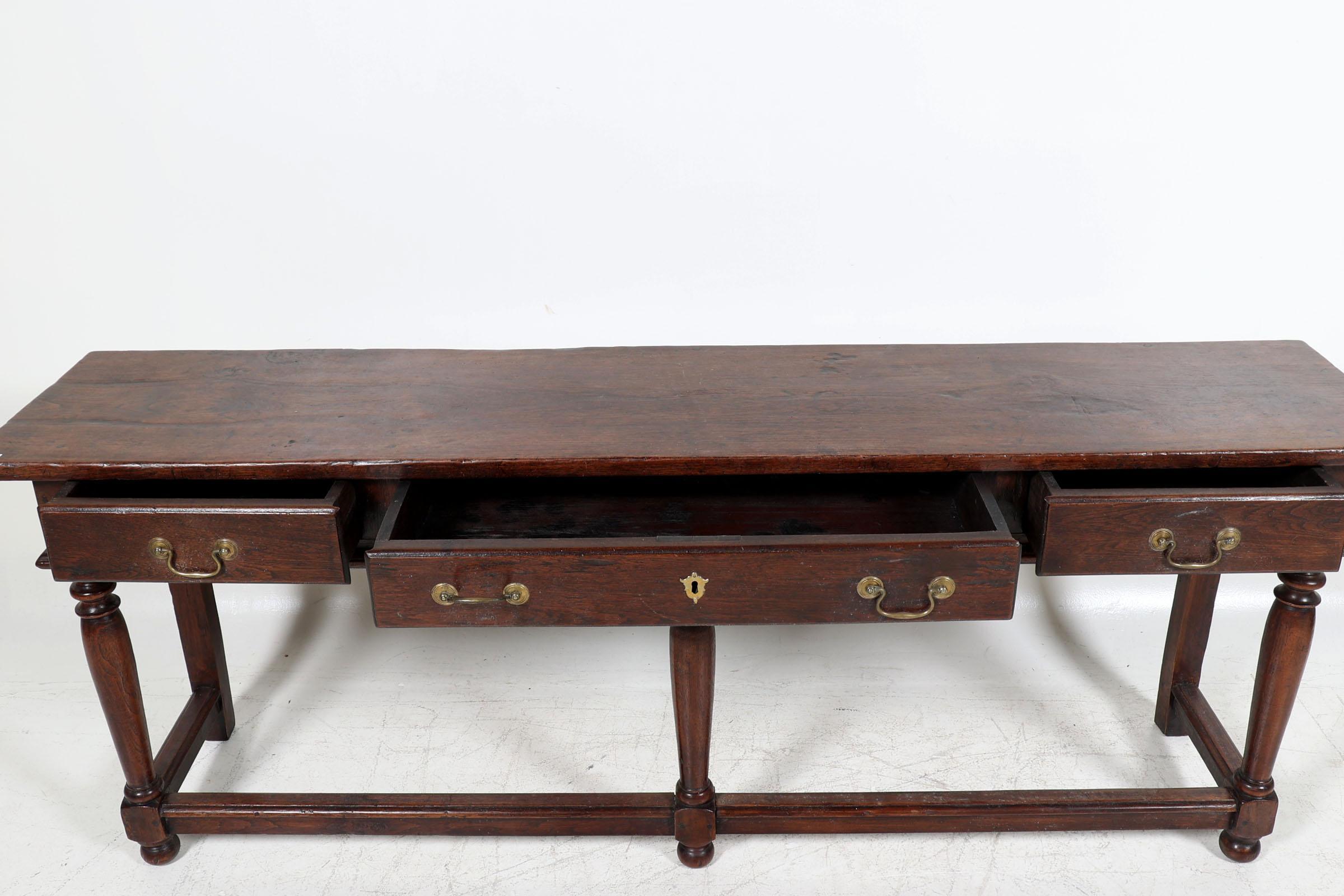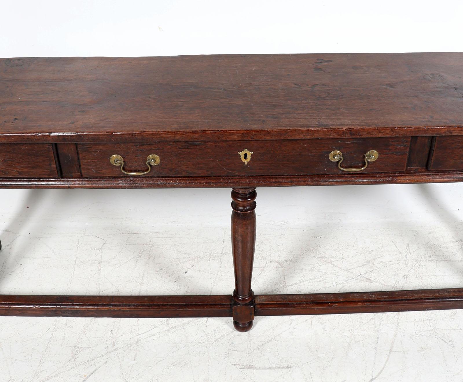 Antieke eikenhouten sidetable met 3 laden en messing handgrepen, h.77 x b.201 x d.43 cm.
