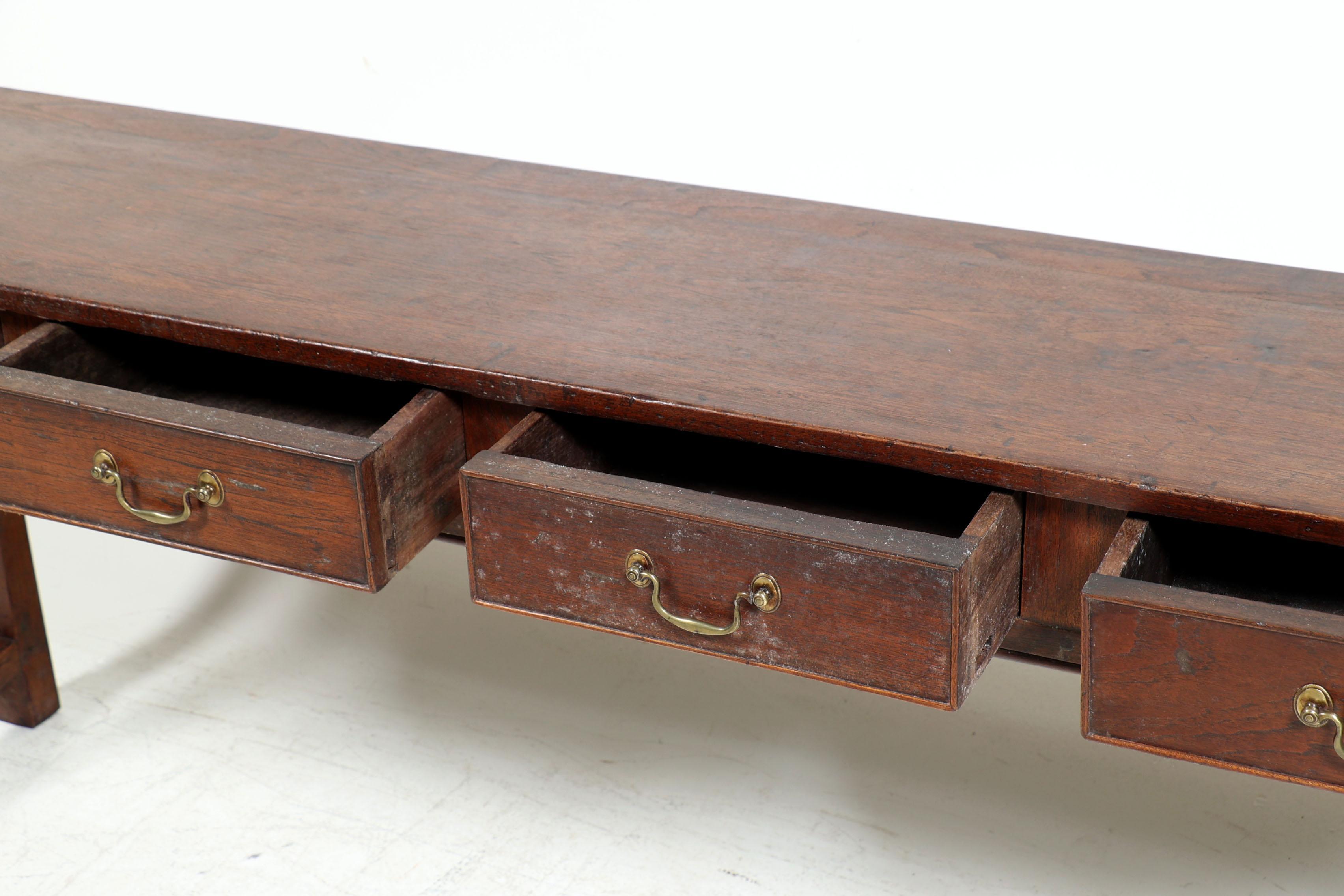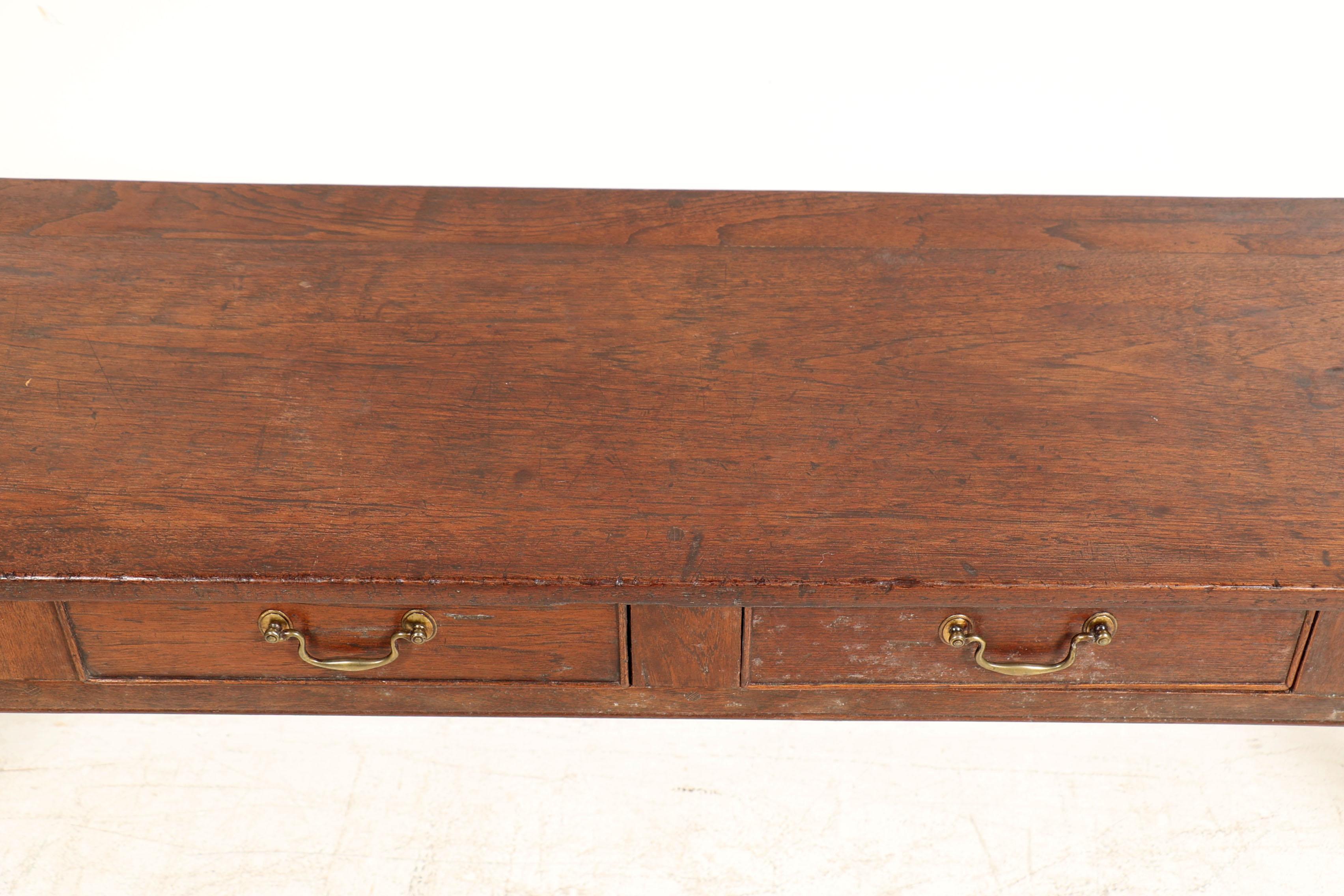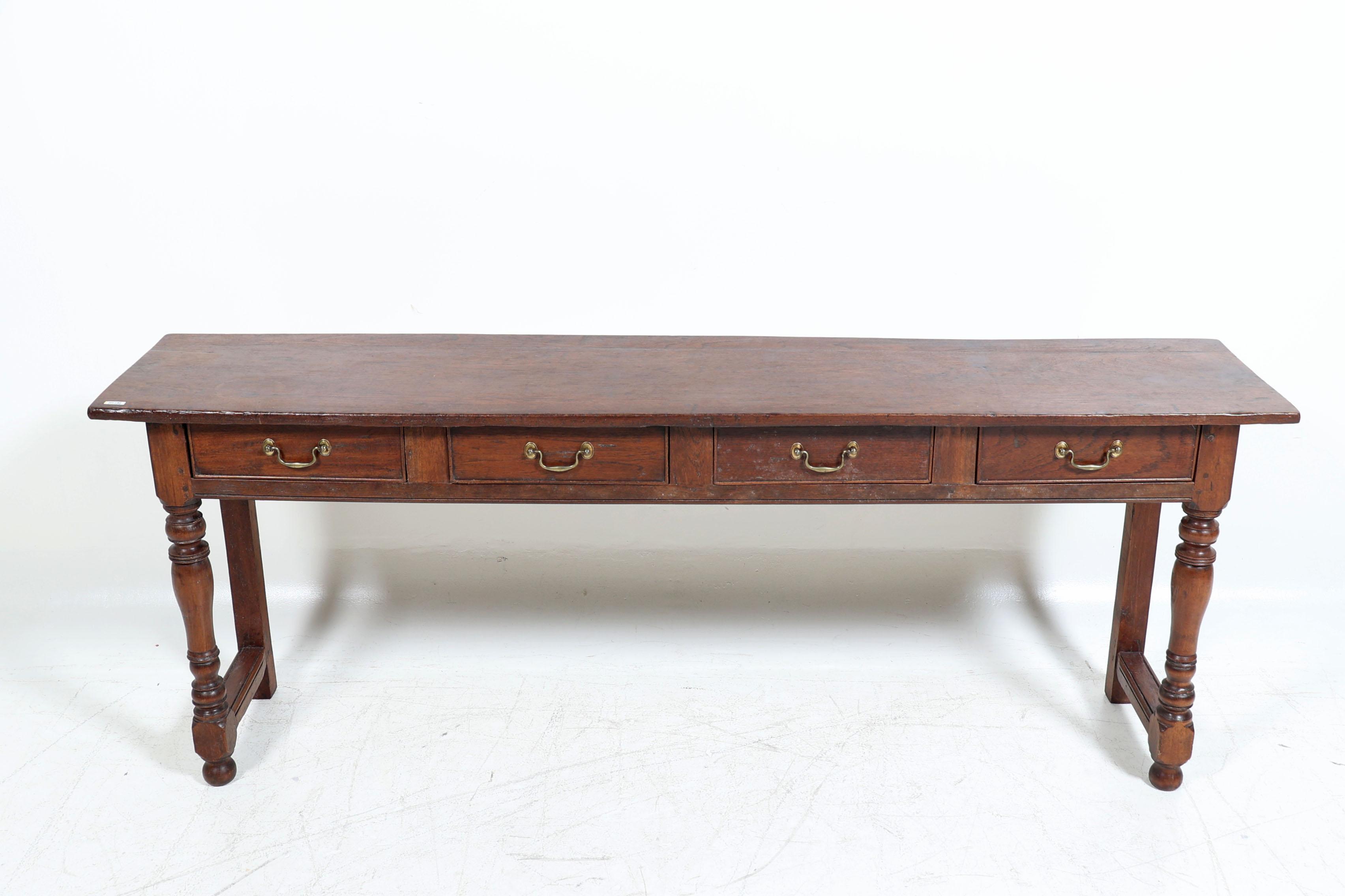 Antieke eikenhouten sidetable met 4 laden en messing handgrepen, h.75 x b.193 x d.39 cm.