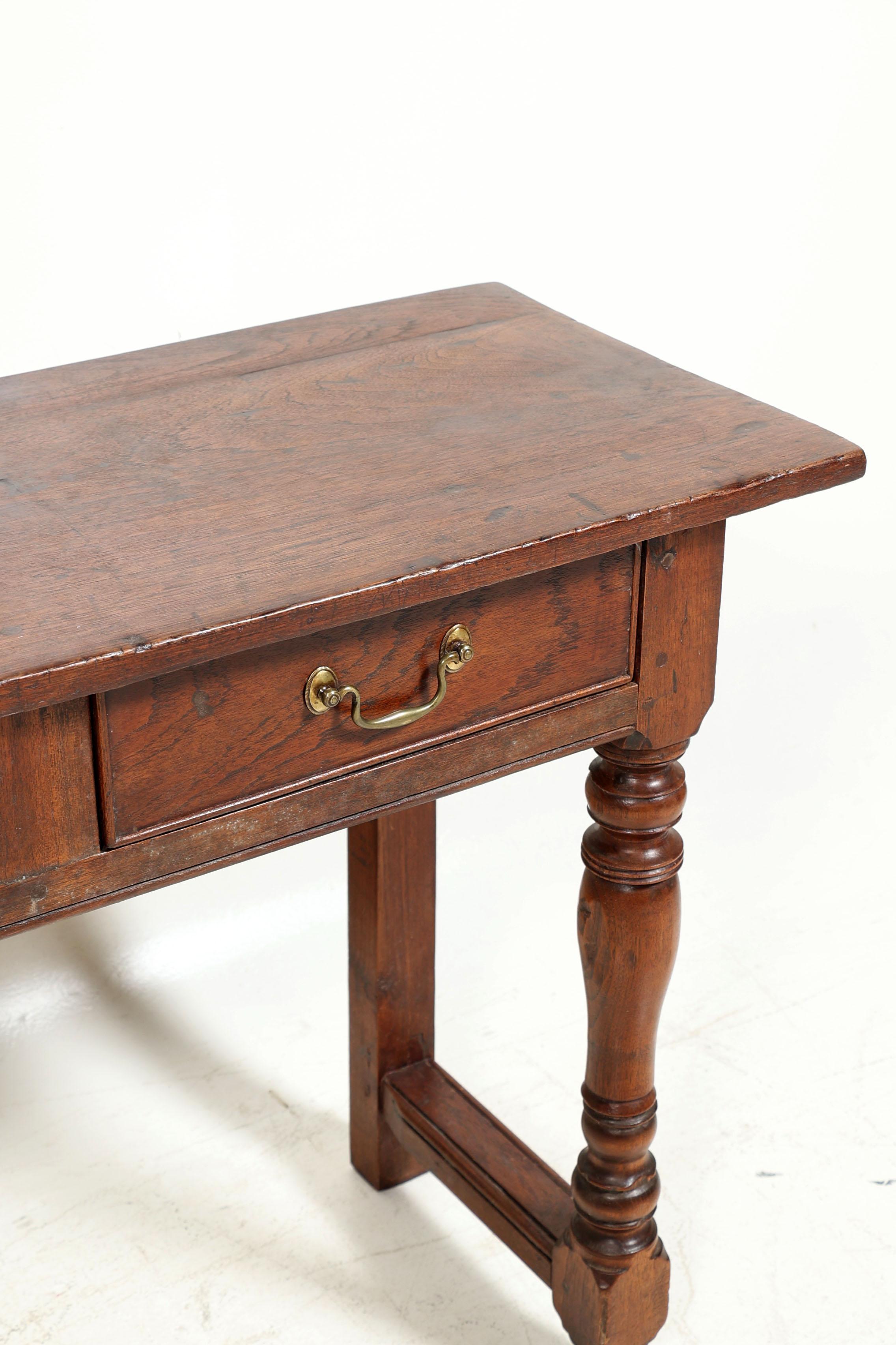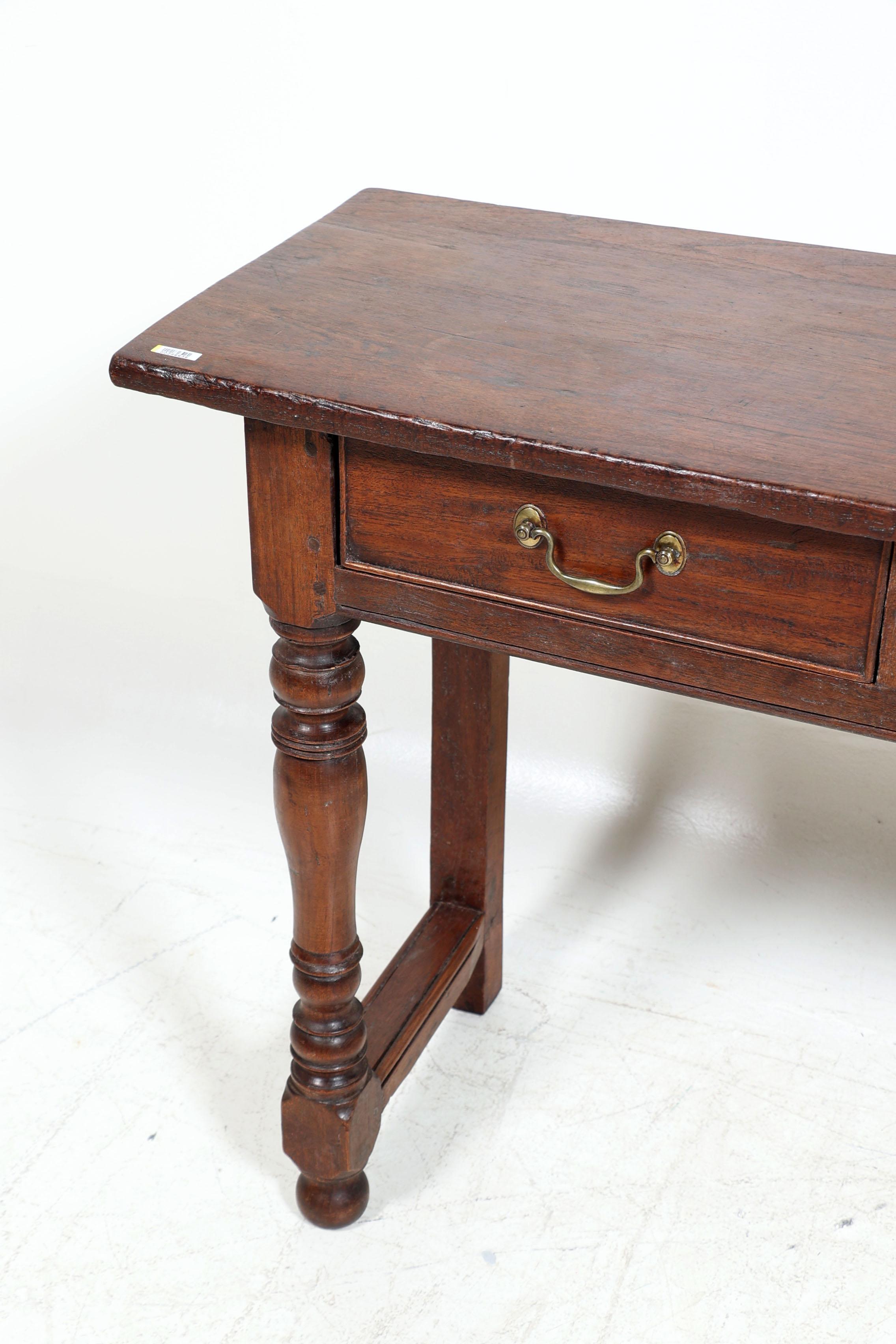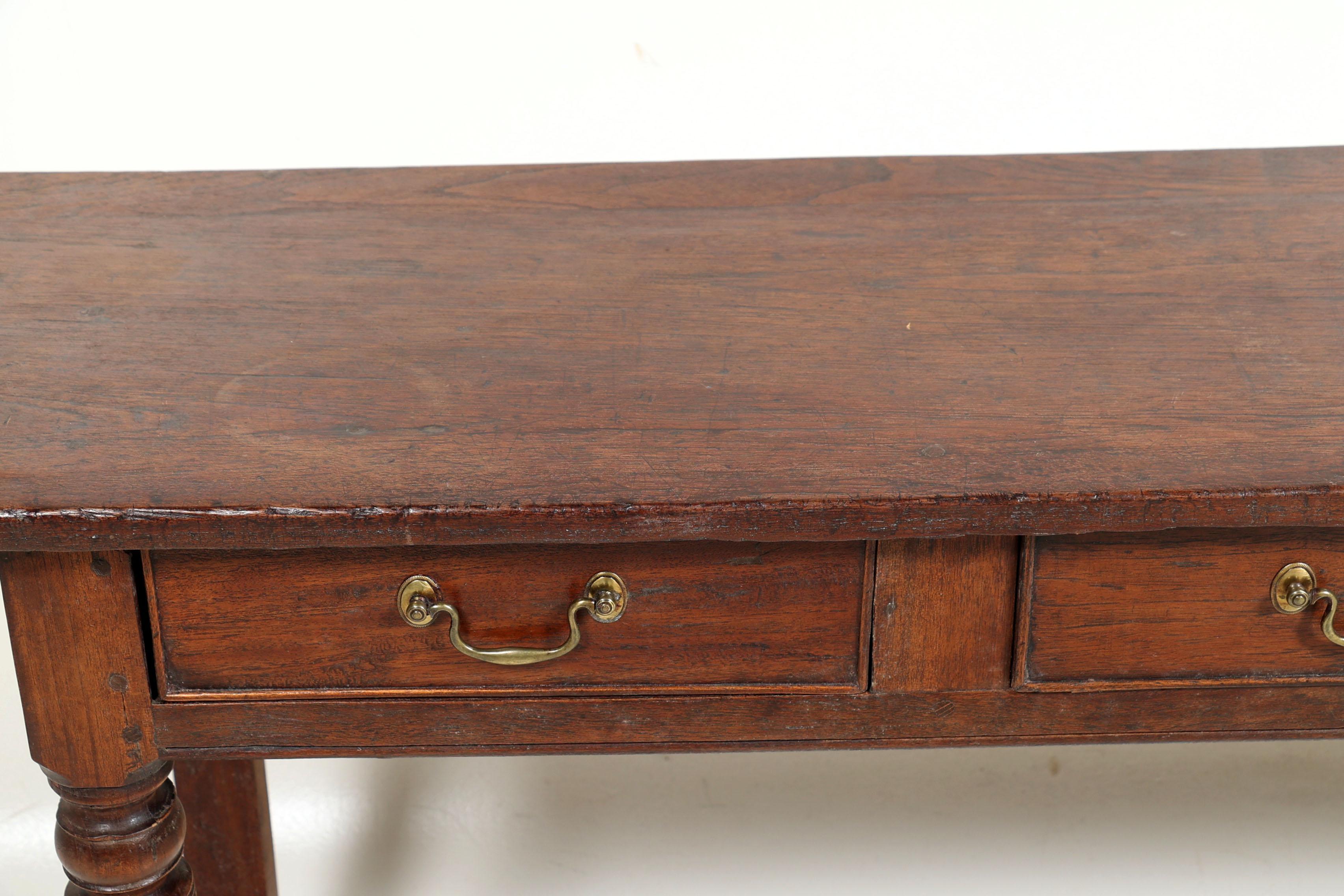Antieke eikenhouten sidetable met 4 laden en messing handgrepen, h.75 x b.193 x d.39 cm.