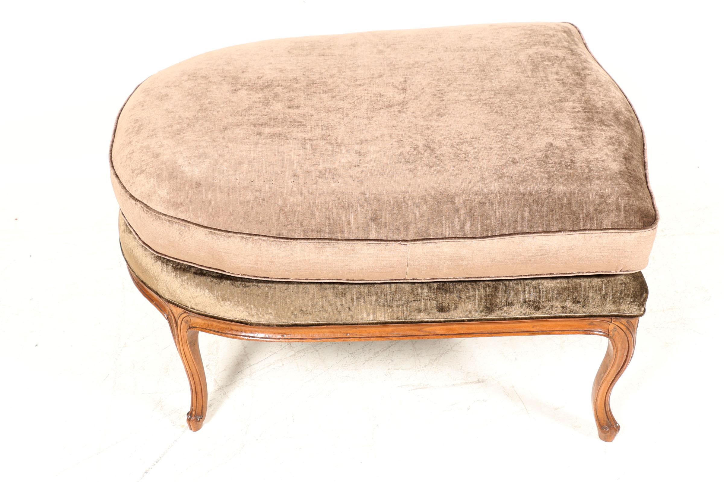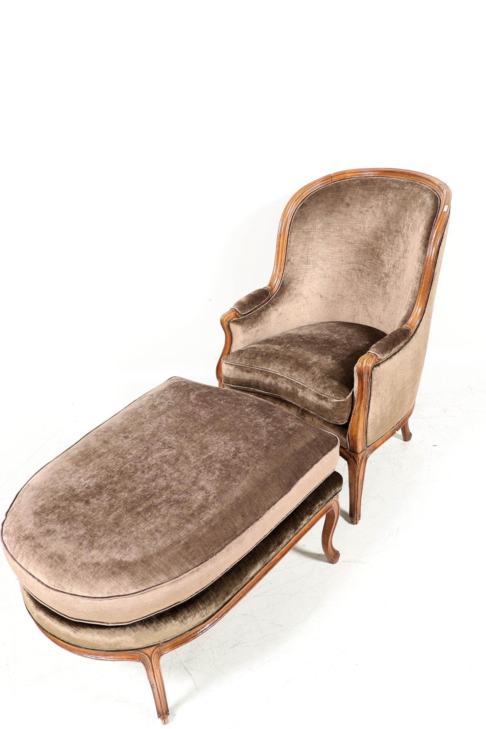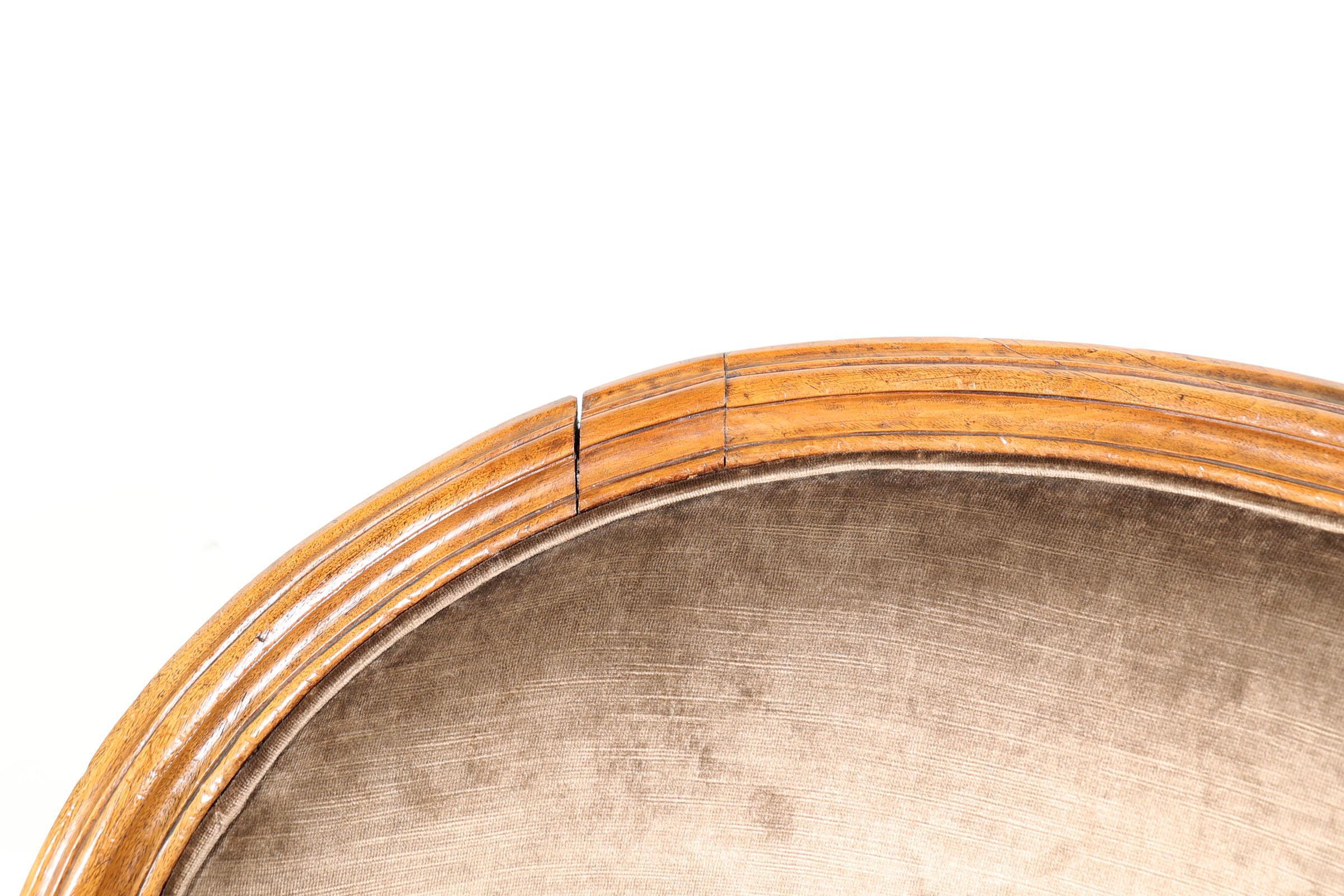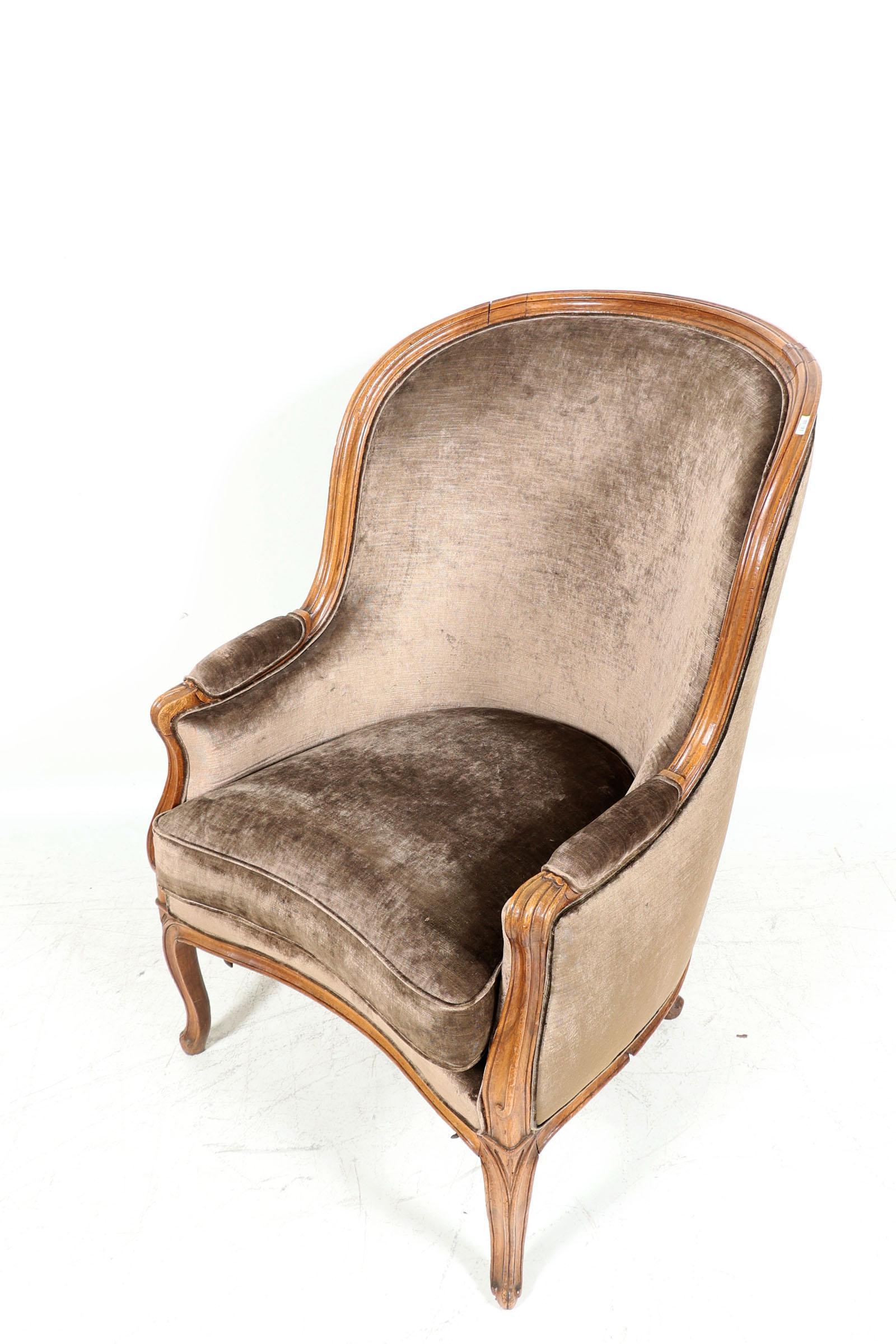 Antieke notenhouten bergère/chaise longue met bruin velours gestoffeerd, 18/19e eeuw