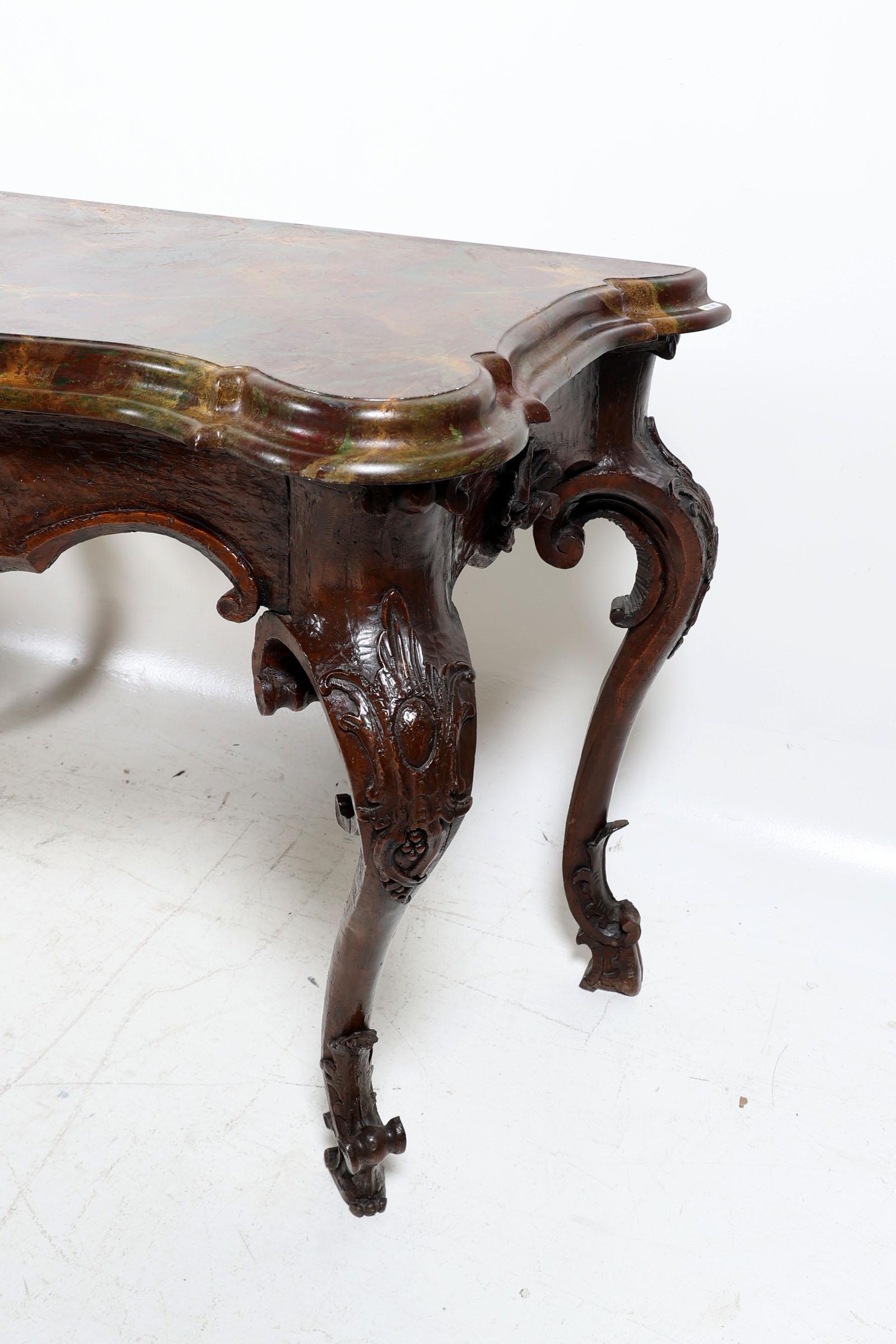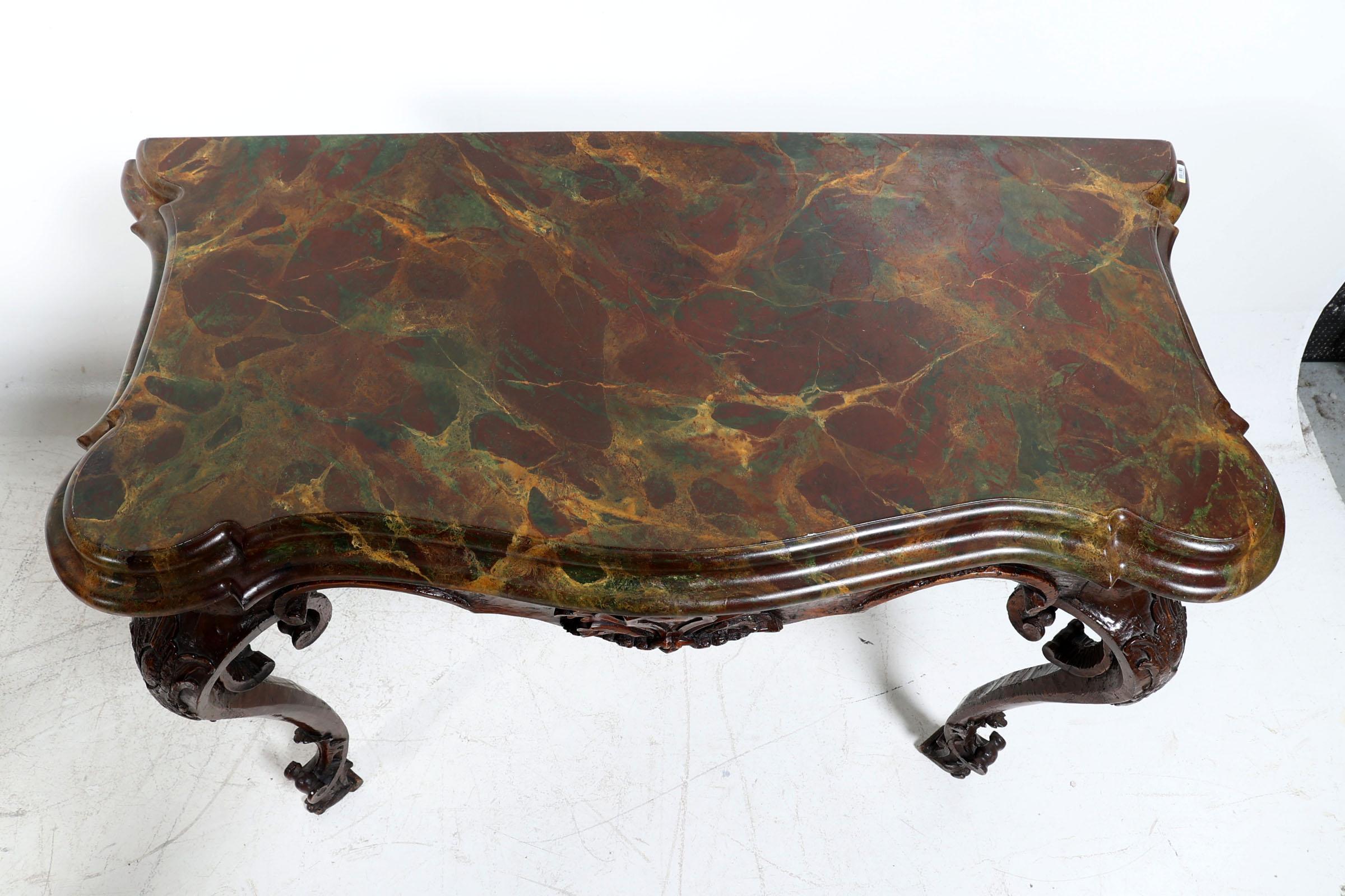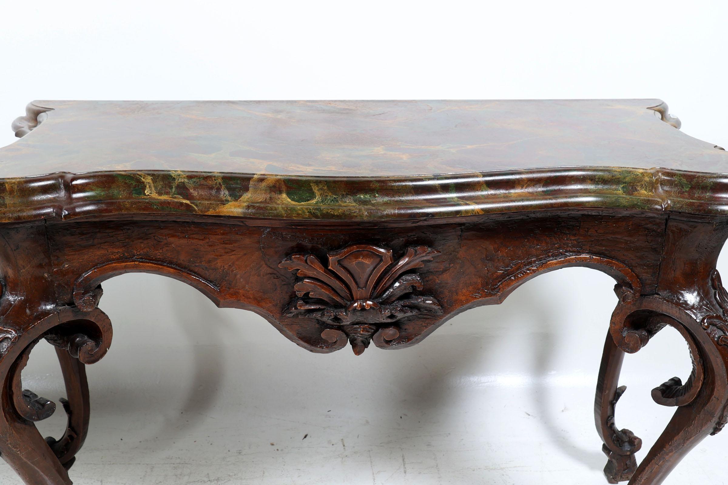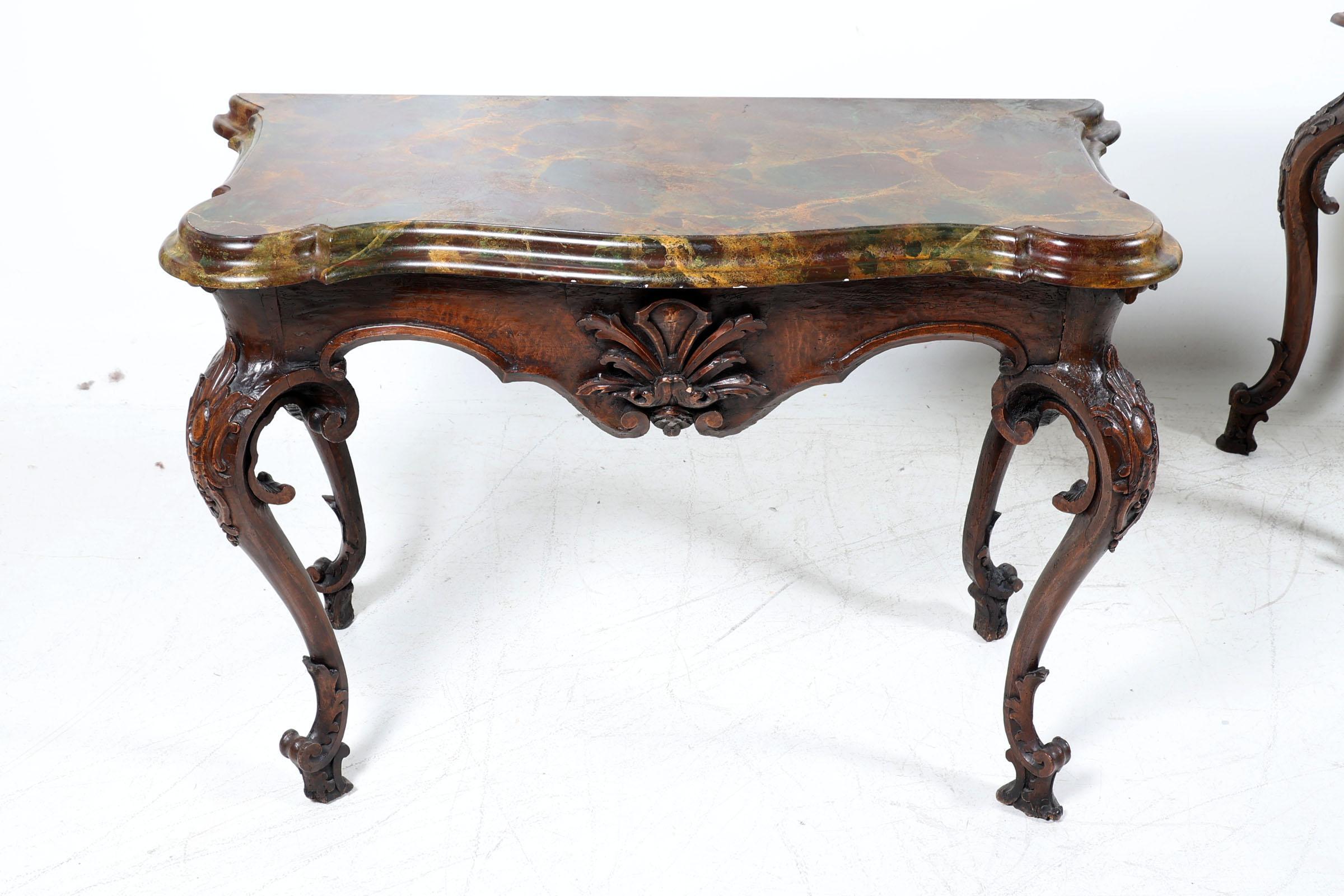 Set van 2 antieke Italiaanse gepatineerd houten console tafels rustend op gebogen poten, met gemarmerd blad van later datum, h.87 x b.128 x d.55 cm.