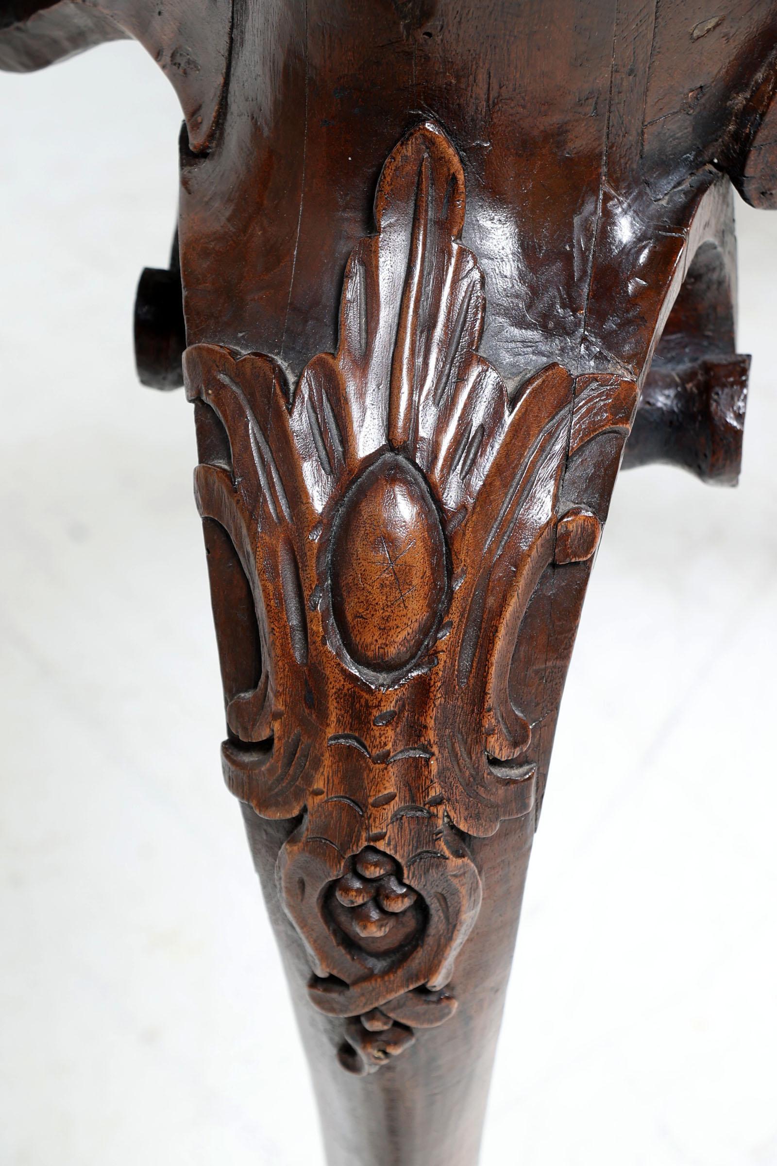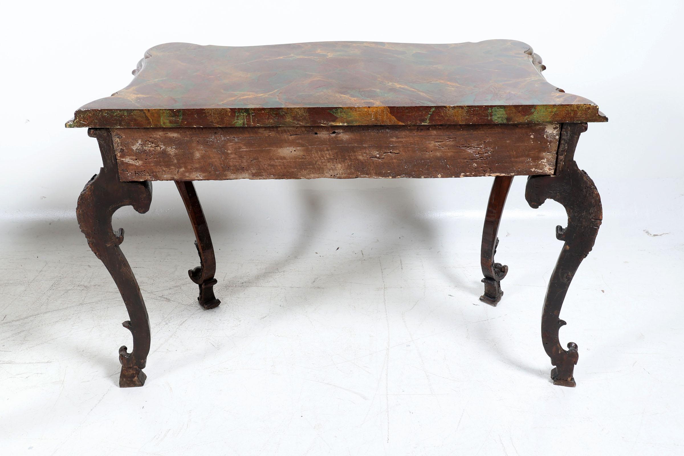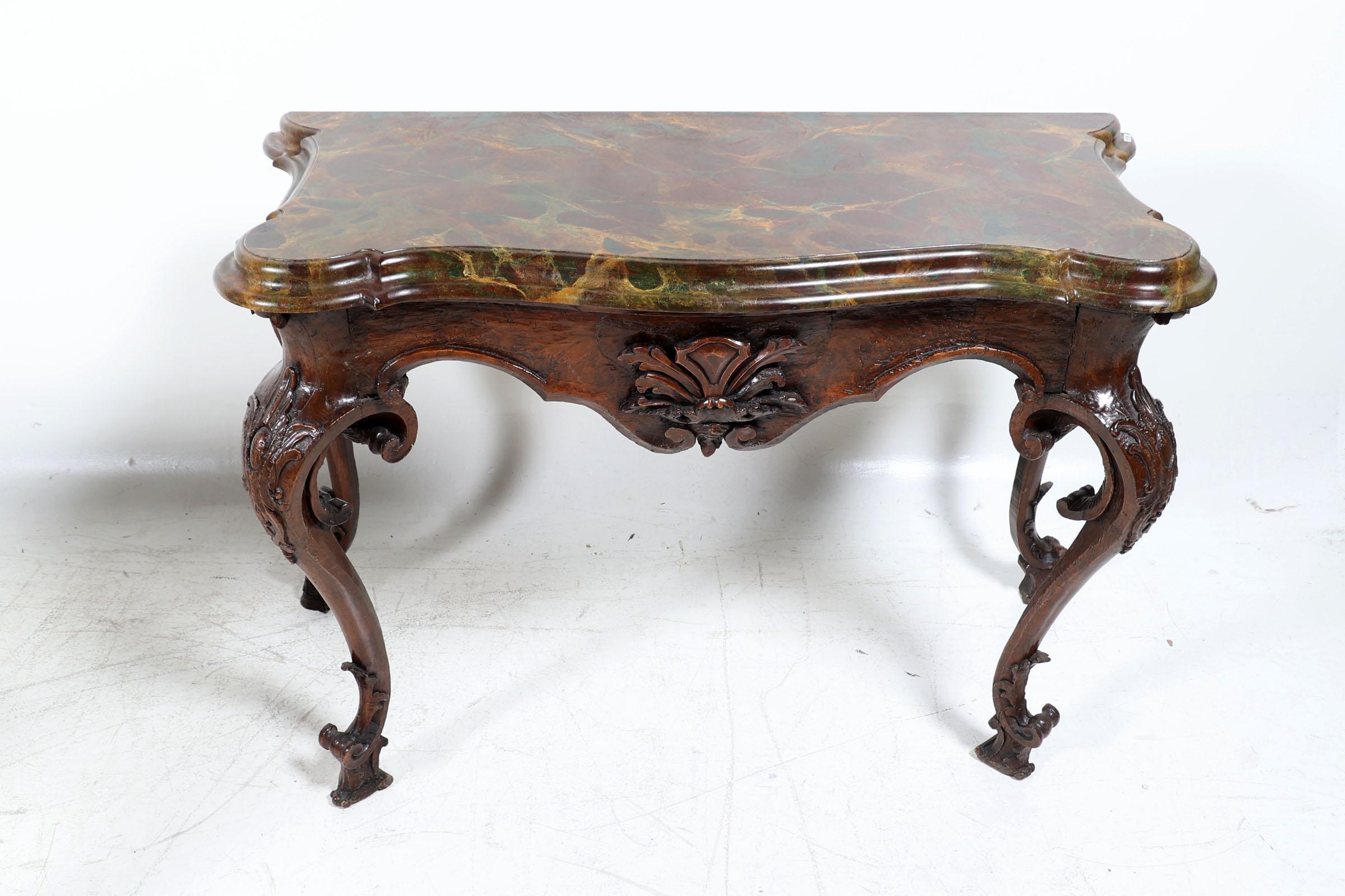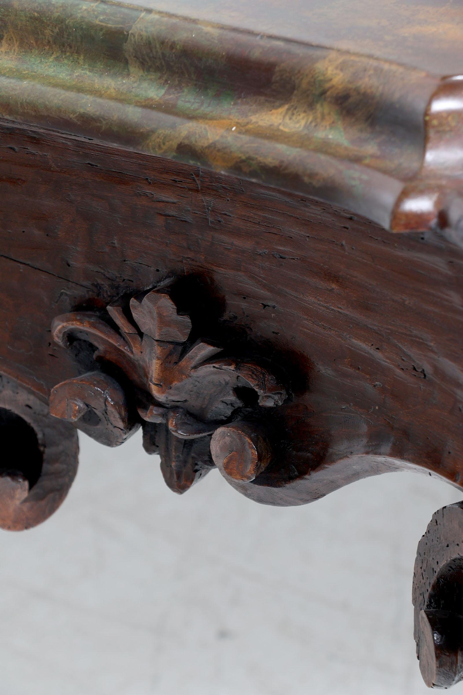 Set van 2 antieke Italiaanse gepatineerd houten console tafels rustend op gebogen poten, met gemarmerd blad van later datum, h.87 x b.128 x d.55 cm.