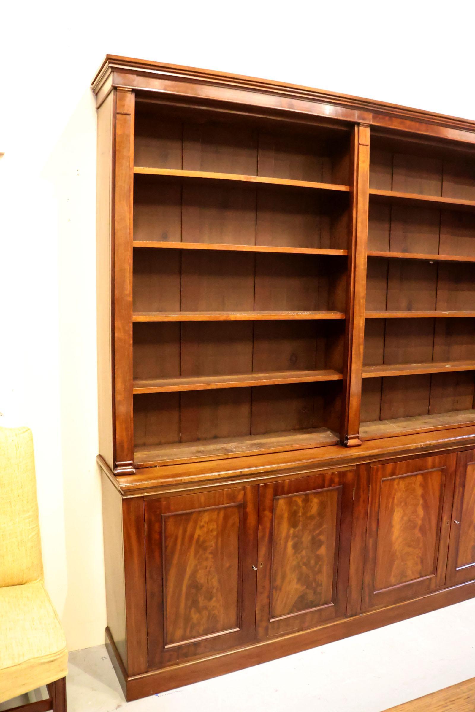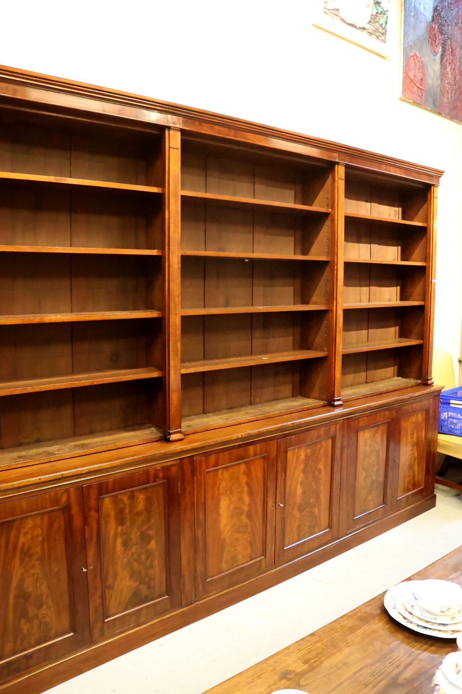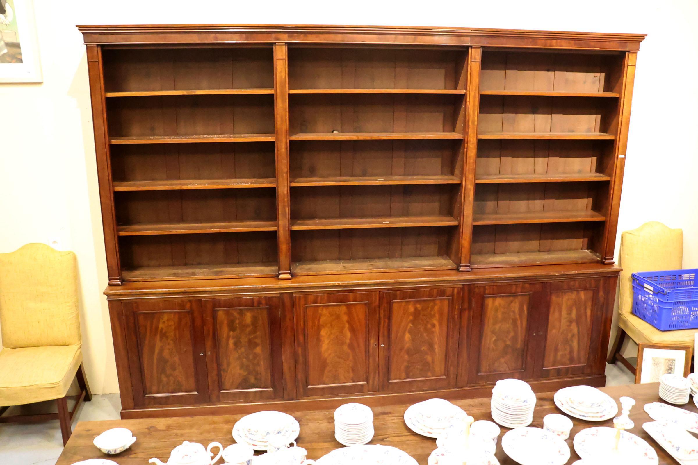 Antieke mahoniehouten boekenkast met 6 deuren in de onderkast, h.242 x b.333 x d.40 cm.